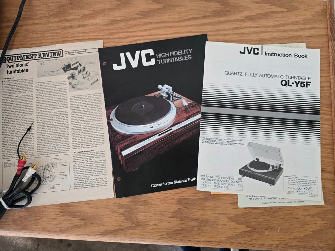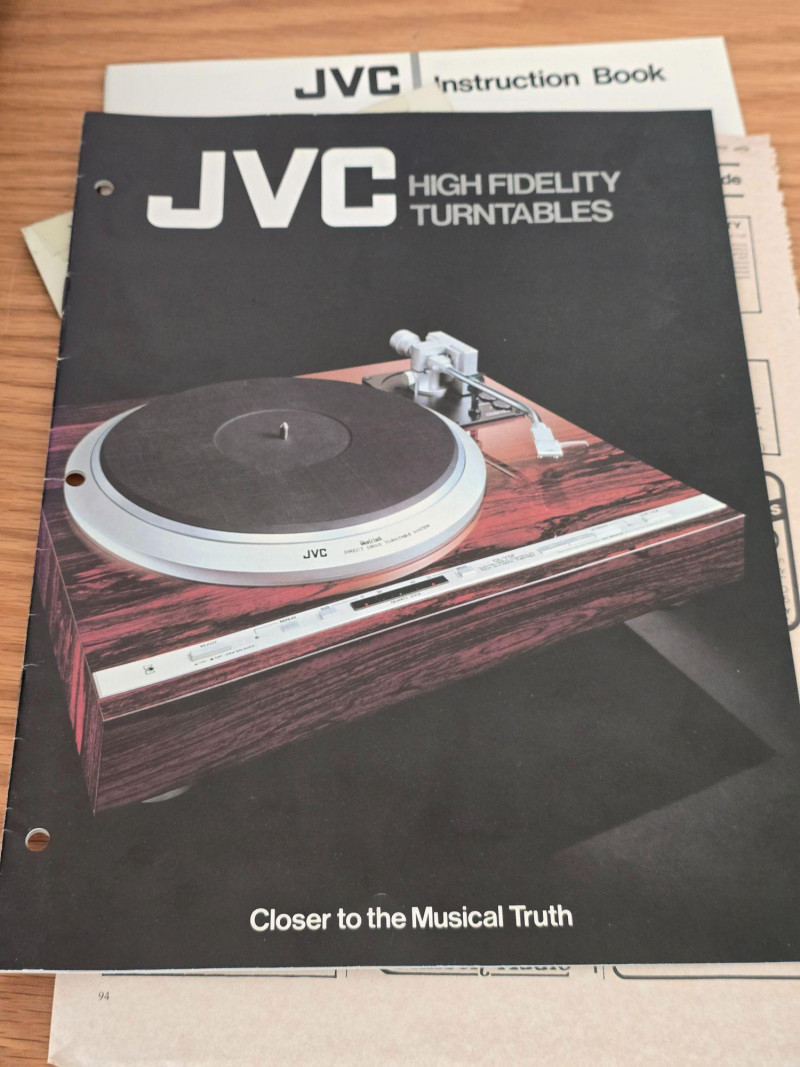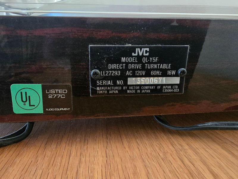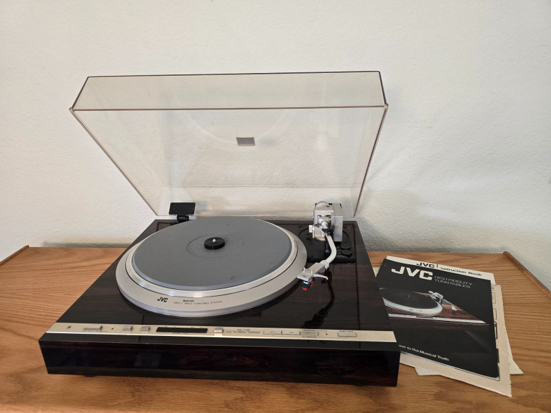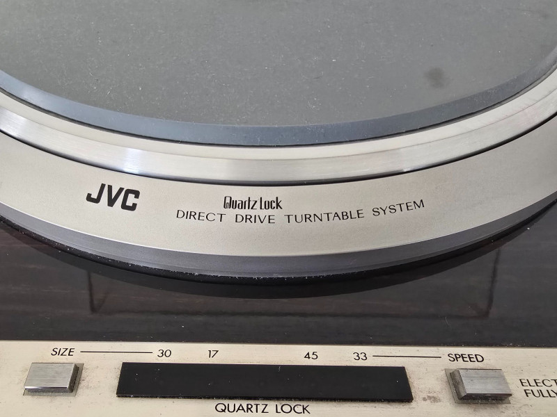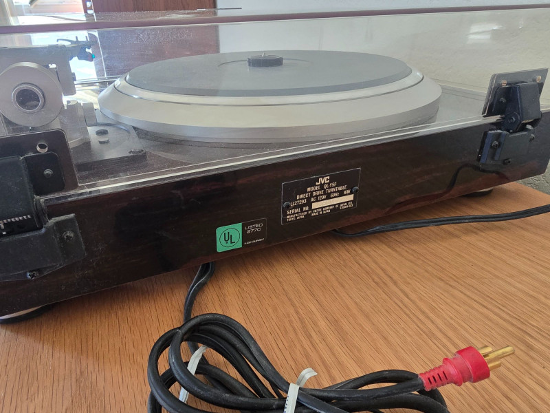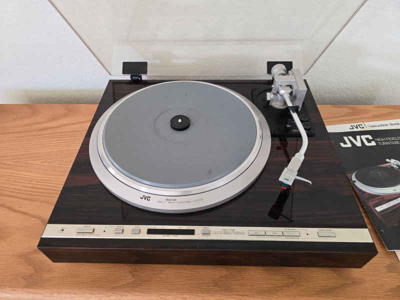 A quality JVC QL‑Y5F turntable featuring quartz‑locked direct drive and JVC’s electronically controlled dynamic‑balance tonearm. This model is well‑regarded for its speed accuracy, quiet operation, and fully automatic convenience—an excellent example of late‑era Japanese hi‑fi engineering. Quartz‑locked direct‑drive motor for precise speed stability Fully automatic operation with servo‑controlled tonearm Dynamic‑balance tonearm with electronic tracking adjustments Adjustable tracking force, anti‑skate, and cueing Vibration‑damped plinth for reduced resonance 33/45 RPM with strobe indicators and pitch controls Original JVC user manual Original marketing/promo paperwork Tested and functional Automatic start/return cycles operate smoothly Platter locks to speed quickly and holds stable rotation Light cosmetic wear consistent with age; see photos for details Dust cover shows typical surface marks but remains intact Stylus not included A sought‑after model known for precision, reliability, and collector appeal.Features