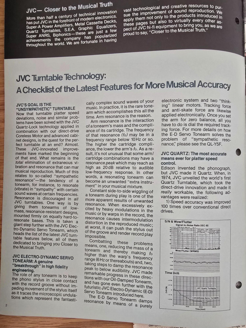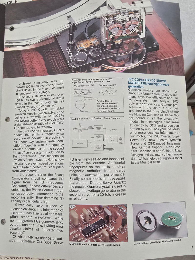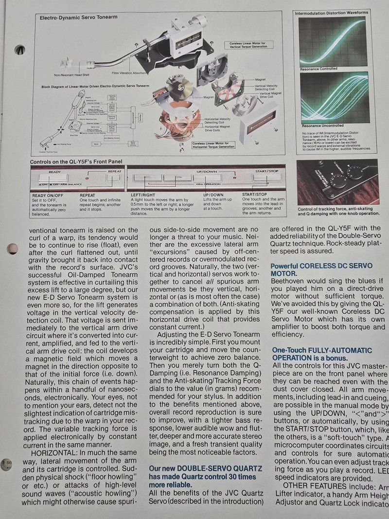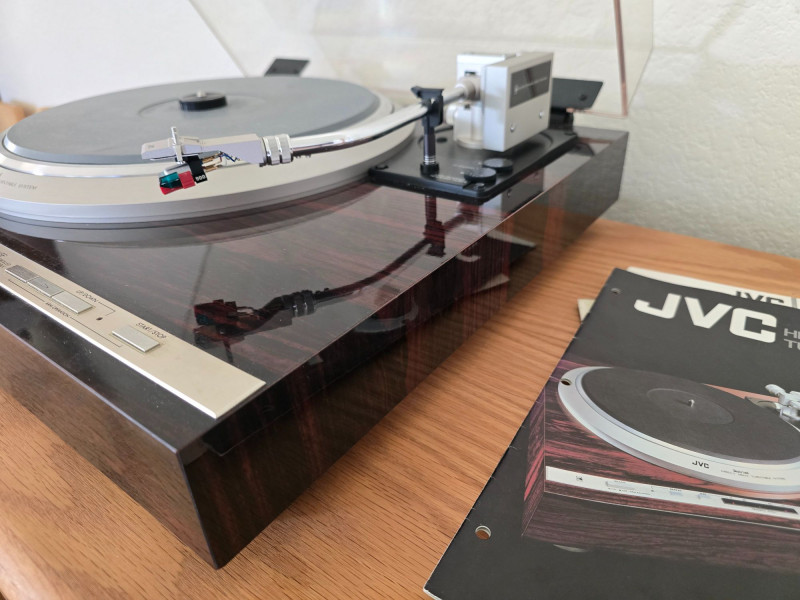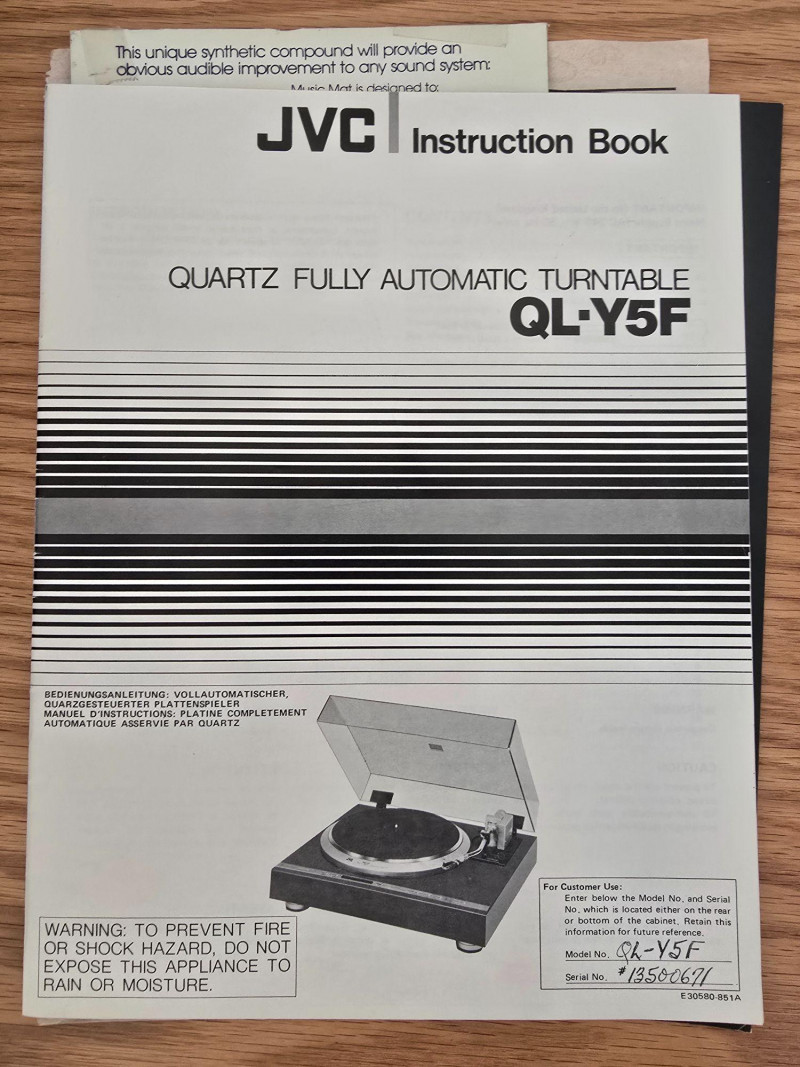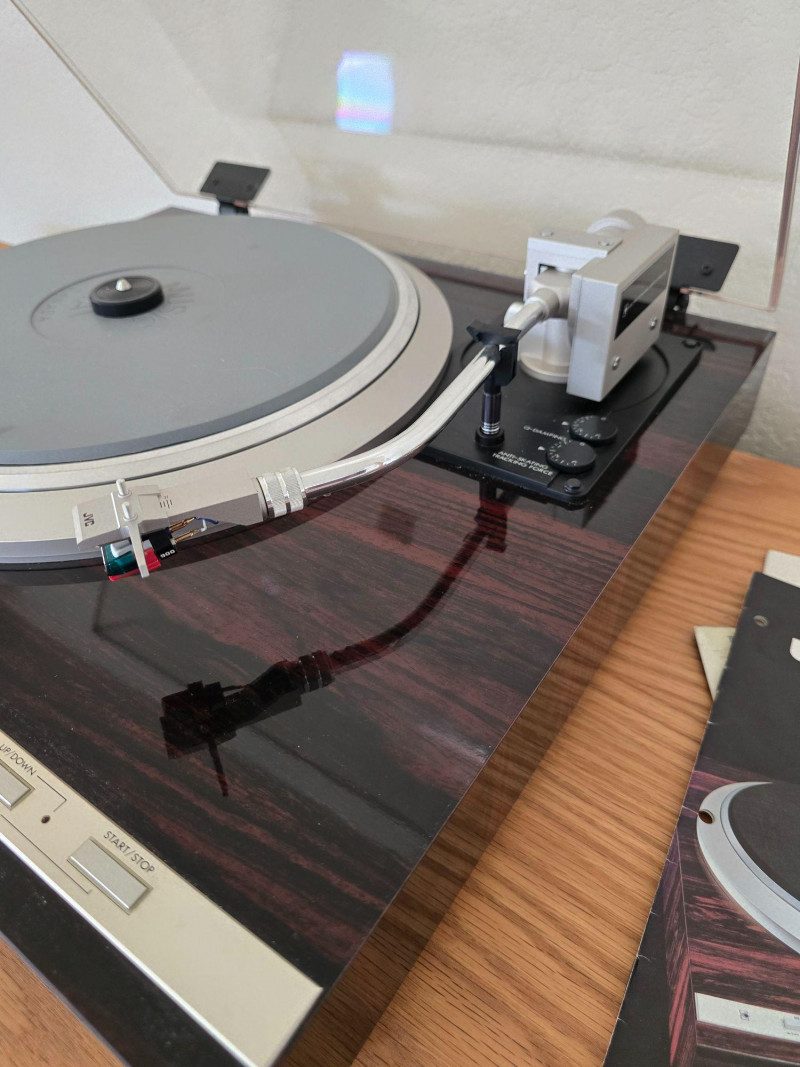 A quality JVC QL‑Y5F turntable featuring quartz‑locked direct drive and JVC’s electronically controlled dynamic‑balance tonearm. This model is well‑regarded for its speed accuracy, quiet operation, and fully automatic convenience—an excellent example of late‑era Japanese hi‑fi engineering. Quartz‑locked direct‑drive motor for precise speed stability Fully automatic operation with servo‑controlled tonearm Dynamic‑balance tonearm with electronic tracking adjustments Adjustable tracking force, anti‑skate, and cueing Vibration‑damped plinth for reduced resonance 33/45 RPM with strobe indicators and pitch controls Original JVC user manual Original marketing/promo paperwork Tested and functional Automatic start/return cycles operate smoothly Platter locks to speed quickly and holds stable rotation Light cosmetic wear consistent with age; see photos for details Dust cover shows typical surface marks but remains intact Stylus not included A sought‑after model known for precision, reliability, and collector appeal.Features