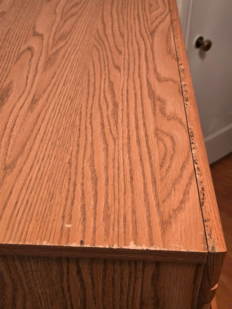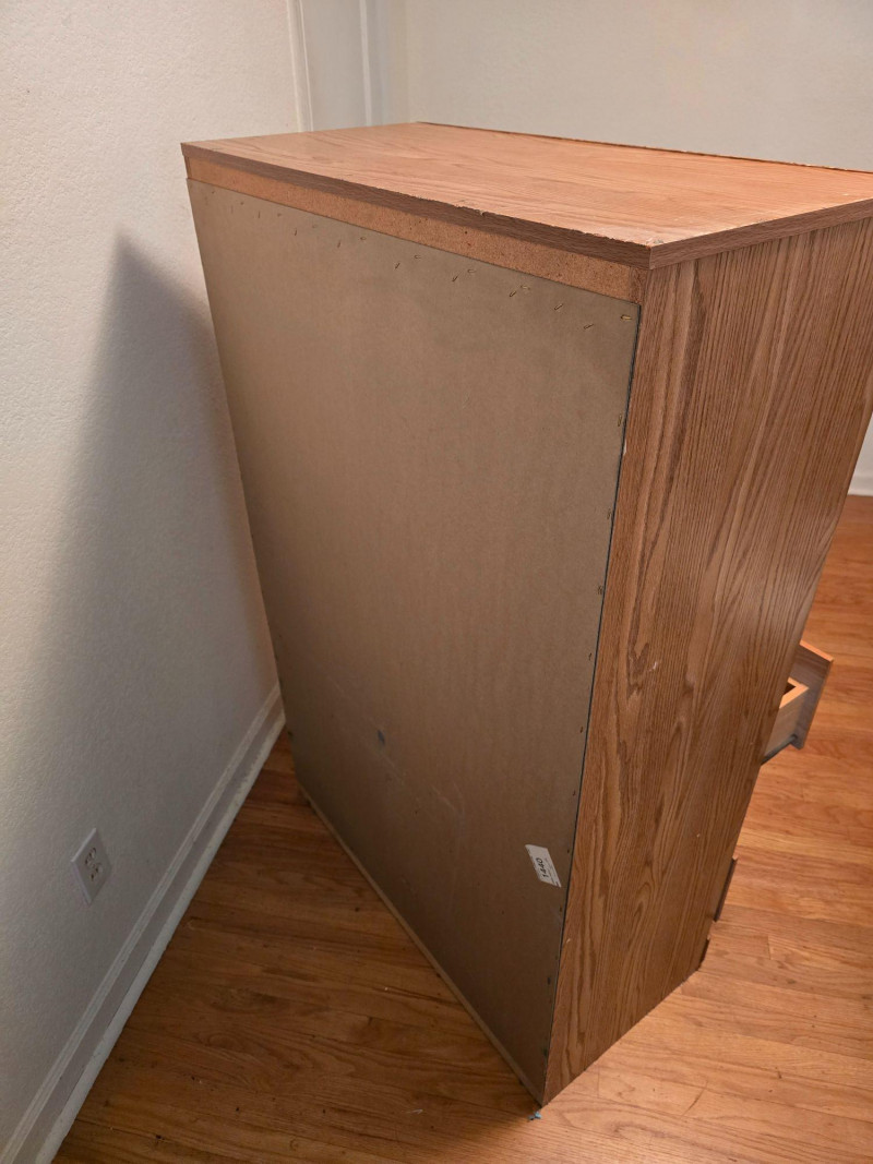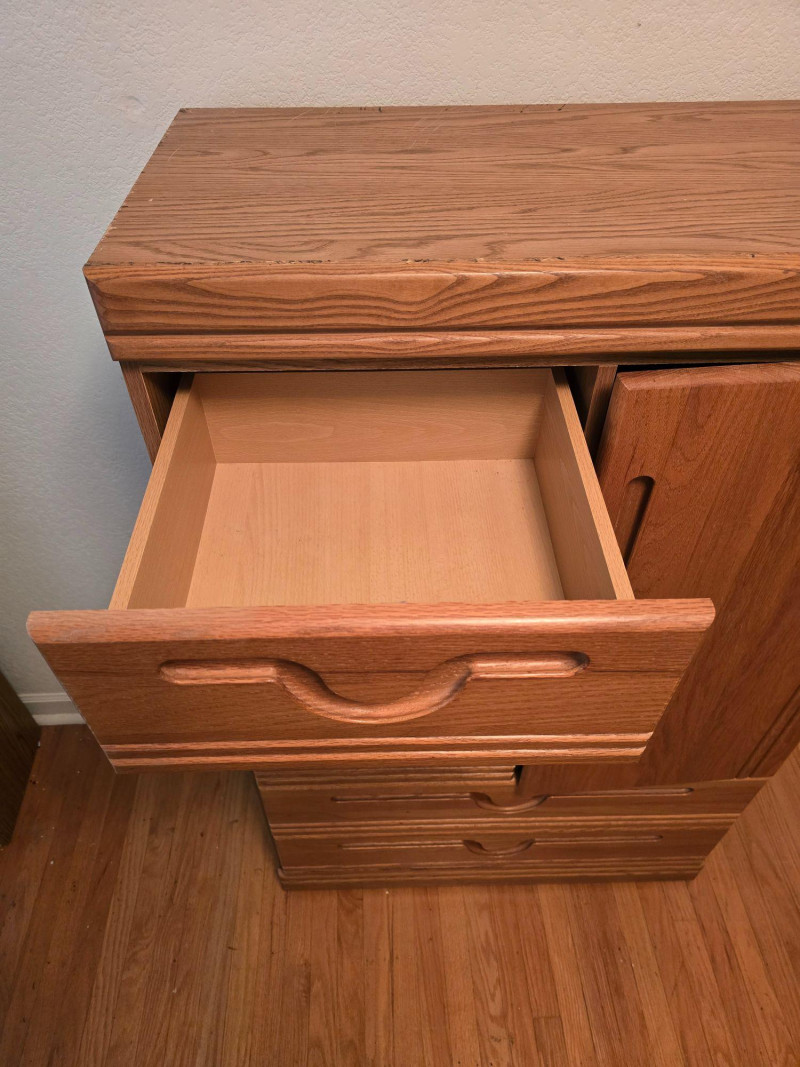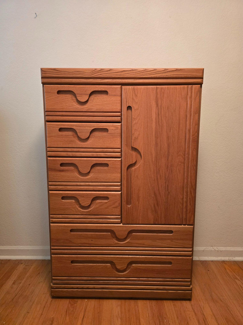 Handsome Mid‑Century Modern dresser manufactured in Canada by Dynamic Furniture Corp., offering a classic 1960s profile with warm wood tones and clean, linear casework. The piece features a versatile storage layout: two full‑length lower drawers, four smaller side drawers, and a cabinet door that opens to reveal two interior cubbies—an efficient mix of open and concealed storage suitable for bedrooms, studios, or curated MCM interiors. The top front edge shows visible wear and finish loss consistent with age, and additional light scuffs and small chips appear along the case edges. Drawer interiors are clean and functional, and the cabinet section opens smoothly. Overall, the dresser presents well with an authentic vintage patina and the understated craftsmanship characteristic of Dynamic’s mid‑century production. A solid, functional Canadian MCM piece with strong design presence and practical storage capacity.