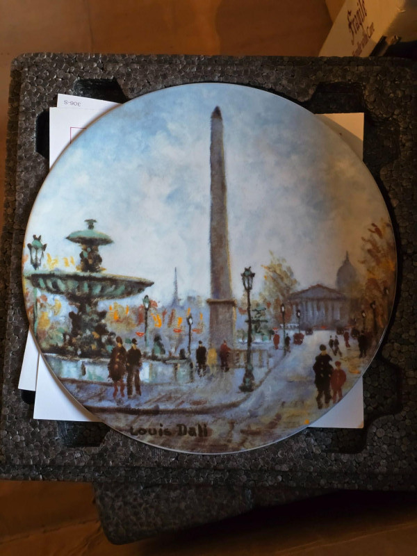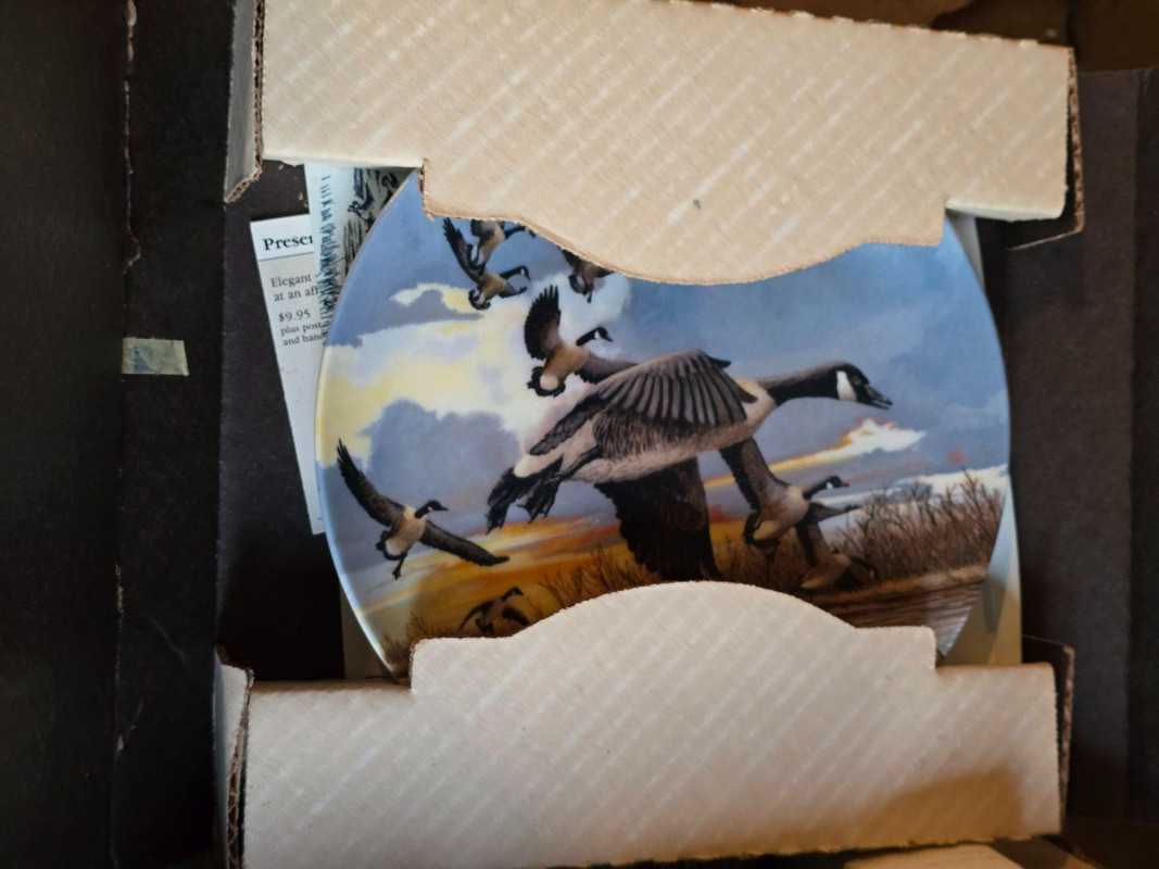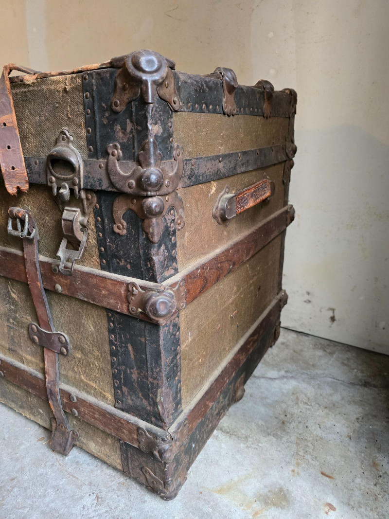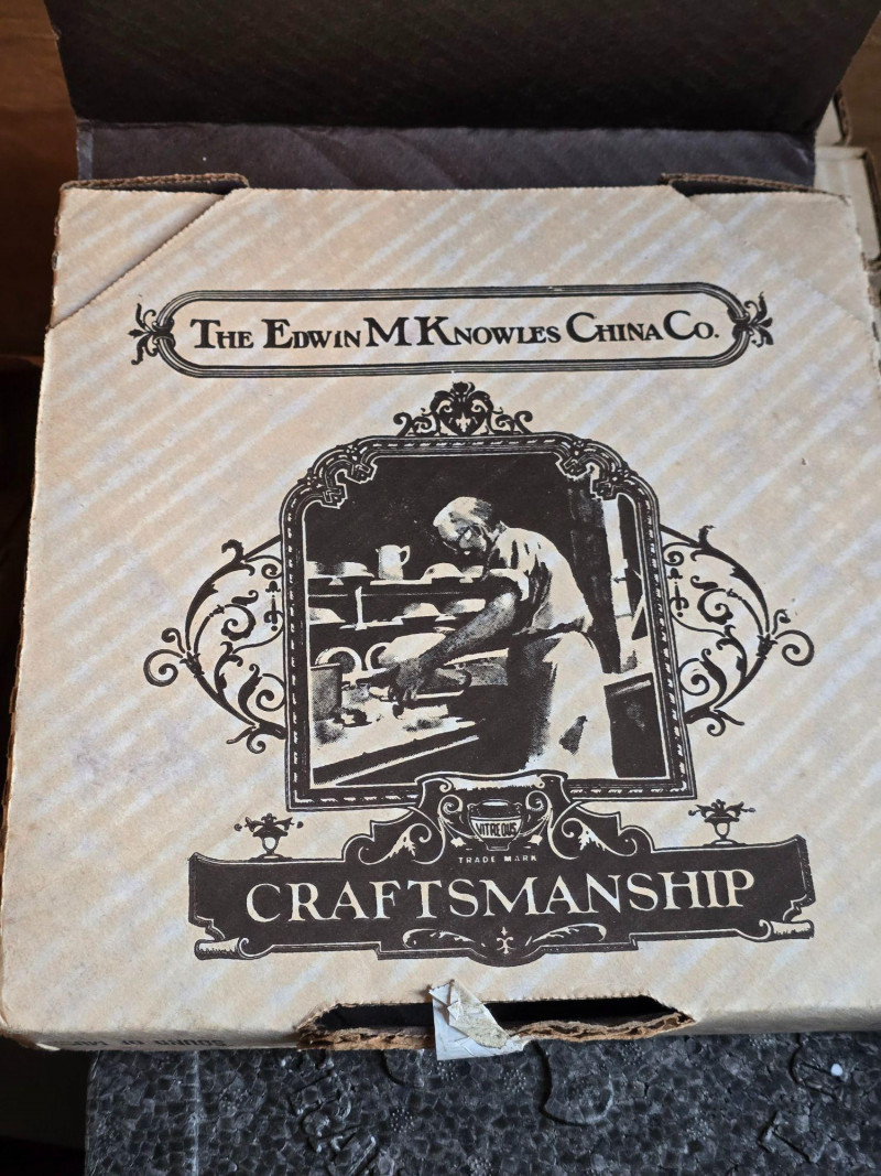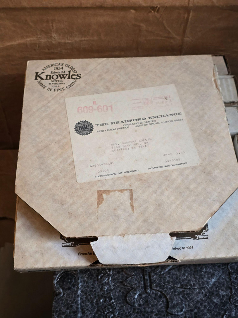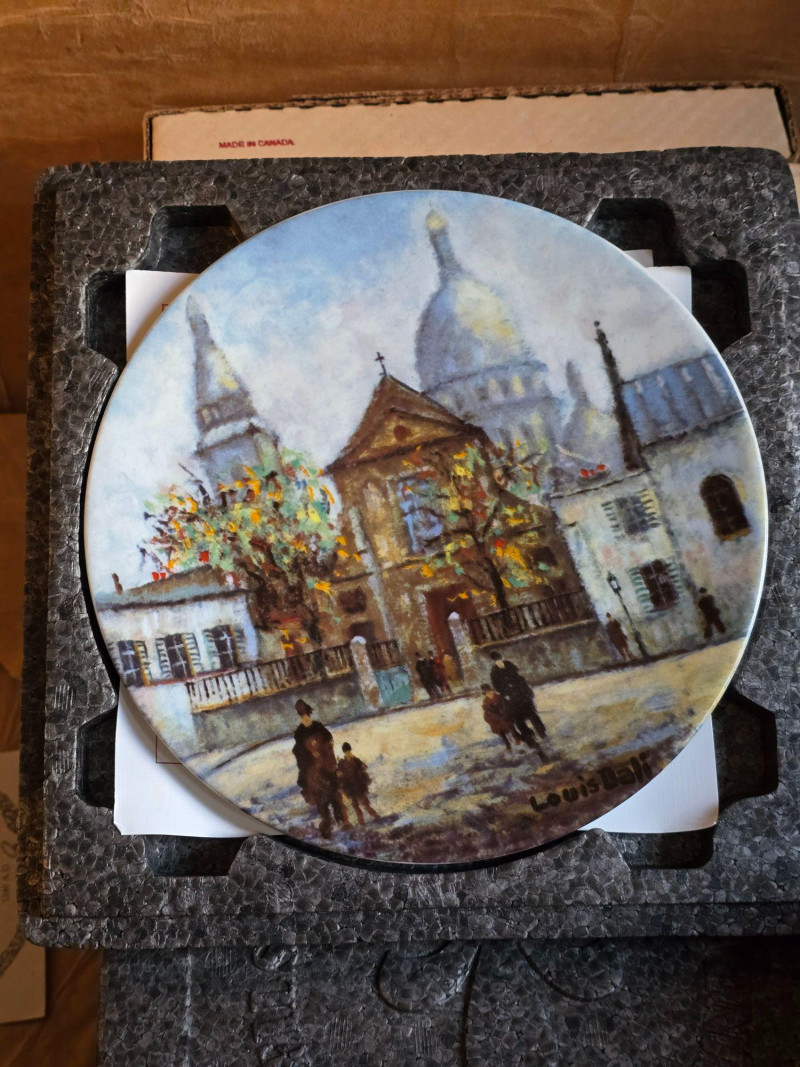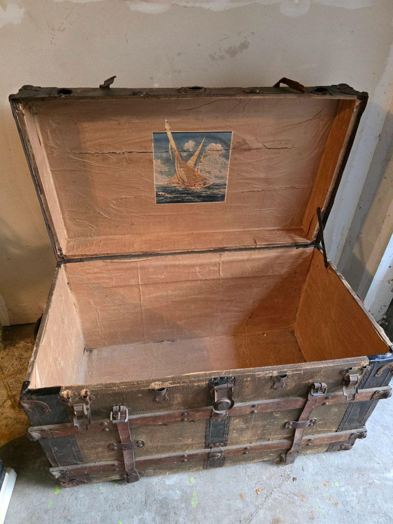 Large antique steamer trunk paired with an extensive assortment of collectible plates from multiple makers and series. The trunk features classic early‑20th‑century construction with wood panels, metal banding, and aged hardware. Interior includes a printed lithograph panel on the inside lid and original wood lining. Exterior shows expected wear from age and use, adding to its authentic vintage character. The plate collection includes boxed and unboxed decorative and commemorative plates from well‑known manufacturers such as The Edwin M. Knowles China Co., Royal Castle Fine China (Japan), Dominion Quality Hand‑Fired China, and more. Many plates remain in their original foam or cardboard packaging. Plate Collection Details (from photos): Multiple Knowles limited‑edition collector plates with original boxes and foam inserts Royal Castle Fine China Japan hand‑decorated plate (backstamp visible) Dominion Quality Genuine Hand‑Fired China boxed plate Several boxed plates featuring artwork themes such as: Paris landmarks (Eiffel Tower, Arc de Triomphe, Notre‑Dame, Place de la Concorde) Wildlife scenes (birds, geese, polar bears) Children and pastoral scenes Holiday or festive illustrations Stained‑glass‑style artwork Many plates appear to be part of themed or numbered series A mix of porcelain and ceramic pieces Several plates remain in protective foam or cardboard sleeves Trunk Features: Wood body with metal banding and hardware Hinged lid with interior printed panel Side handles Original patina with age‑appropriate wear Solid structure with vintage appeal Condition: