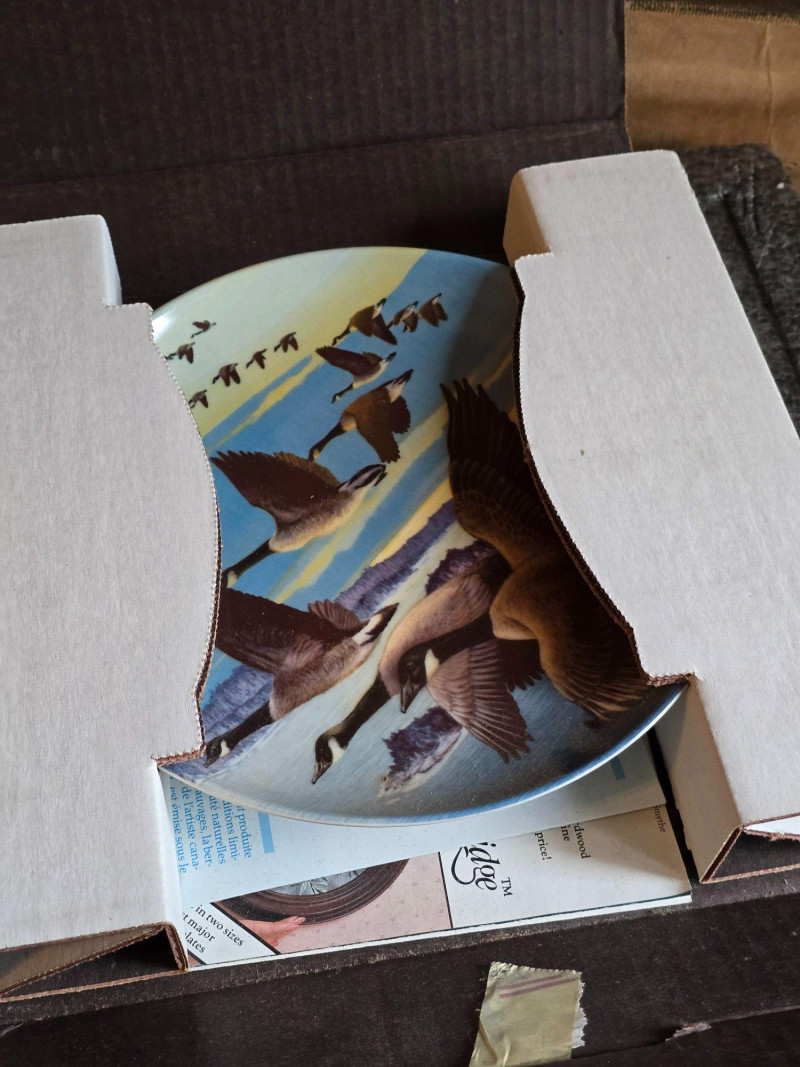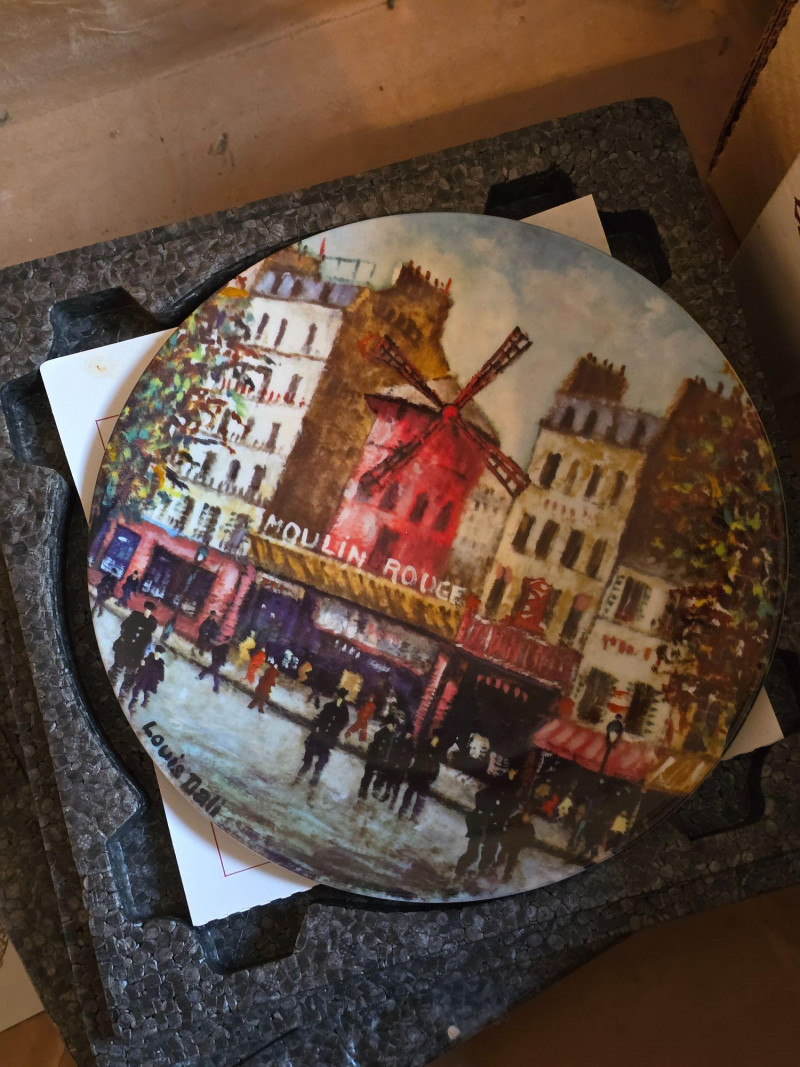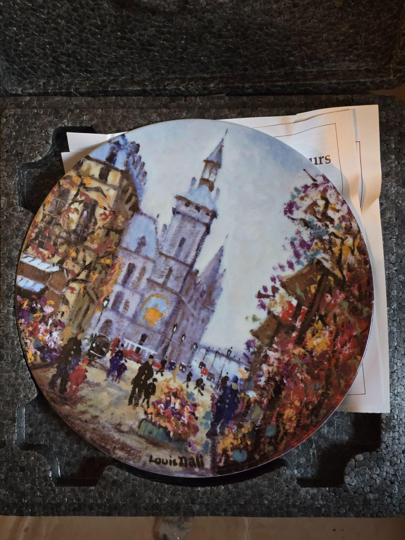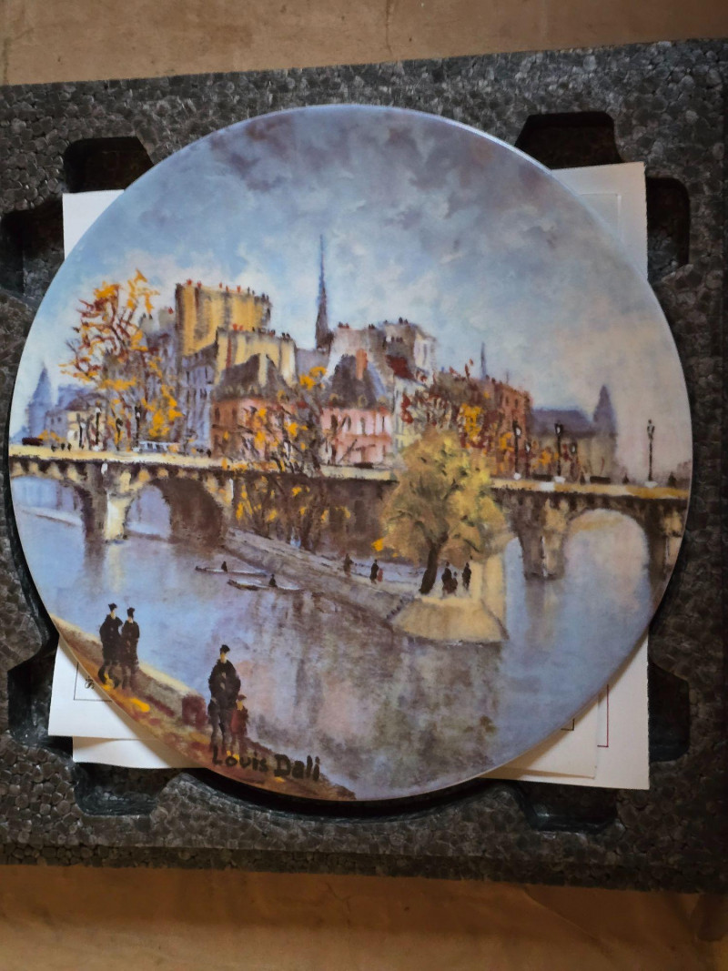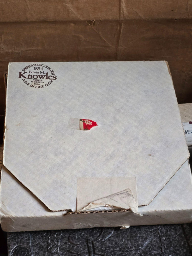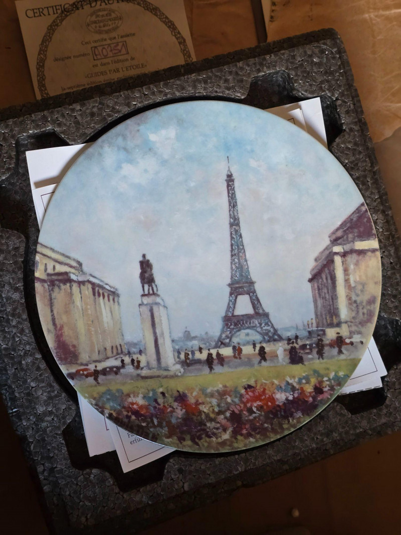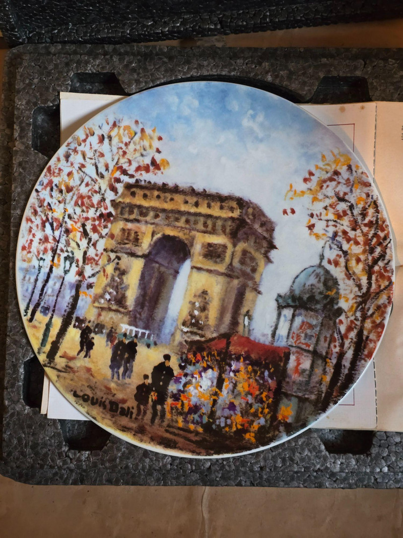 Large antique steamer trunk paired with an extensive assortment of collectible plates from multiple makers and series. The trunk features classic early‑20th‑century construction with wood panels, metal banding, and aged hardware. Interior includes a printed lithograph panel on the inside lid and original wood lining. Exterior shows expected wear from age and use, adding to its authentic vintage character. The plate collection includes boxed and unboxed decorative and commemorative plates from well‑known manufacturers such as The Edwin M. Knowles China Co., Royal Castle Fine China (Japan), Dominion Quality Hand‑Fired China, and more. Many plates remain in their original foam or cardboard packaging. Plate Collection Details (from photos): Multiple Knowles limited‑edition collector plates with original boxes and foam inserts Royal Castle Fine China Japan hand‑decorated plate (backstamp visible) Dominion Quality Genuine Hand‑Fired China boxed plate Several boxed plates featuring artwork themes such as: Paris landmarks (Eiffel Tower, Arc de Triomphe, Notre‑Dame, Place de la Concorde) Wildlife scenes (birds, geese, polar bears) Children and pastoral scenes Holiday or festive illustrations Stained‑glass‑style artwork Many plates appear to be part of themed or numbered series A mix of porcelain and ceramic pieces Several plates remain in protective foam or cardboard sleeves Trunk Features: Wood body with metal banding and hardware Hinged lid with interior printed panel Side handles Original patina with age‑appropriate wear Solid structure with vintage appeal Condition: