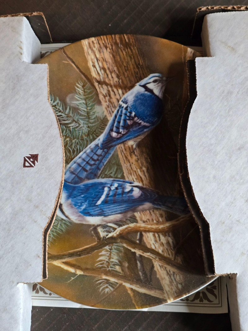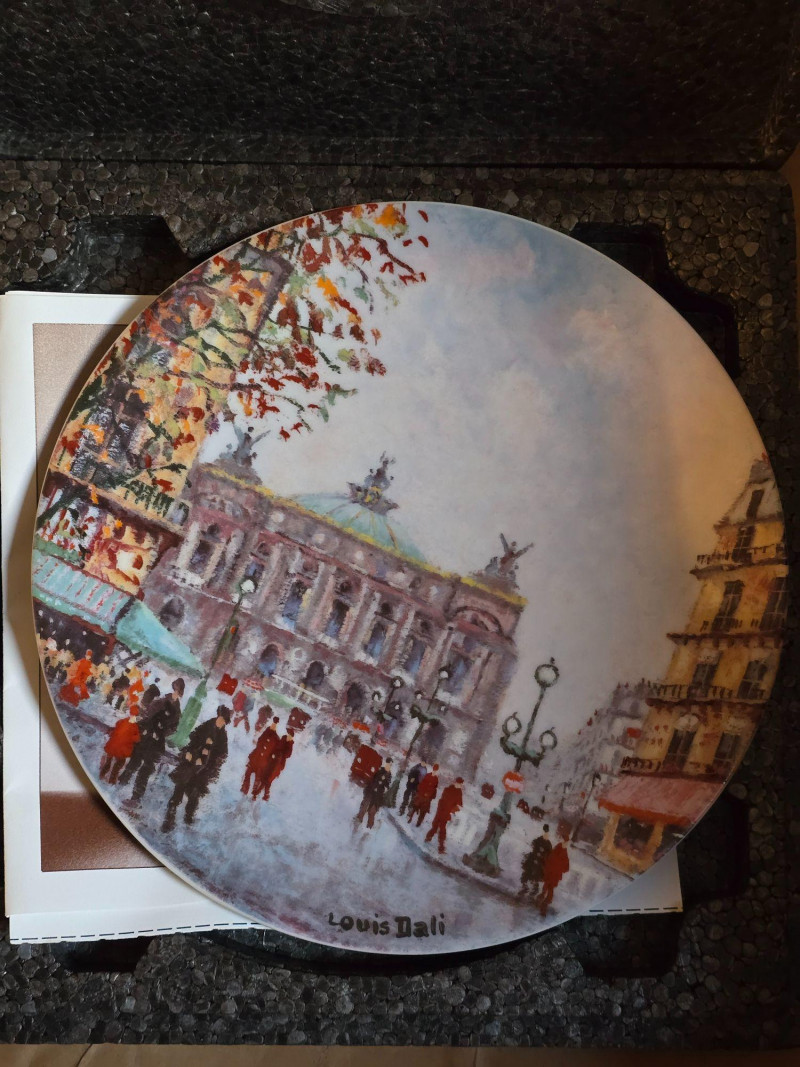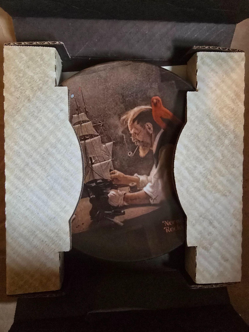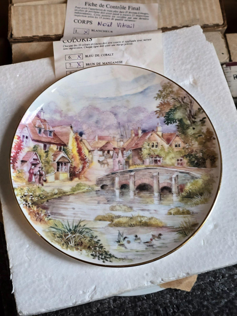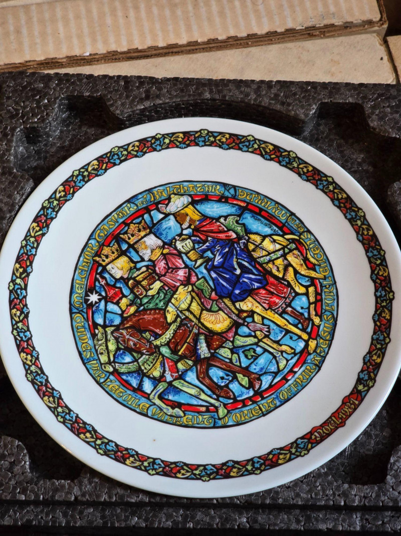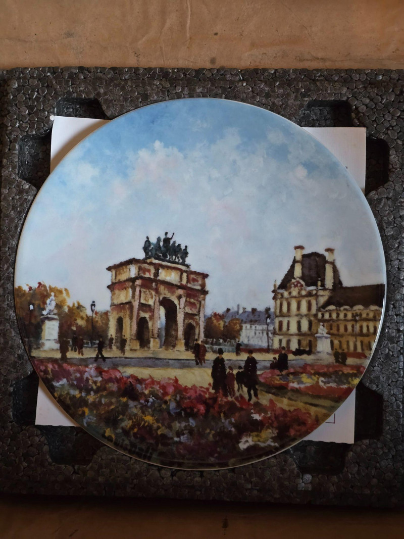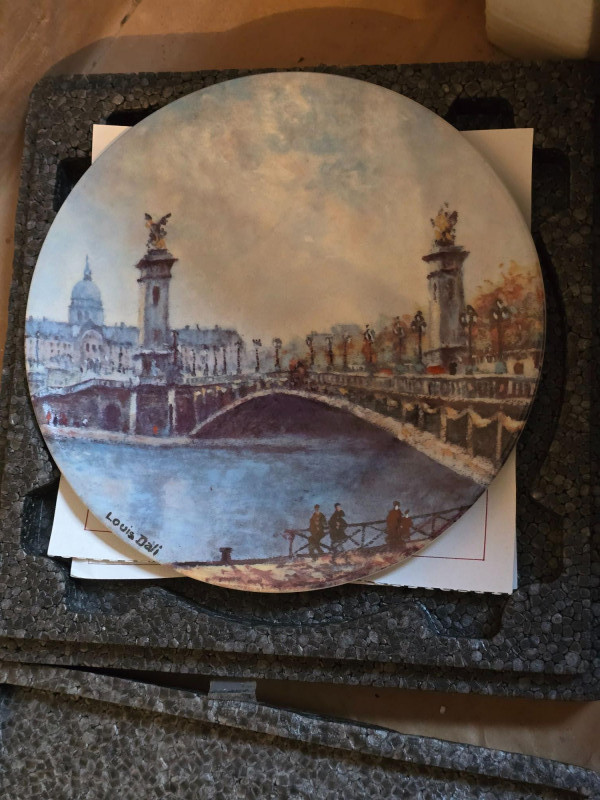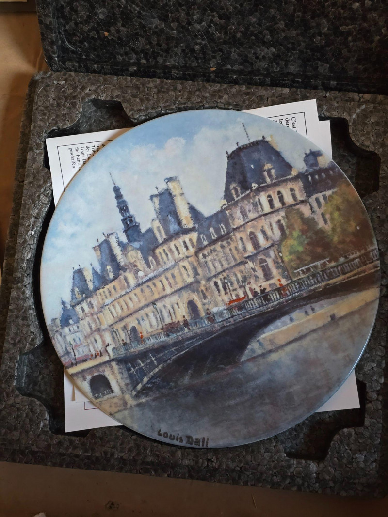 Large antique steamer trunk paired with an extensive assortment of collectible plates from multiple makers and series. The trunk features classic early‑20th‑century construction with wood panels, metal banding, and aged hardware. Interior includes a printed lithograph panel on the inside lid and original wood lining. Exterior shows expected wear from age and use, adding to its authentic vintage character. The plate collection includes boxed and unboxed decorative and commemorative plates from well‑known manufacturers such as The Edwin M. Knowles China Co., Royal Castle Fine China (Japan), Dominion Quality Hand‑Fired China, and more. Many plates remain in their original foam or cardboard packaging. Plate Collection Details (from photos): Multiple Knowles limited‑edition collector plates with original boxes and foam inserts Royal Castle Fine China Japan hand‑decorated plate (backstamp visible) Dominion Quality Genuine Hand‑Fired China boxed plate Several boxed plates featuring artwork themes such as: Paris landmarks (Eiffel Tower, Arc de Triomphe, Notre‑Dame, Place de la Concorde) Wildlife scenes (birds, geese, polar bears) Children and pastoral scenes Holiday or festive illustrations Stained‑glass‑style artwork Many plates appear to be part of themed or numbered series A mix of porcelain and ceramic pieces Several plates remain in protective foam or cardboard sleeves Trunk Features: Wood body with metal banding and hardware Hinged lid with interior printed panel Side handles Original patina with age‑appropriate wear Solid structure with vintage appeal Condition: