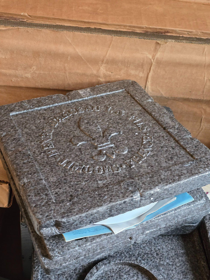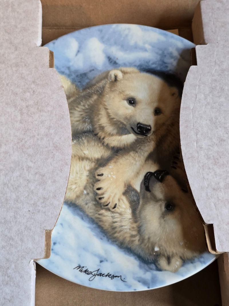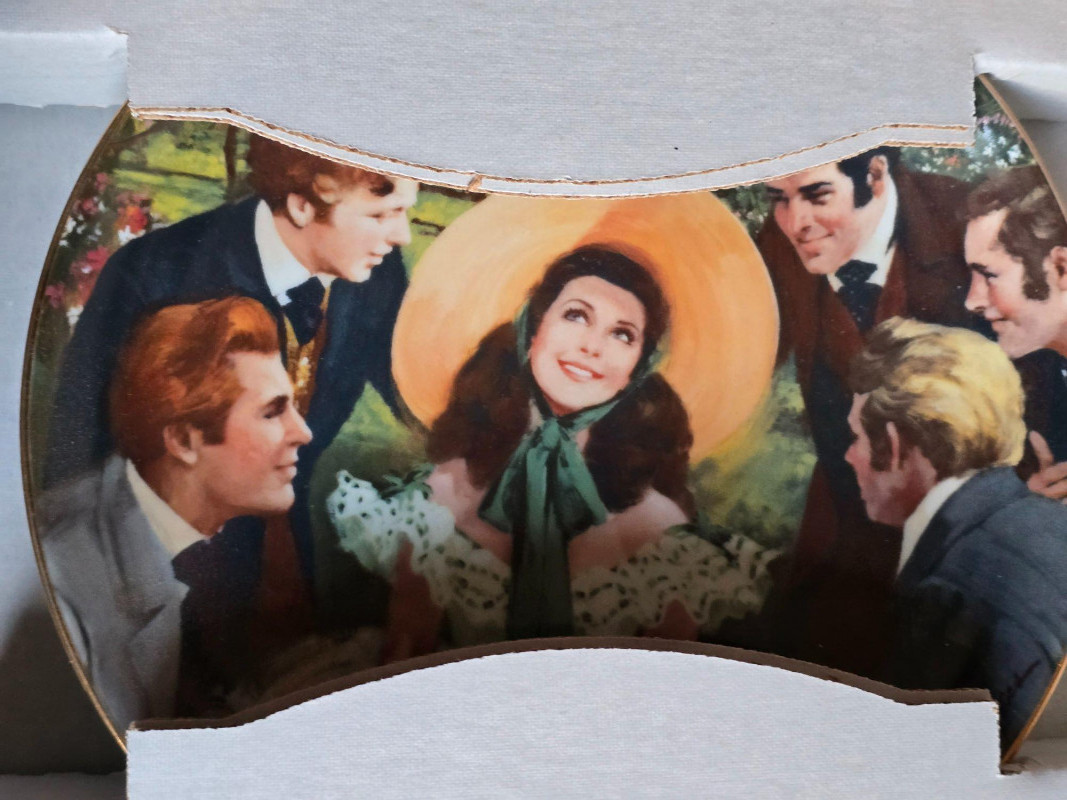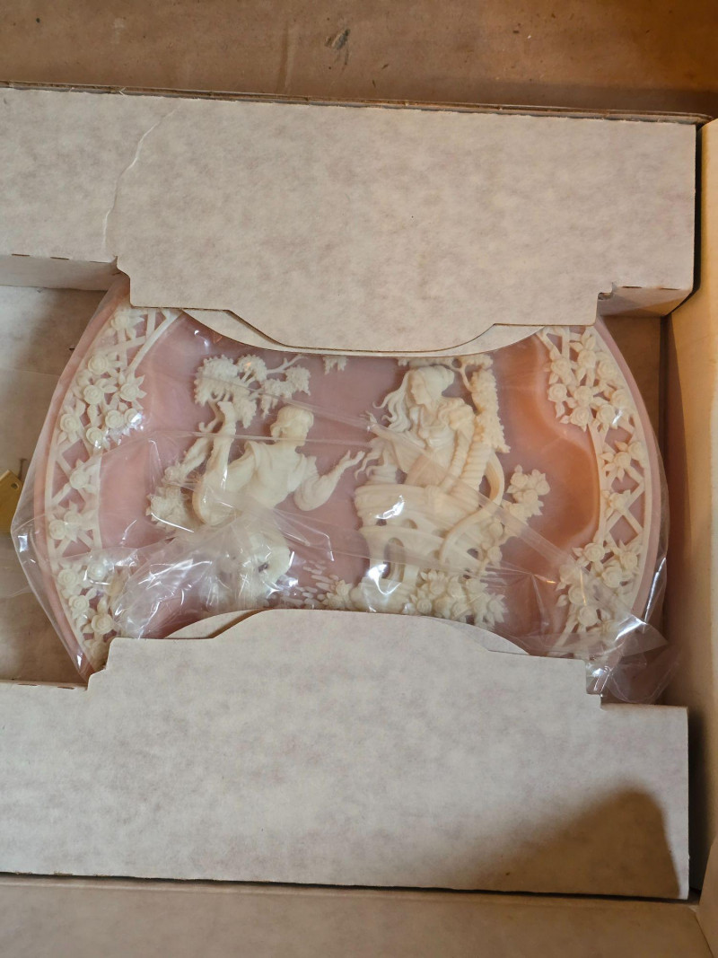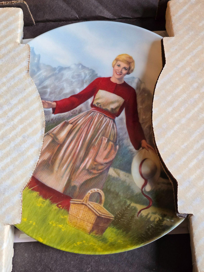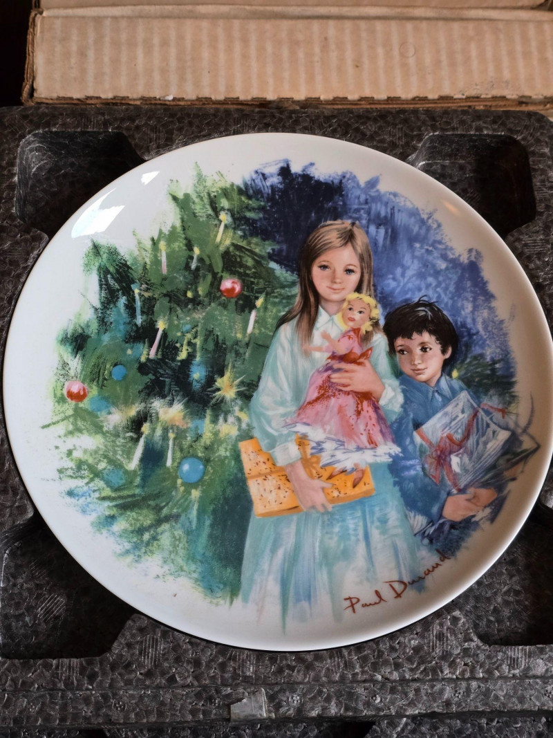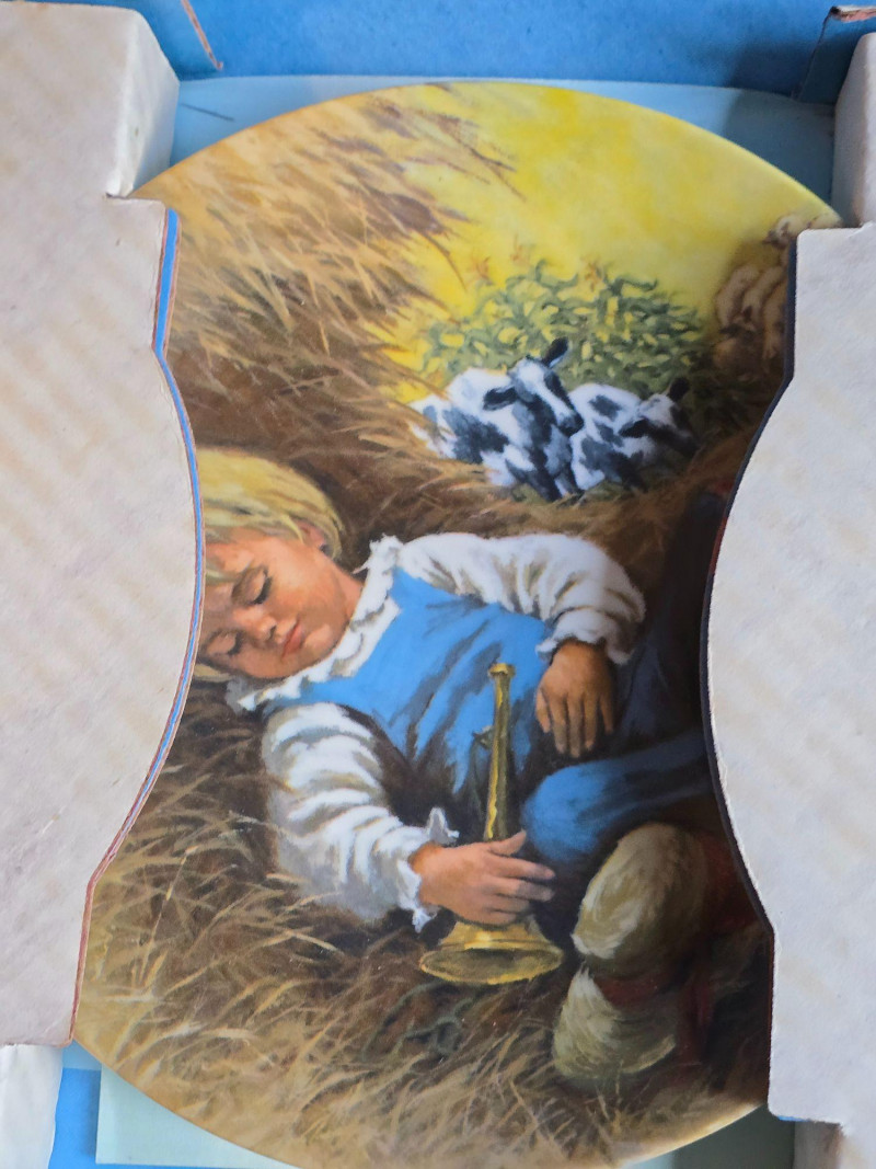 Large antique steamer trunk paired with an extensive assortment of collectible plates from multiple makers and series. The trunk features classic early‑20th‑century construction with wood panels, metal banding, and aged hardware. Interior includes a printed lithograph panel on the inside lid and original wood lining. Exterior shows expected wear from age and use, adding to its authentic vintage character. The plate collection includes boxed and unboxed decorative and commemorative plates from well‑known manufacturers such as The Edwin M. Knowles China Co., Royal Castle Fine China (Japan), Dominion Quality Hand‑Fired China, and more. Many plates remain in their original foam or cardboard packaging. Plate Collection Details (from photos): Multiple Knowles limited‑edition collector plates with original boxes and foam inserts Royal Castle Fine China Japan hand‑decorated plate (backstamp visible) Dominion Quality Genuine Hand‑Fired China boxed plate Several boxed plates featuring artwork themes such as: Paris landmarks (Eiffel Tower, Arc de Triomphe, Notre‑Dame, Place de la Concorde) Wildlife scenes (birds, geese, polar bears) Children and pastoral scenes Holiday or festive illustrations Stained‑glass‑style artwork Many plates appear to be part of themed or numbered series A mix of porcelain and ceramic pieces Several plates remain in protective foam or cardboard sleeves Trunk Features: Wood body with metal banding and hardware Hinged lid with interior printed panel Side handles Original patina with age‑appropriate wear Solid structure with vintage appeal Condition: