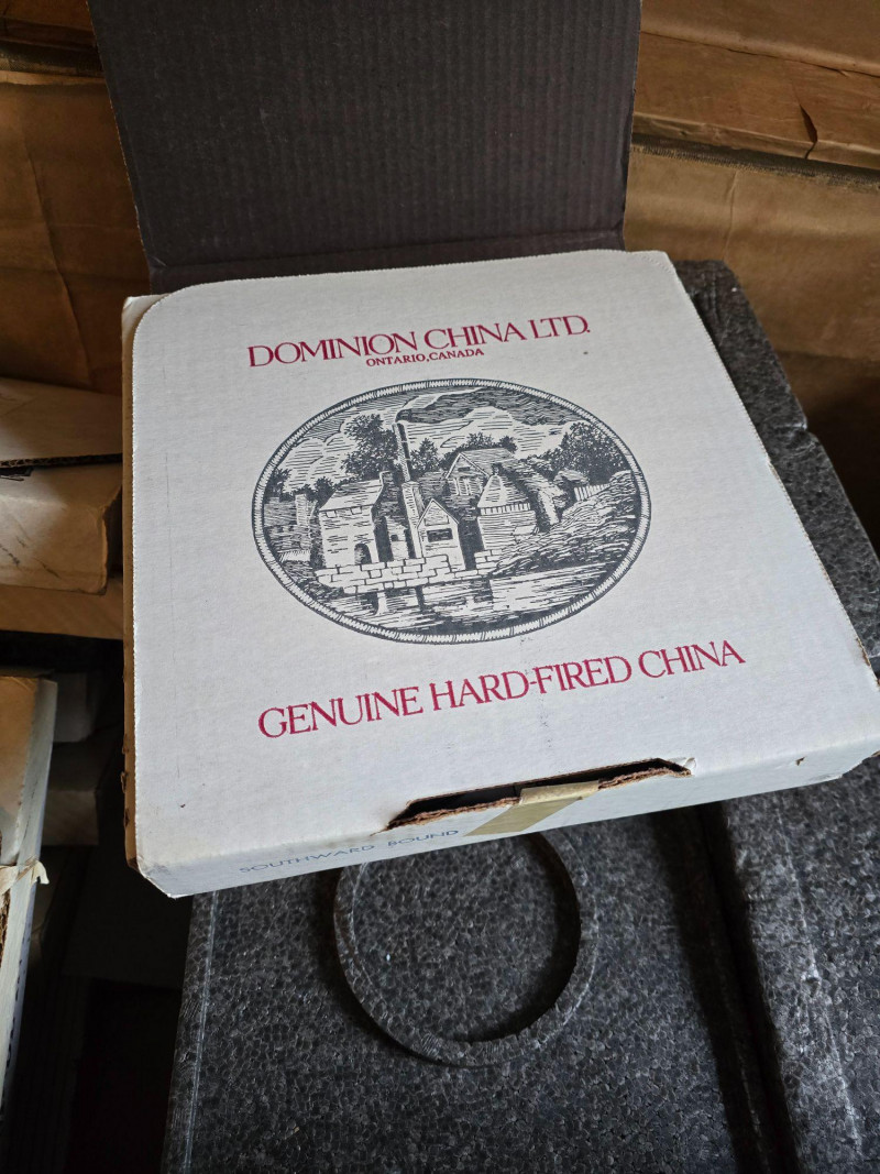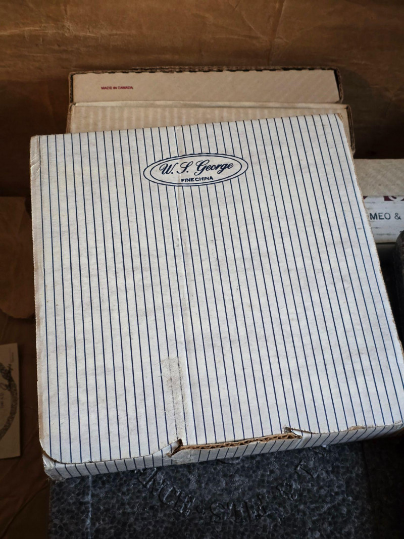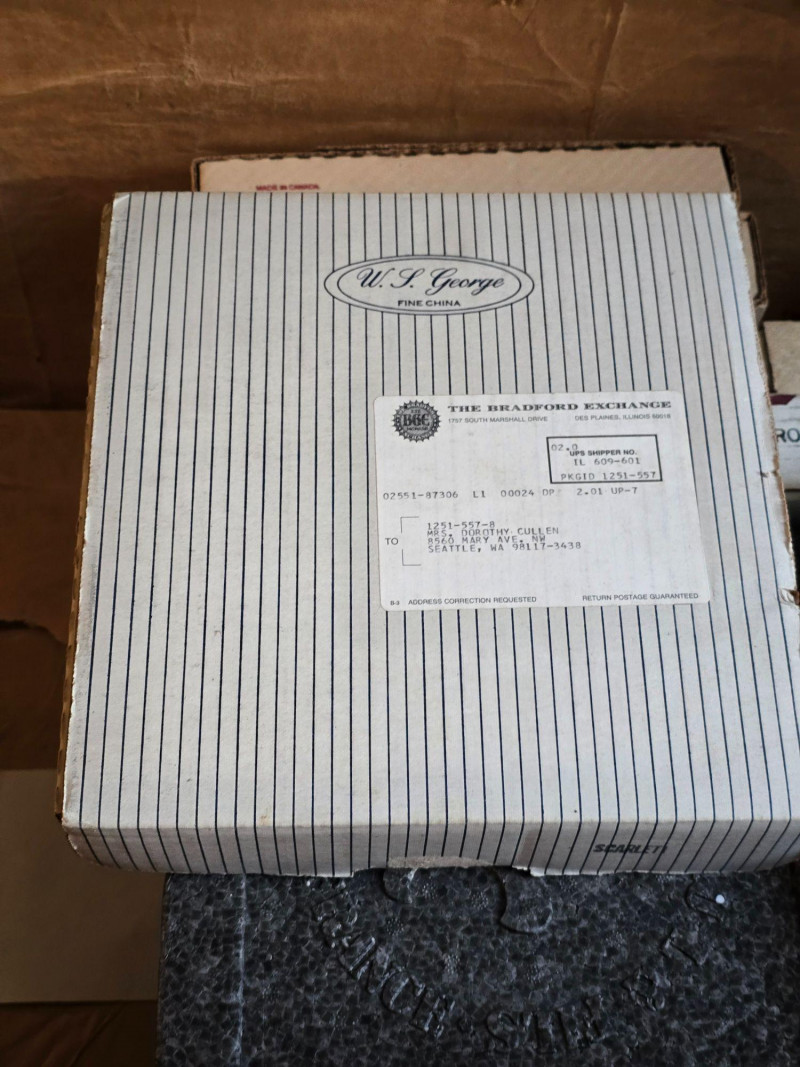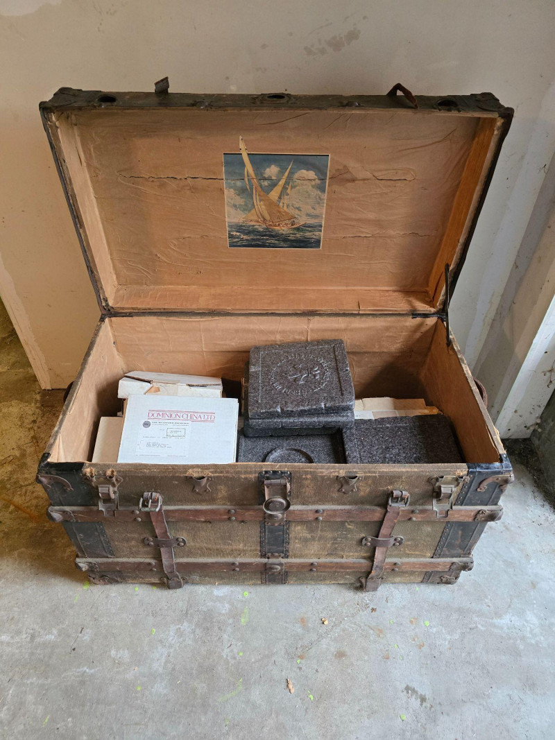 The trunk shows scuffs, scratches, and finish wear consistent with age. Plates vary in condition; many are boxed and well‑protected, while others may show minor age‑related wear. All items are sold as found from the estate. Notes: