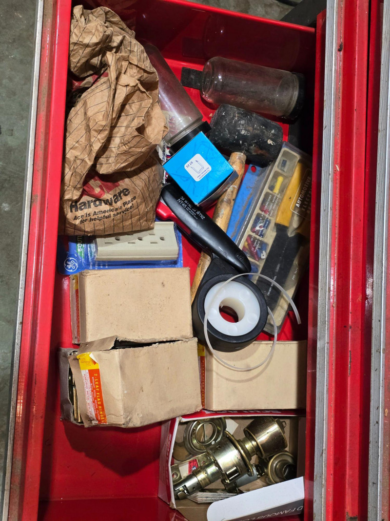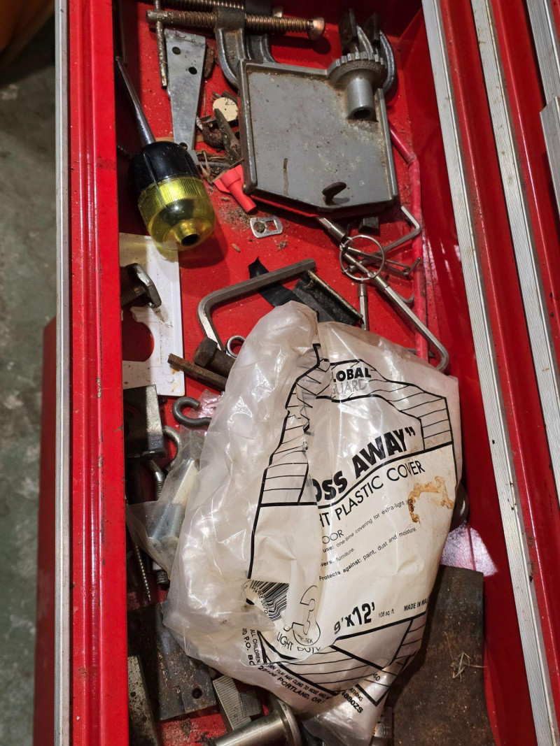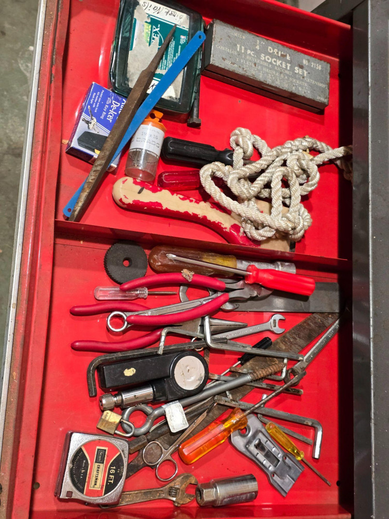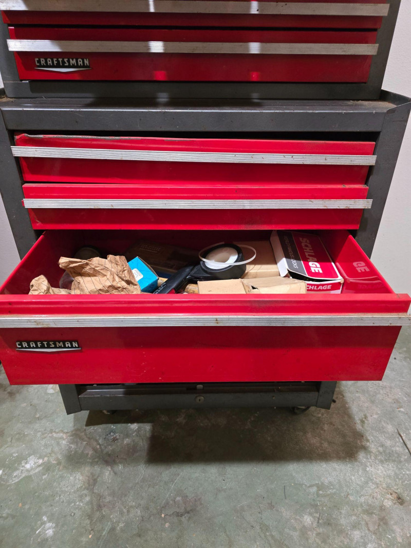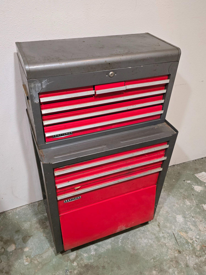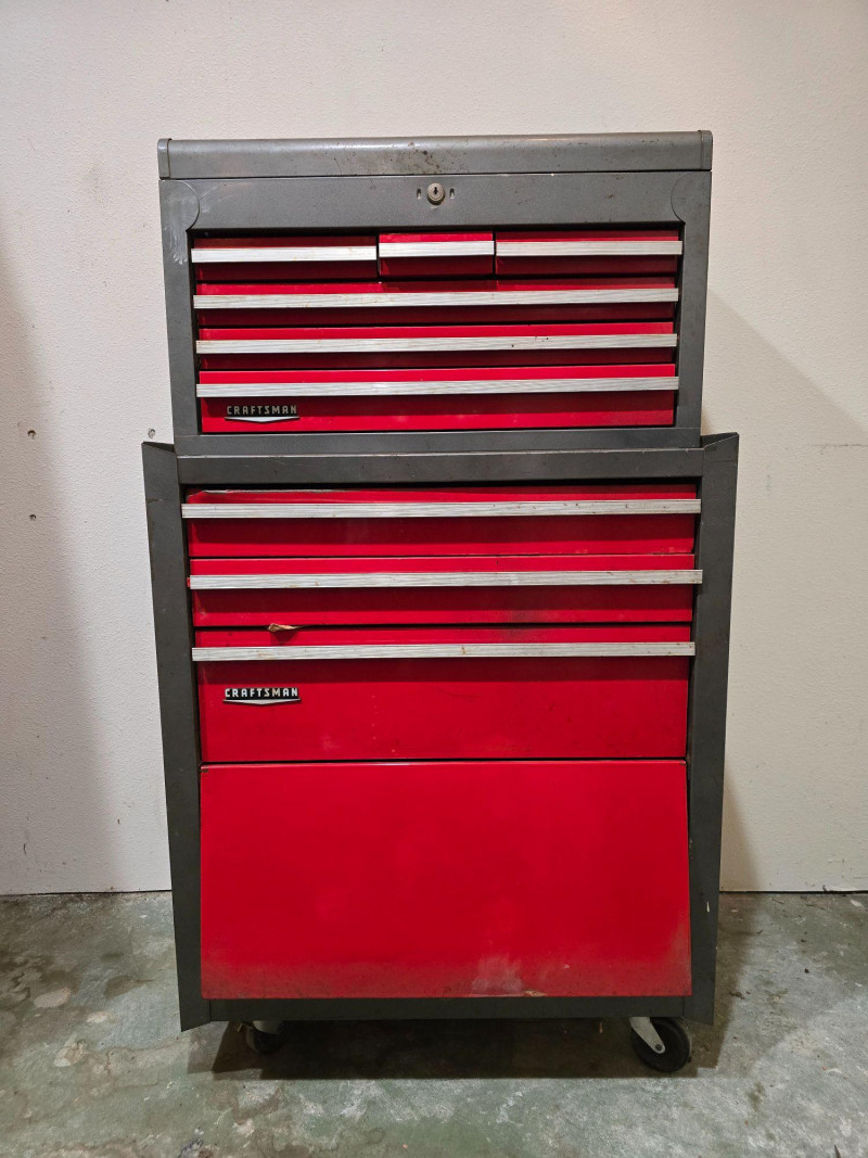 Sturdy red Craftsman tool chest with multiple drawers for organized tool storage. Includes a hinged top compartment and a mix of shallow and deep drawers suitable for hand tools, hardware, and shop accessories. Metal construction with classic red Craftsman finish Multiple pull‑out drawers for organized storage Hinged top compartment Smooth drawer operation Bottom lift drawer includes built‑in lock mechanism Shows normal wear from use. Drawers open and close properly. Interior drawers contain assorted tools and hardware as shown. Surface wear present but no structural issues observed. Key is not included. The bottom lift drawer with the locking mechanism is left in the unlocked position.Features