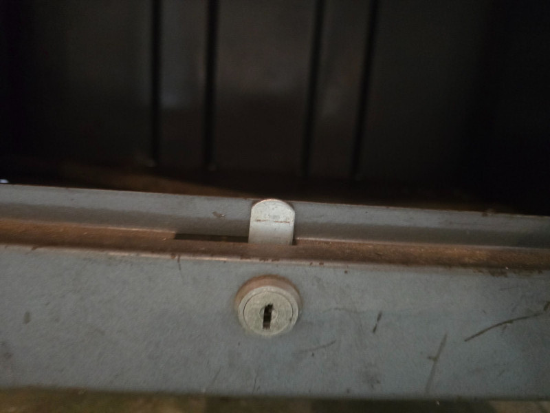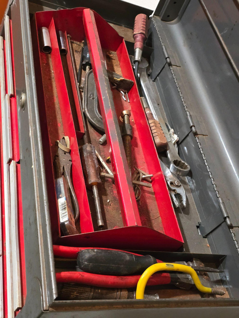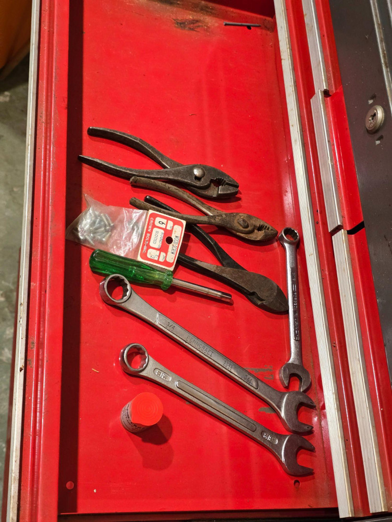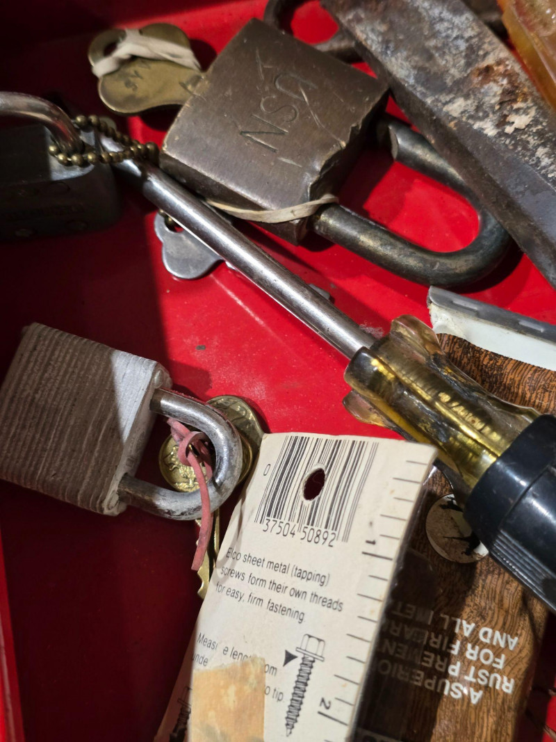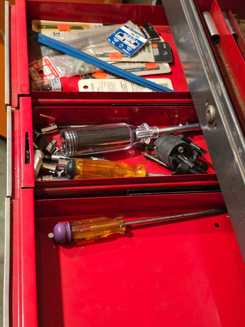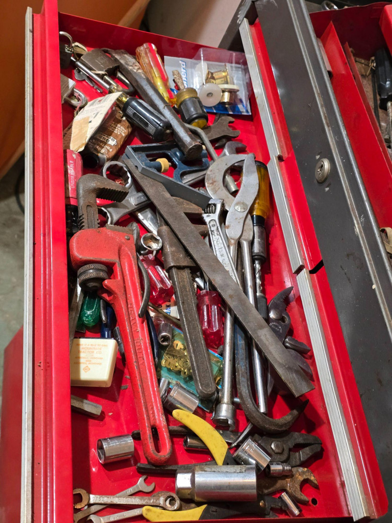 Sturdy red Craftsman tool chest with multiple drawers for organized tool storage. Includes a hinged top compartment and a mix of shallow and deep drawers suitable for hand tools, hardware, and shop accessories. Metal construction with classic red Craftsman finish Multiple pull‑out drawers for organized storage Hinged top compartment Smooth drawer operation Bottom lift drawer includes built‑in lock mechanism Shows normal wear from use. Drawers open and close properly. Interior drawers contain assorted tools and hardware as shown. Surface wear present but no structural issues observed. Key is not included. The bottom lift drawer with the locking mechanism is left in the unlocked position.Features