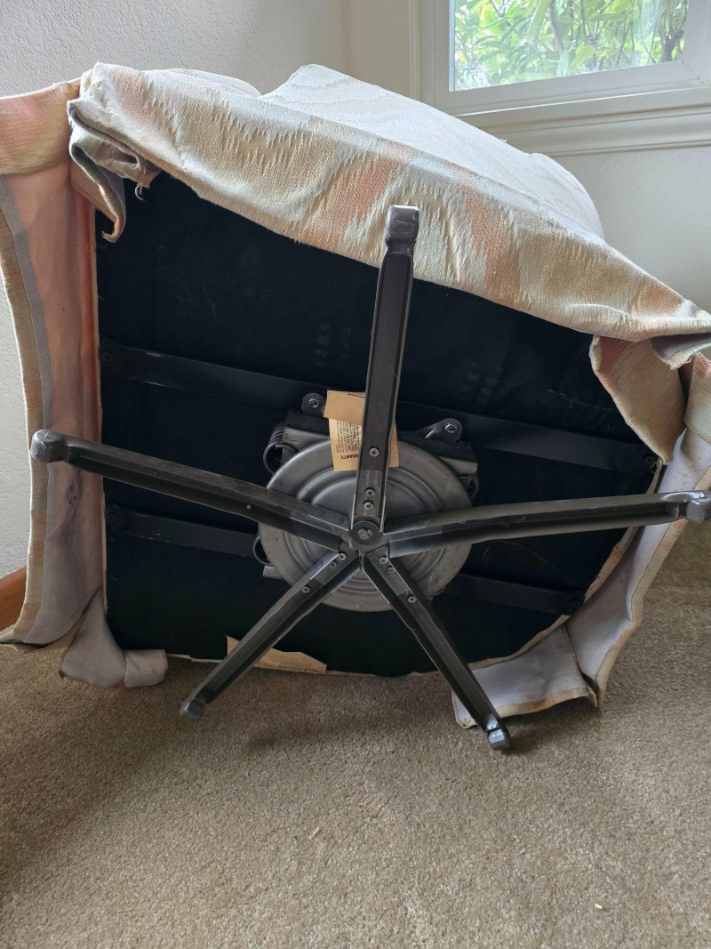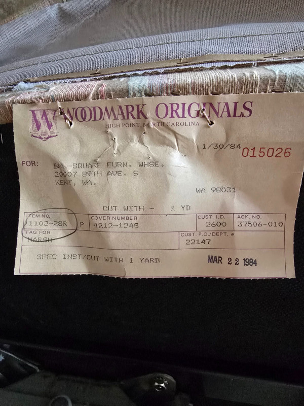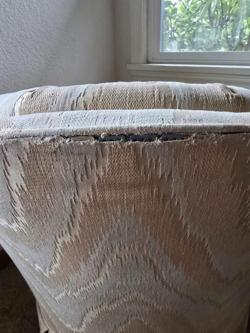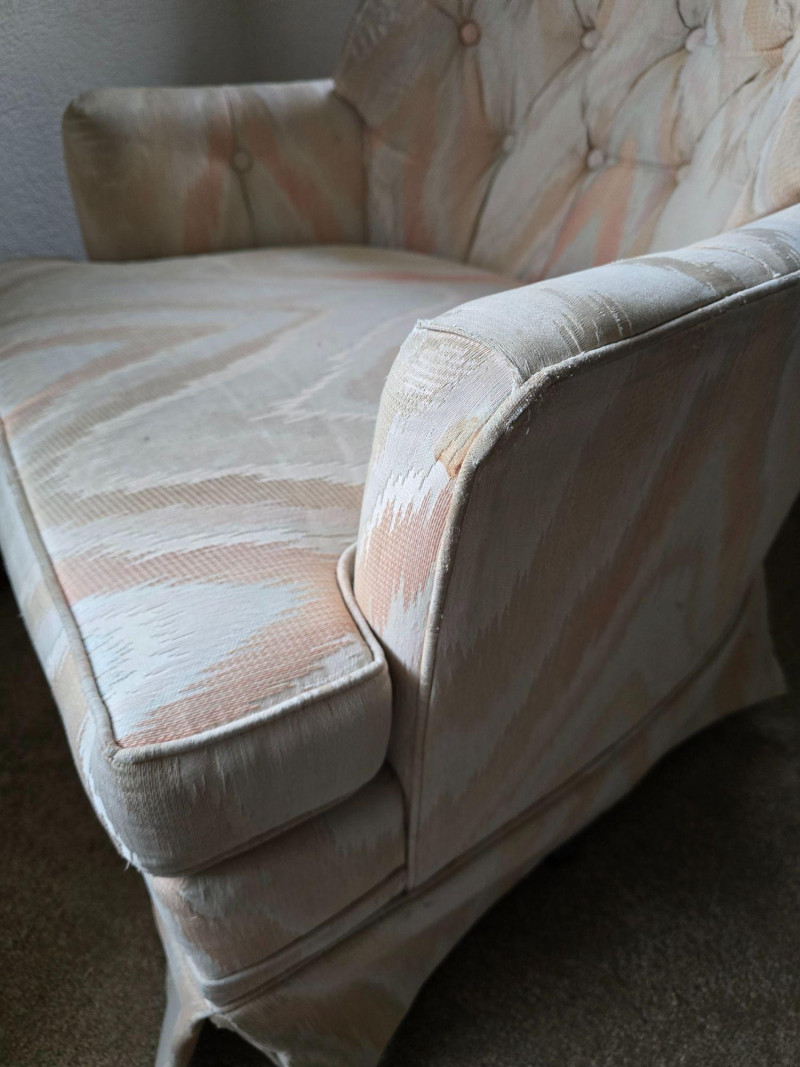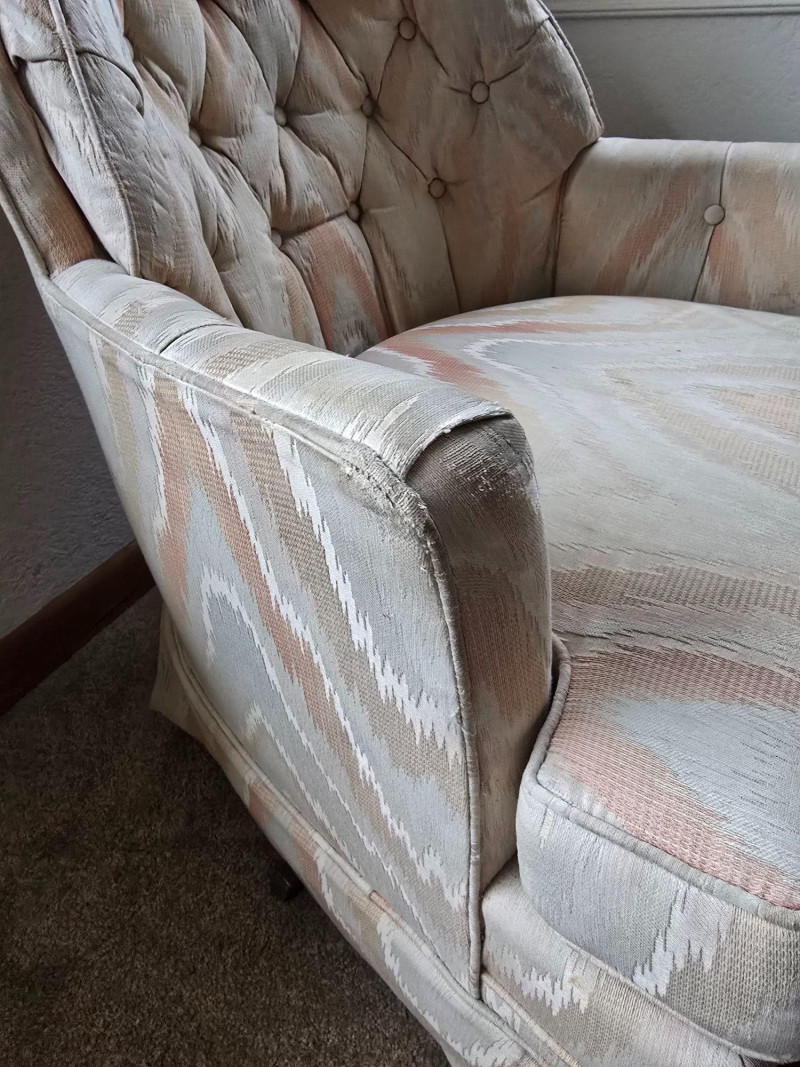 Structurally solid with upholstery wear consistent with age and use. Noted imperfections include visible fabric wear on the armrest and a tear along the upper back seam. All photographed for accuracy. No structural instability observed. Notes:
