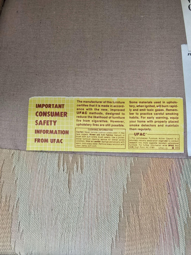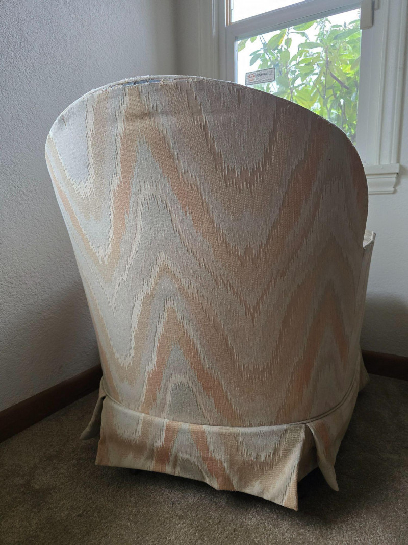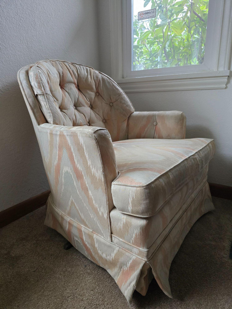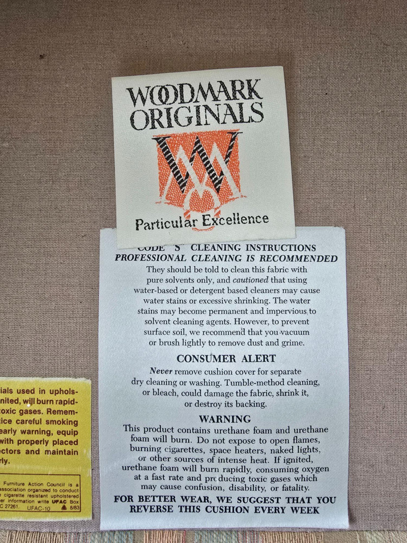 Classic Woodmark Originals upholstered armchair featuring a pastel zigzag fabric in soft tones of beige, pink, and light blue. Designed with a tufted back, rolled arms, and a full skirted base, this chair offers a traditional silhouette with comfortable support. Includes original manufacturer and UFAC safety tags. Details: Maker: Woodmark Originals Style: Traditional upholstered armchair Upholstery: Pastel zigzag pattern Features: Tufted back, rolled arms, skirted bottom Tags: UFAC safety label, Woodmark Originals cleaning instructions, manufacturing tag Construction: Polyurethane foam pad (per tag) Condition:
