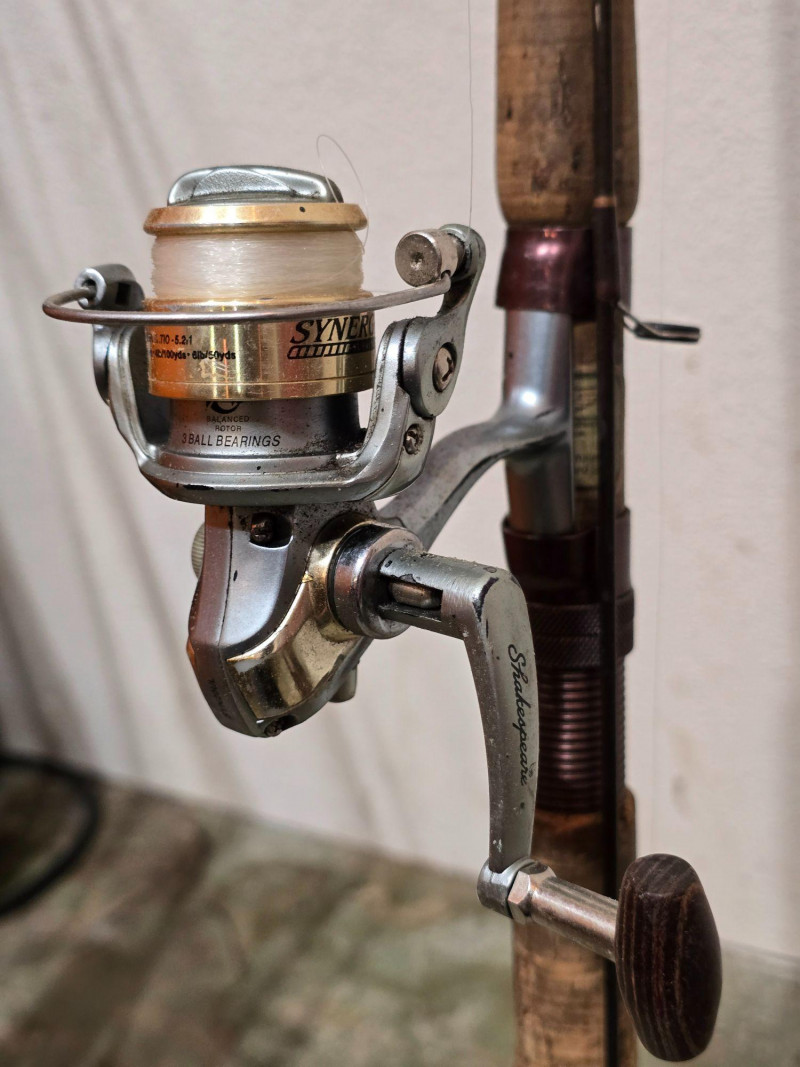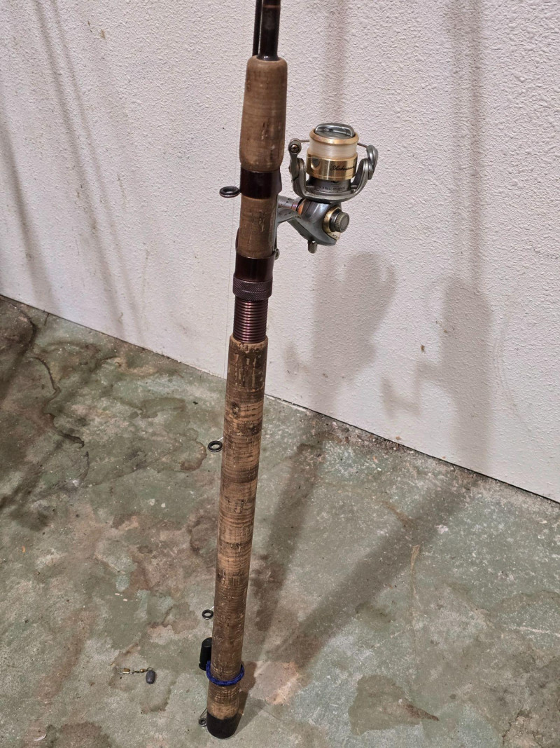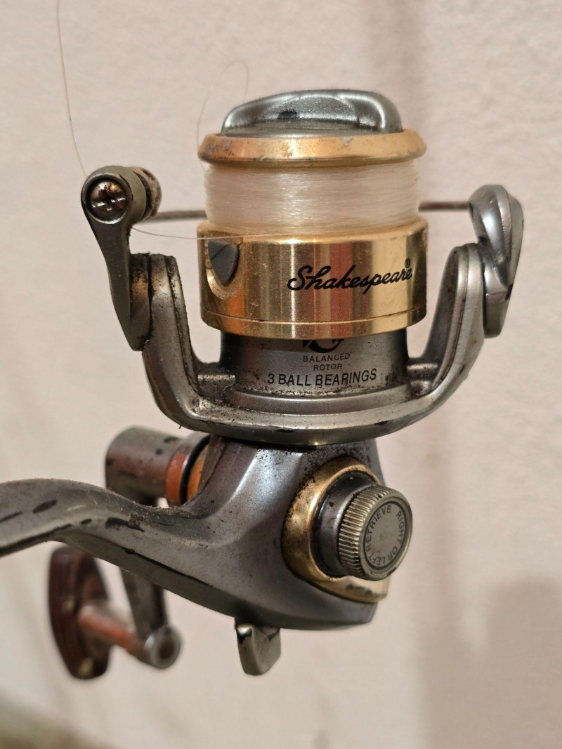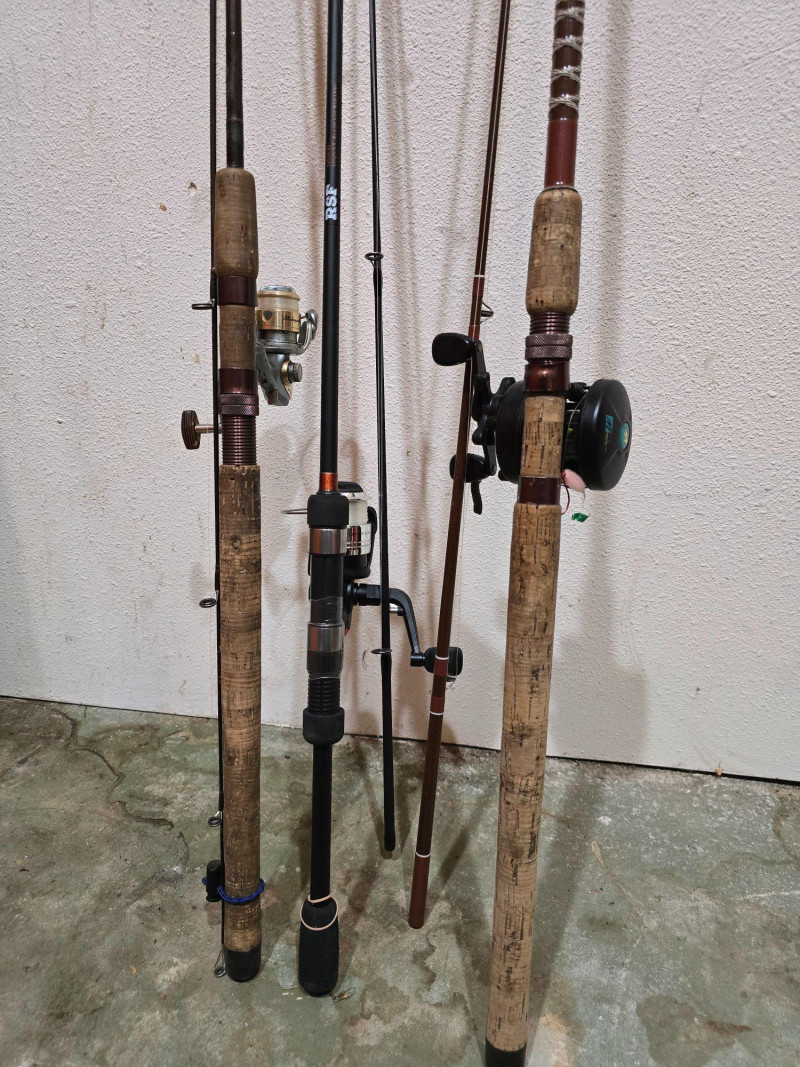 A mixed trio of fishing rods with attached reels, including recognizable names such as Fenwick, HMG Graphite, Shakespeare, Zebco, and President II. These estate‑found rods show normal use and age but retain clear maker markings and readable specifications. A practical set for anglers, refurbishers, or collectors of classic fishing gear. Fenwick FS83C rod Marked 8'1", 1/4–5/8 oz lure, 6–15 lb line Serial R142296 HMG Graphite rod with cork handle Additional rod with mixed‑brand reel components (Shakespeare, Zebco, President II) Pre‑owned estate items Wear consistent with age and use Reels untested Some cosmetic wear to rods and guides See photos for detailsIncluded in This Lot