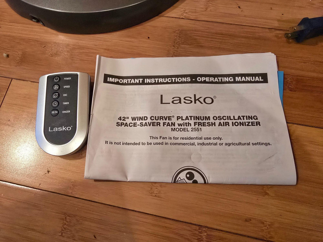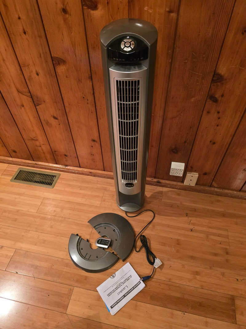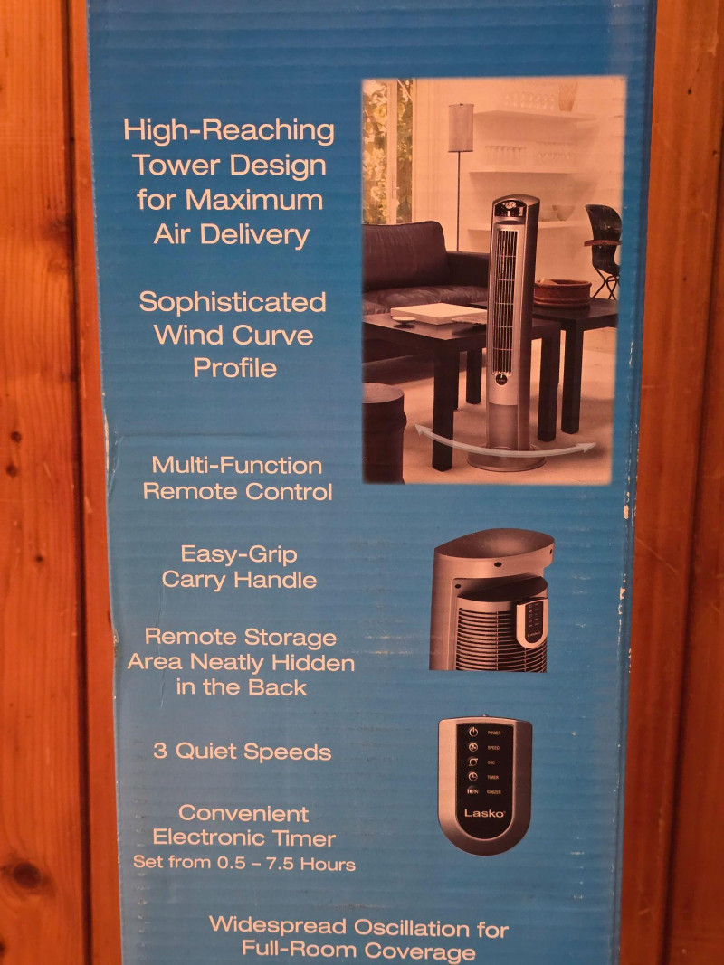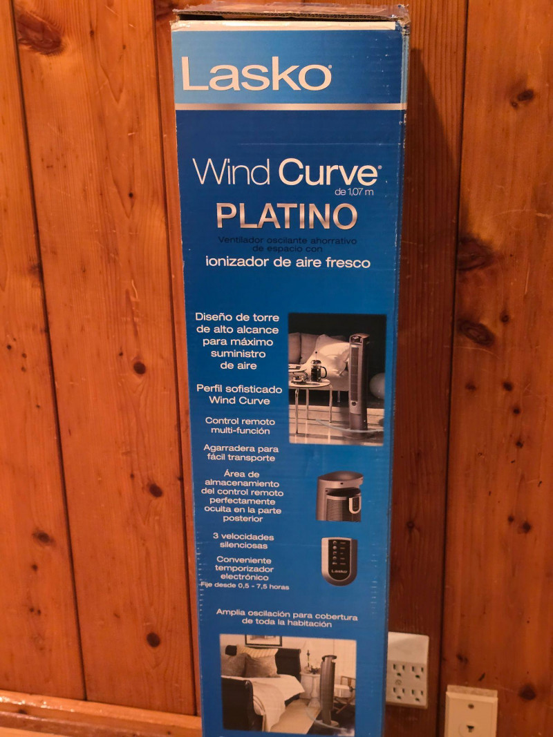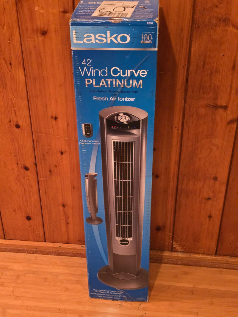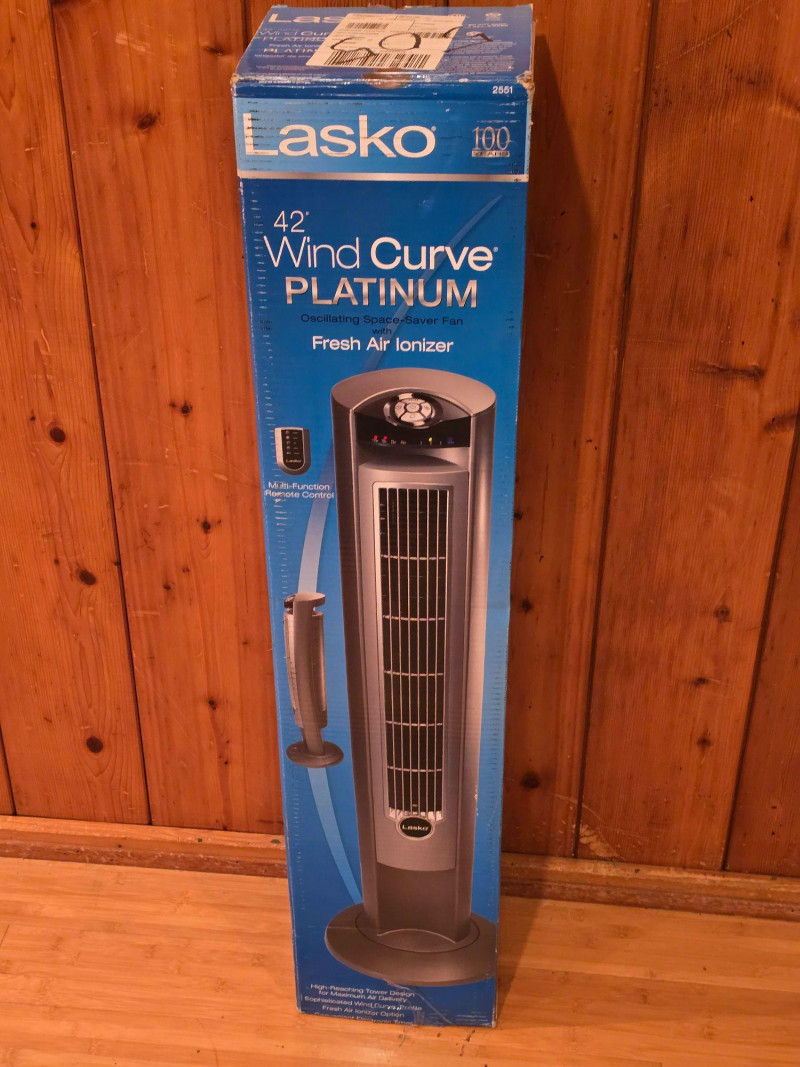 Lasko 42" Wind Curve oscillating tower fan in Platinum finish. Unit is new in box; packaging shows some shelf and storage wear. Features a slim, space‑saving profile with a modern curved design. Includes multi‑speed settings, widespread oscillation, and built‑in ionizer function. Factory‑sealed interior. Features & Notes: New in box Model: Wind Curve 42" Tower Fan Platinum finish with curved front panel Multi‑speed settings Oscillation function Built‑in ionizer Integrated carry handle Condition: