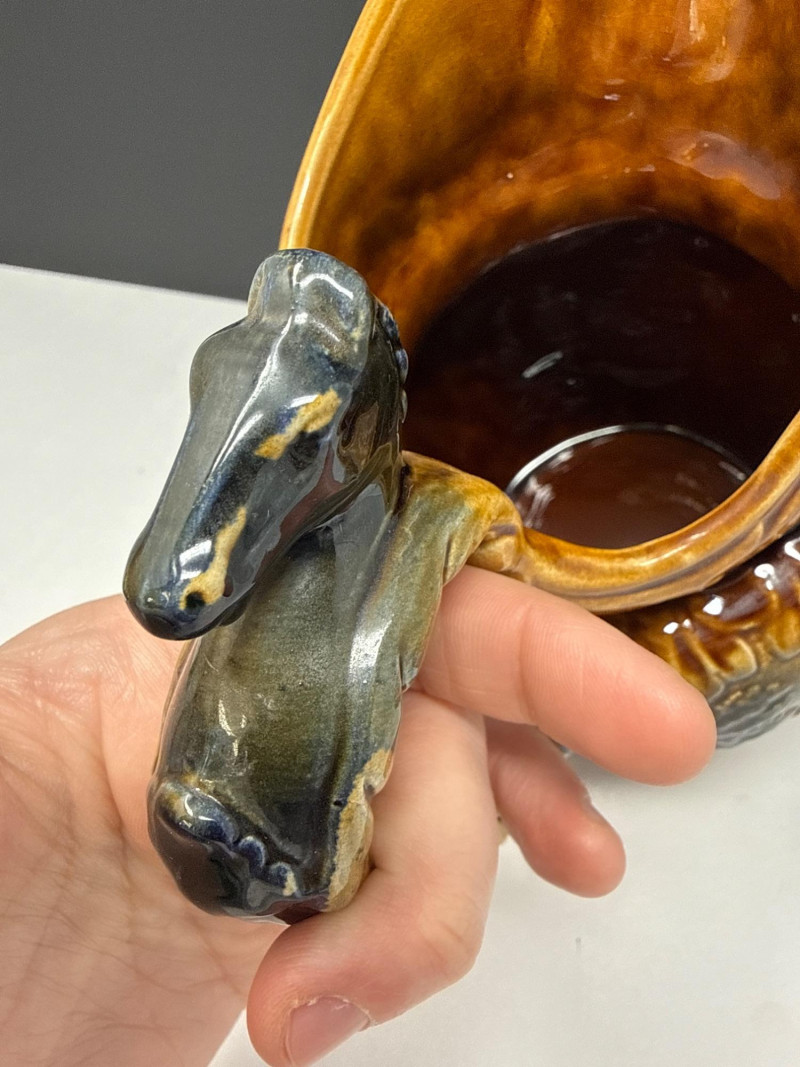 This is a beautiful example of mid-century English pottery, specifically a relief-molded pitcher by Arthur Wood (England). It features a rich, multi-tonal glaze and a classic "Old World" aesthetic. Manufacturer: Arthur Wood & Son, Staffordshire, England. Design: The pitcher features a highly detailed, embossed scroll and floral motif with a textured, "wood-grain" style background. Glaze: A stunning amber and mahogany brown drip glaze (often referred to as a treacle or rockingham-style glaze) that gives the piece a deep, lustrous finish.Product Description-