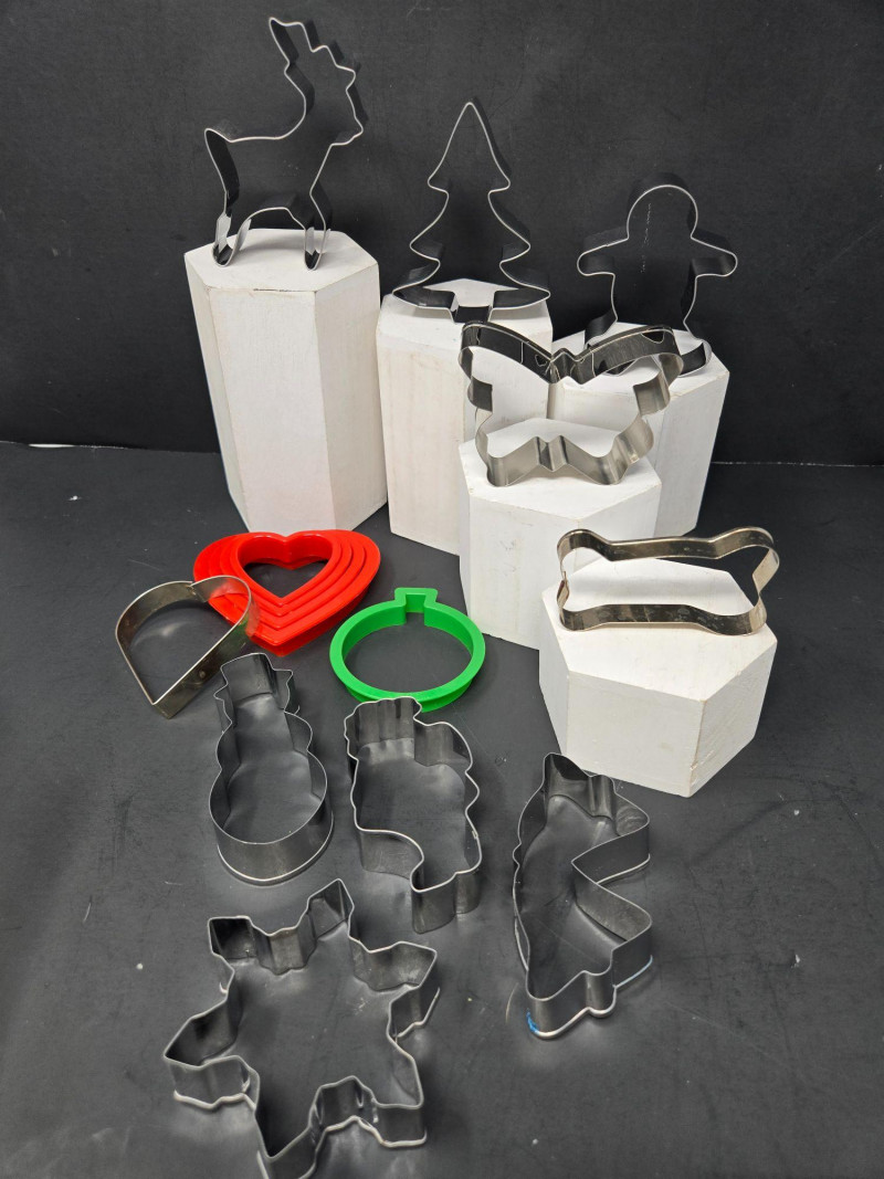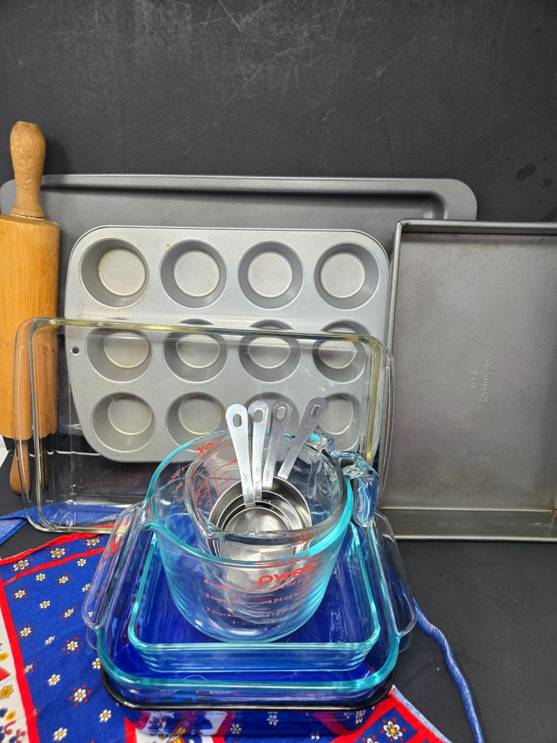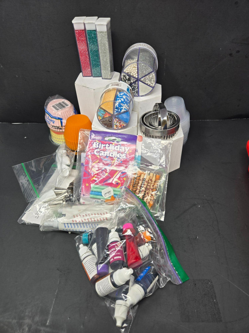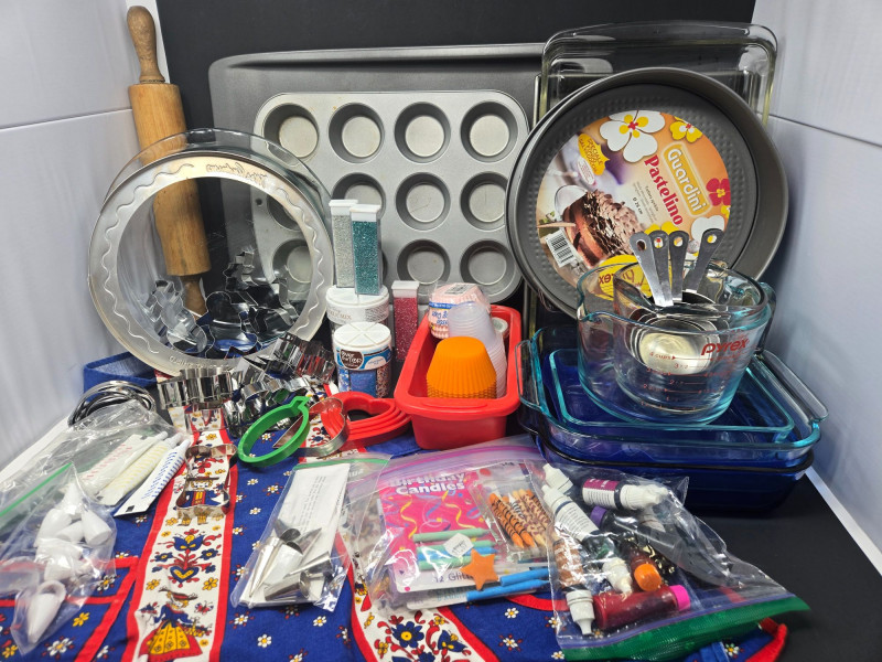 A fully stocked baking and decorating bundle perfect for home bakers, cookie artists, cupcake lovers, and anyone who enjoys creative kitchen projects. This cheerful, well‑rounded lot includes pans, tools, décor, and essentials—everything needed for baking days, parties, or holiday prep. Included Highlights: Bakeware Muffin pan Round cake pans Rolling pin Tools & Prep Essentials Glass mixing bowls Measuring cups & spoons Assorted cookie cutters Silicone cupcake liners Piping tips & accessories Decorating Supplies Food coloring tubes Sprinkles & candy décor Icing tools Resealable bags with assorted decorations A colorful, joy‑filled baking assortment ready for cookies, cakes, cupcakes, and creative kitchen fun. Pre‑owned with typical light wear from home baking use. All items sold AS IS, WHERE IS.Bakers Heaven