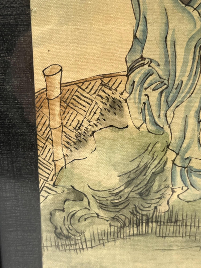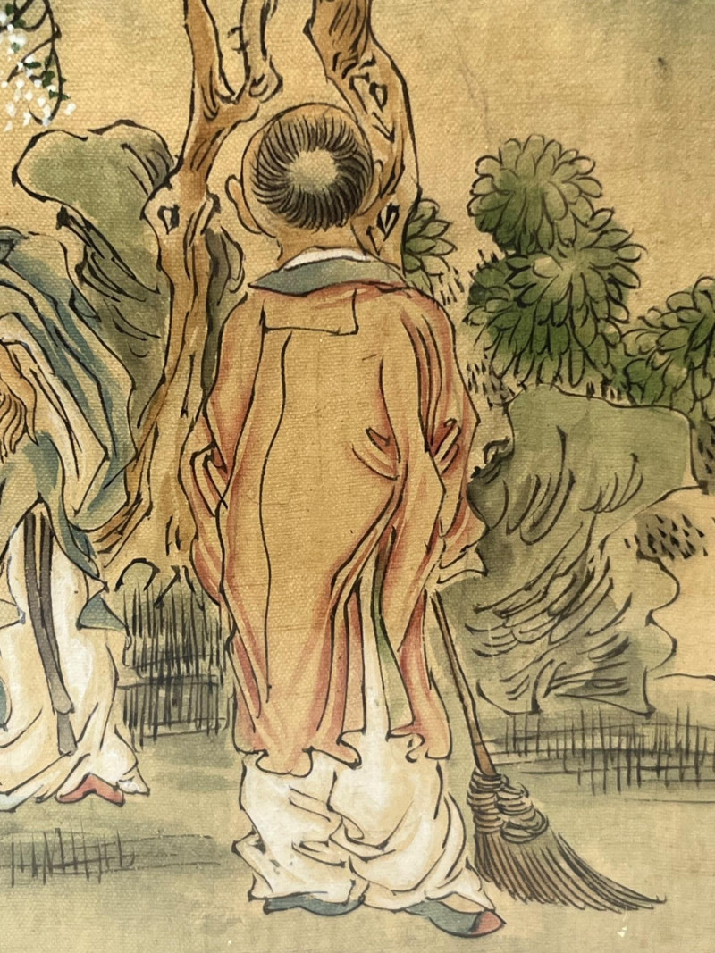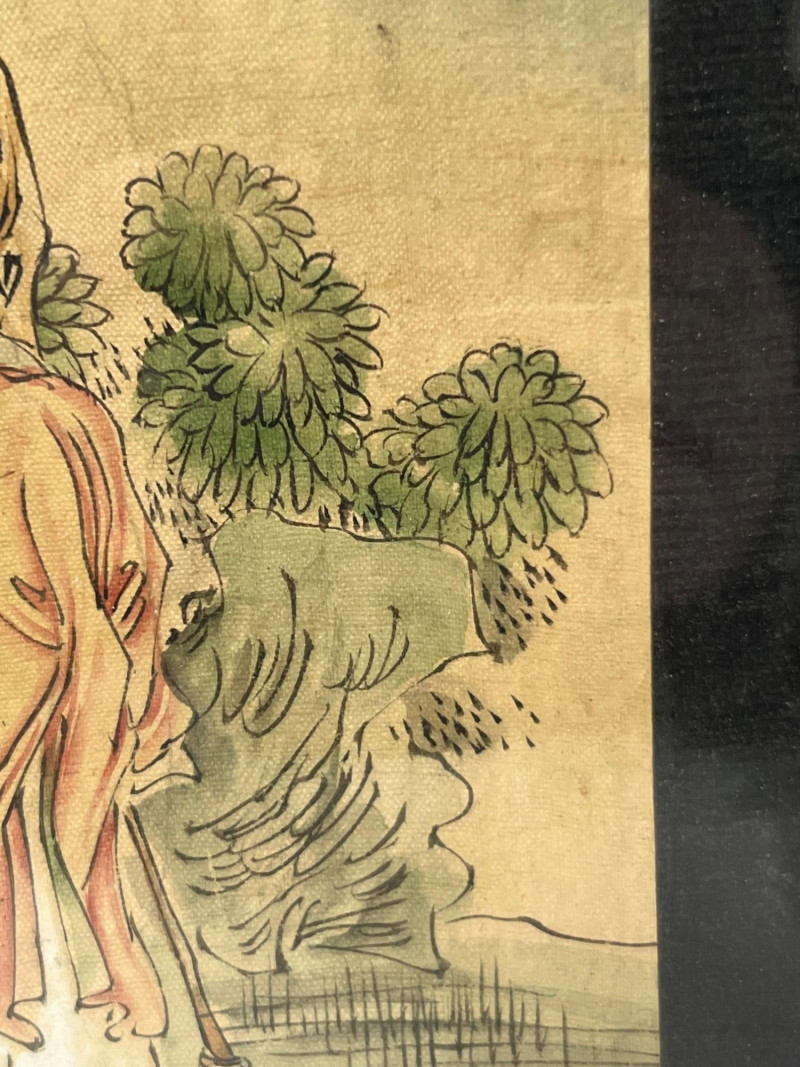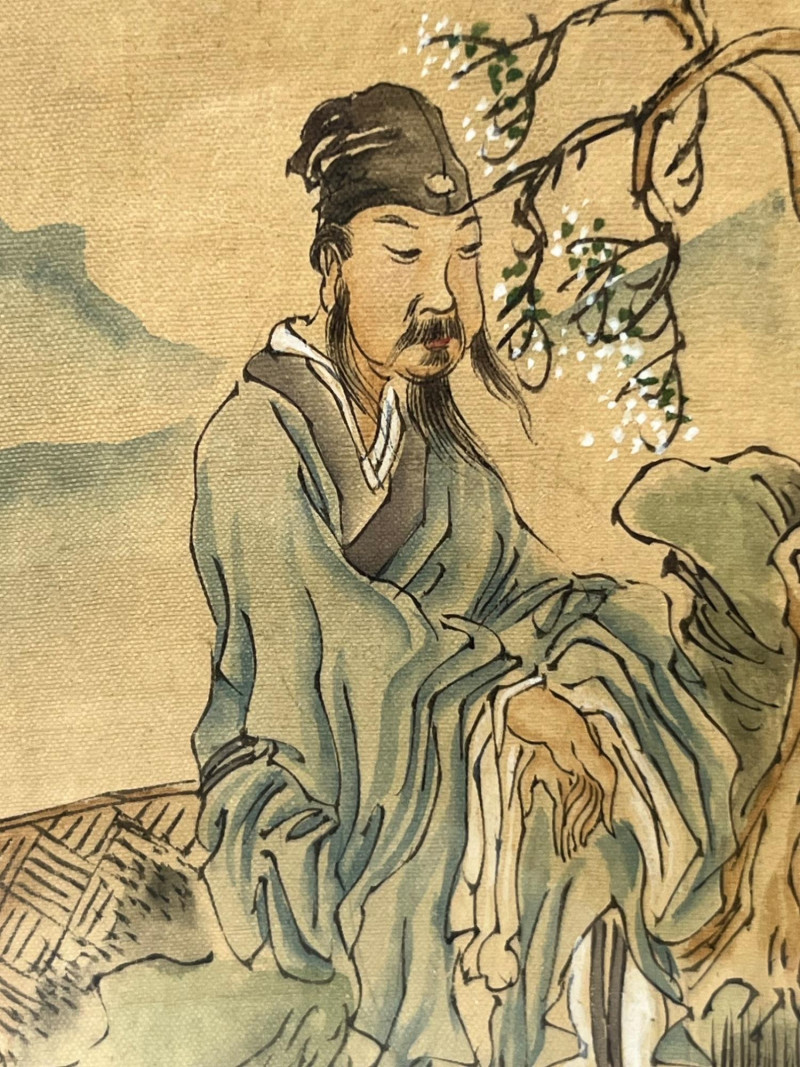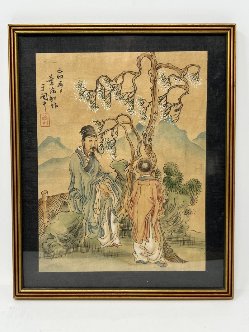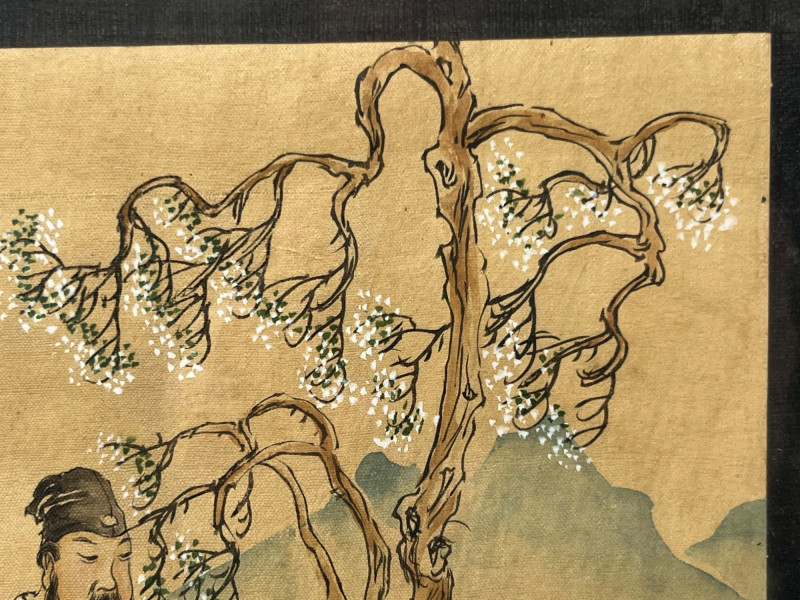 Elegant hand‑painted scene depicting three robed figures gathered beneath a blossoming tree with distant mountains and foliage in the background. Rendered in ink and color on paper with fine brushwork, expressive line quality, and soft tonal transitions typical of classical Chinese painting traditions. The composition includes detailed facial expressions, layered garments, and naturalistic botanical elements. Calligraphy with a red artist’s seal appears along the right margin. The painting is presented in a dark frame with a gold inner border. A refined decorative piece with cultural and artistic appeal, suitable for collectors of Asian art, traditional ink painting, or interior display. Notes: