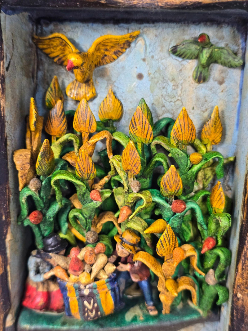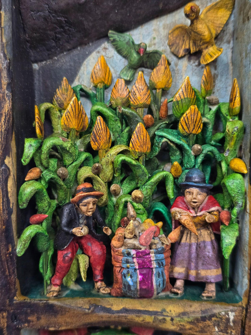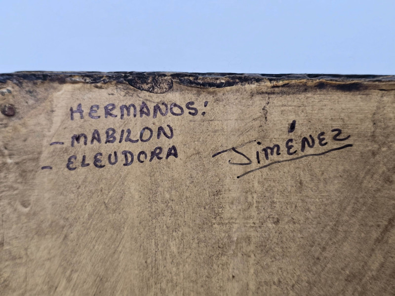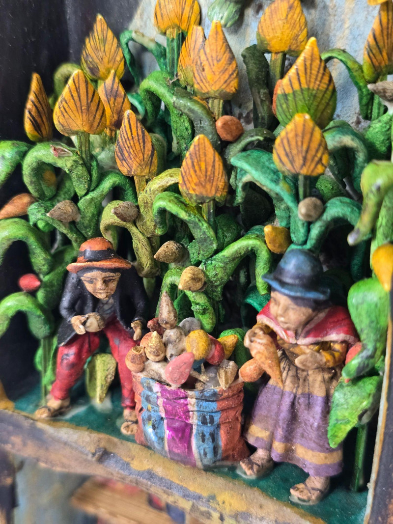 Handcrafted Peruvian wall mirror created by the artisan duo Mabilon and Eleudora Jimenez, known for their narrative folk‑art panels and detailed painted storytelling. The Jimenez family is associated with traditional Andean decorative arts, producing mirrors and retablos that blend regional history, daily life, and cultural symbolism. Their work often highlights community scenes, agricultural rhythms, and market traditions, rendered with expressive color and finely outlined figures.