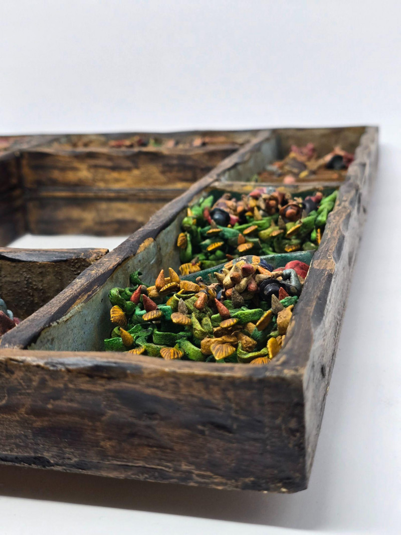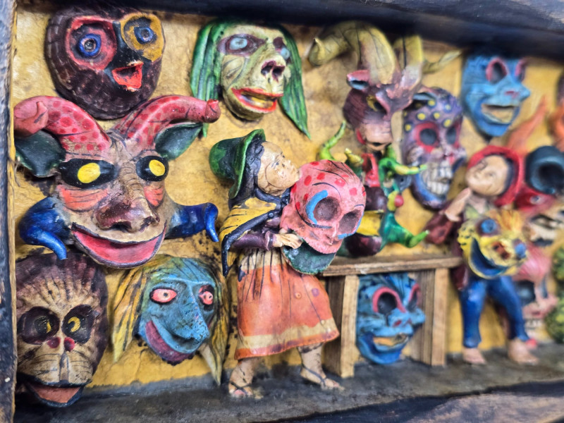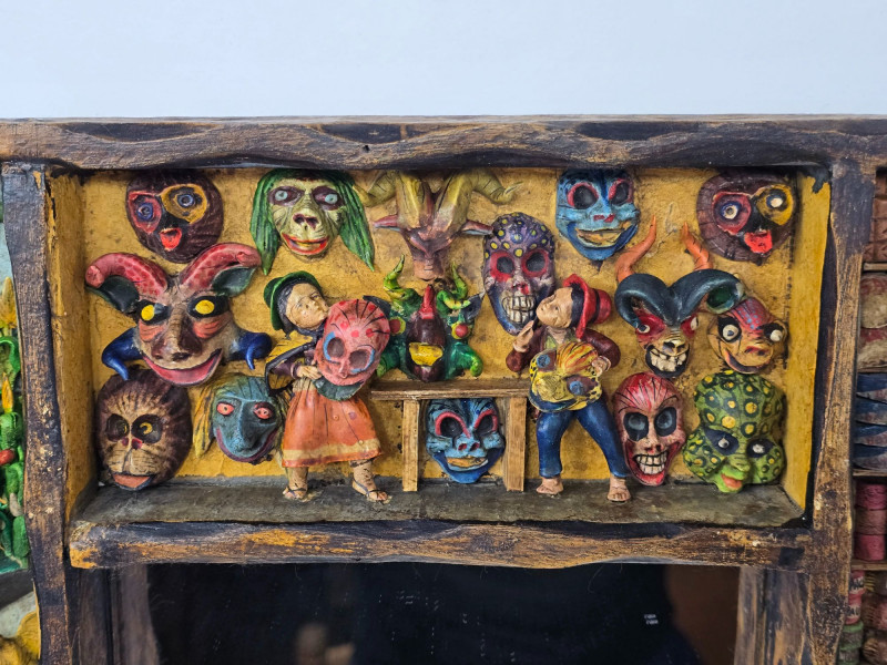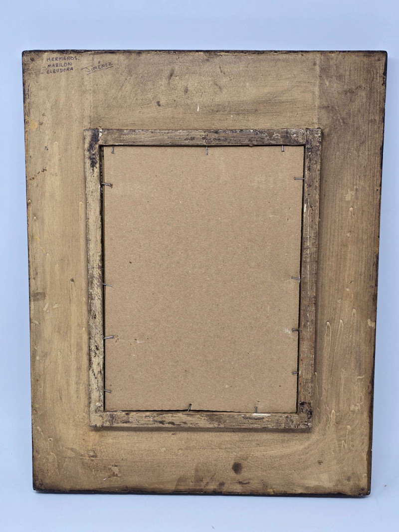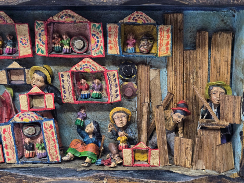 Handcrafted Peruvian wall mirror created by the artisan duo Mabilon and Eleudora Jimenez, known for their narrative folk‑art panels and detailed painted storytelling. The Jimenez family is associated with traditional Andean decorative arts, producing mirrors and retablos that blend regional history, daily life, and cultural symbolism. Their work often highlights community scenes, agricultural rhythms, and market traditions, rendered with expressive color and finely outlined figures.