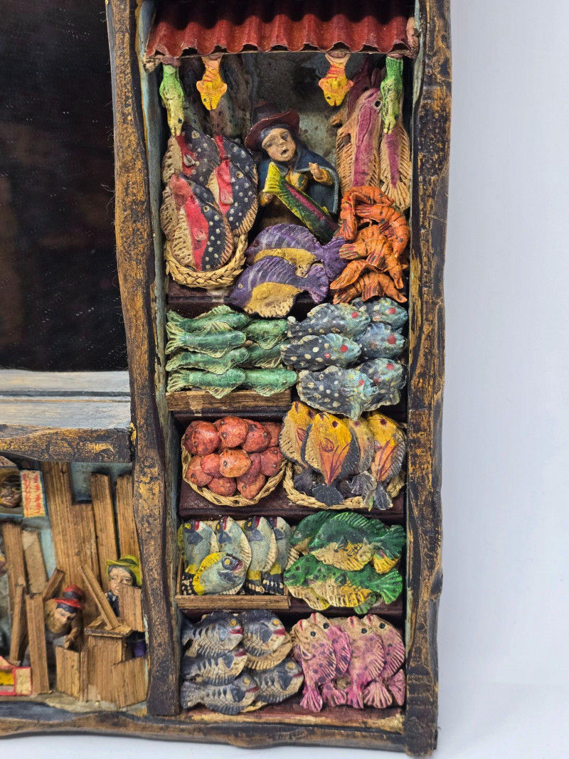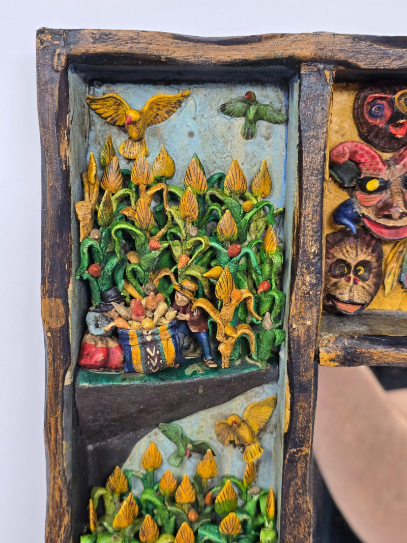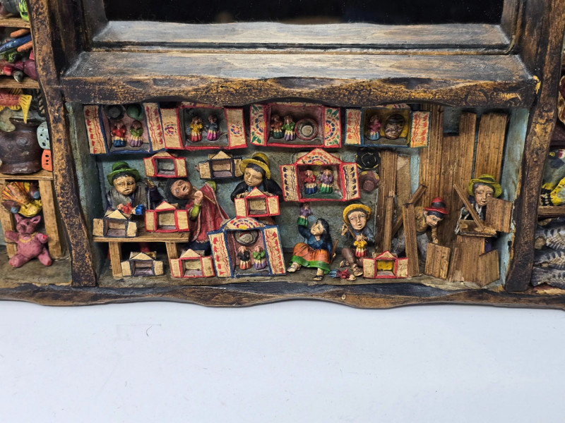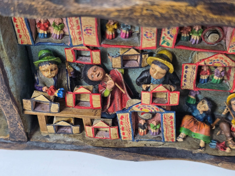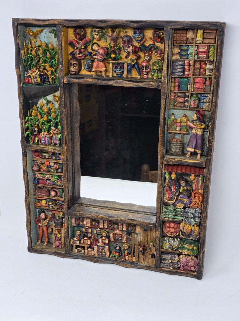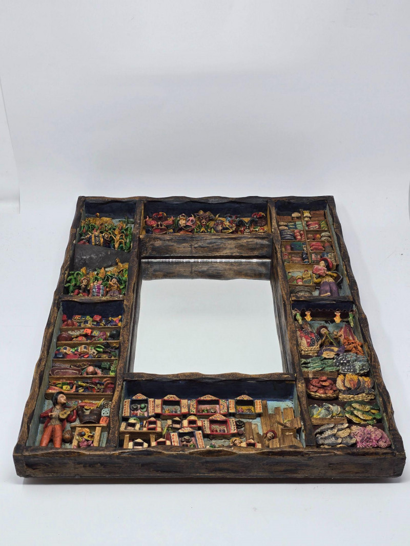 This example features a painted border composed of multiple vignettes, including village streets, market vendors, and people working in surrounding fields. Each scene is individually framed within the decorative border, creating a continuous visual story around the mirror. Mirror surface is clear and intact. Frame shows light wear consistent with age and handling. Backing is present and secure. A strong representation of Peruvian folk craftsmanship and a collectible piece for those interested in Latin American art, narrative decorative objects, or traditional Andean workshop production. Please review all photos for condition and details.