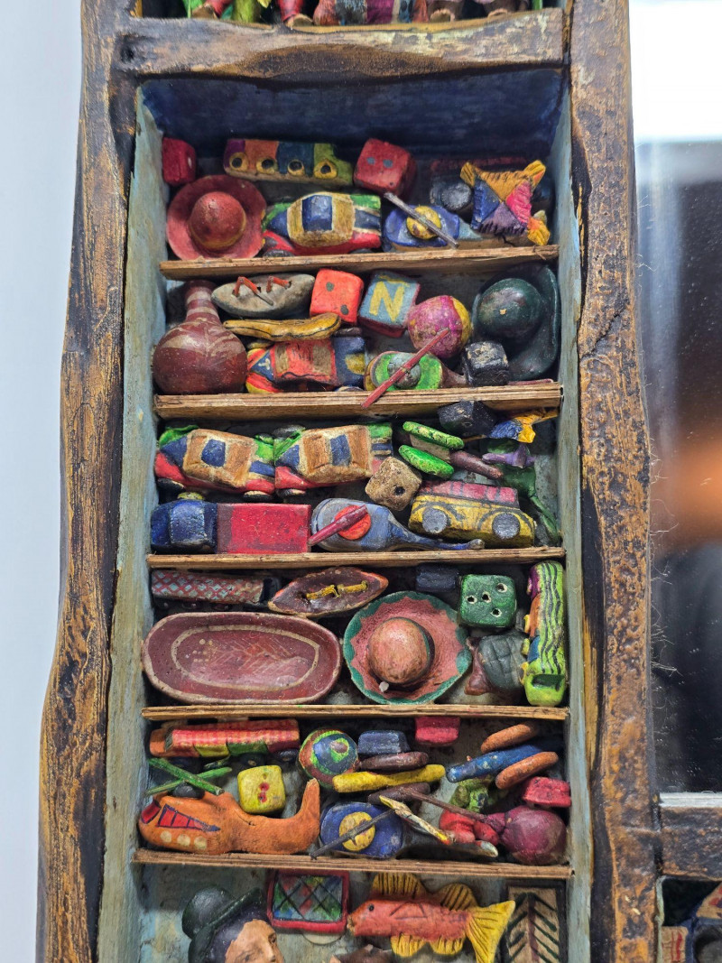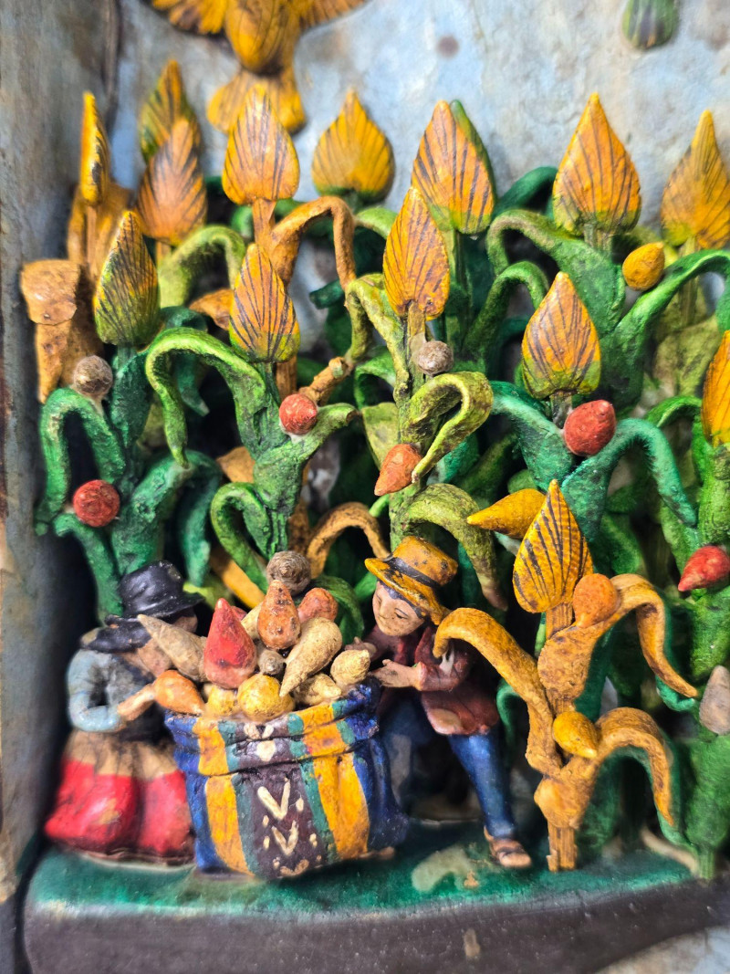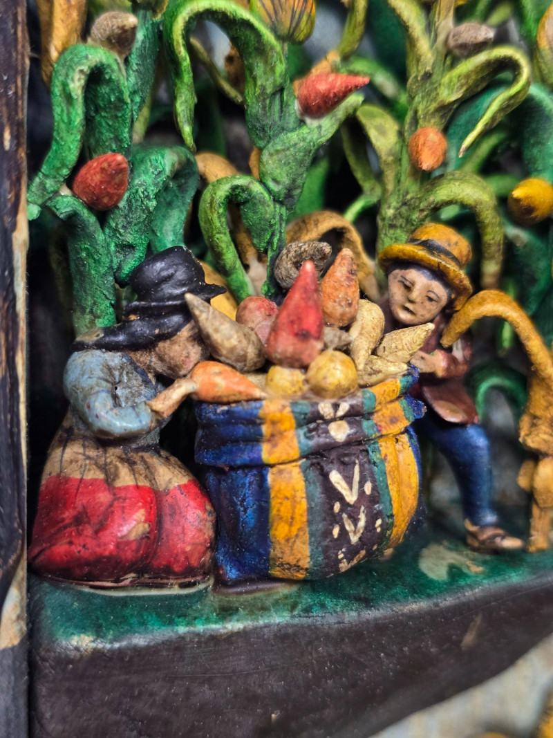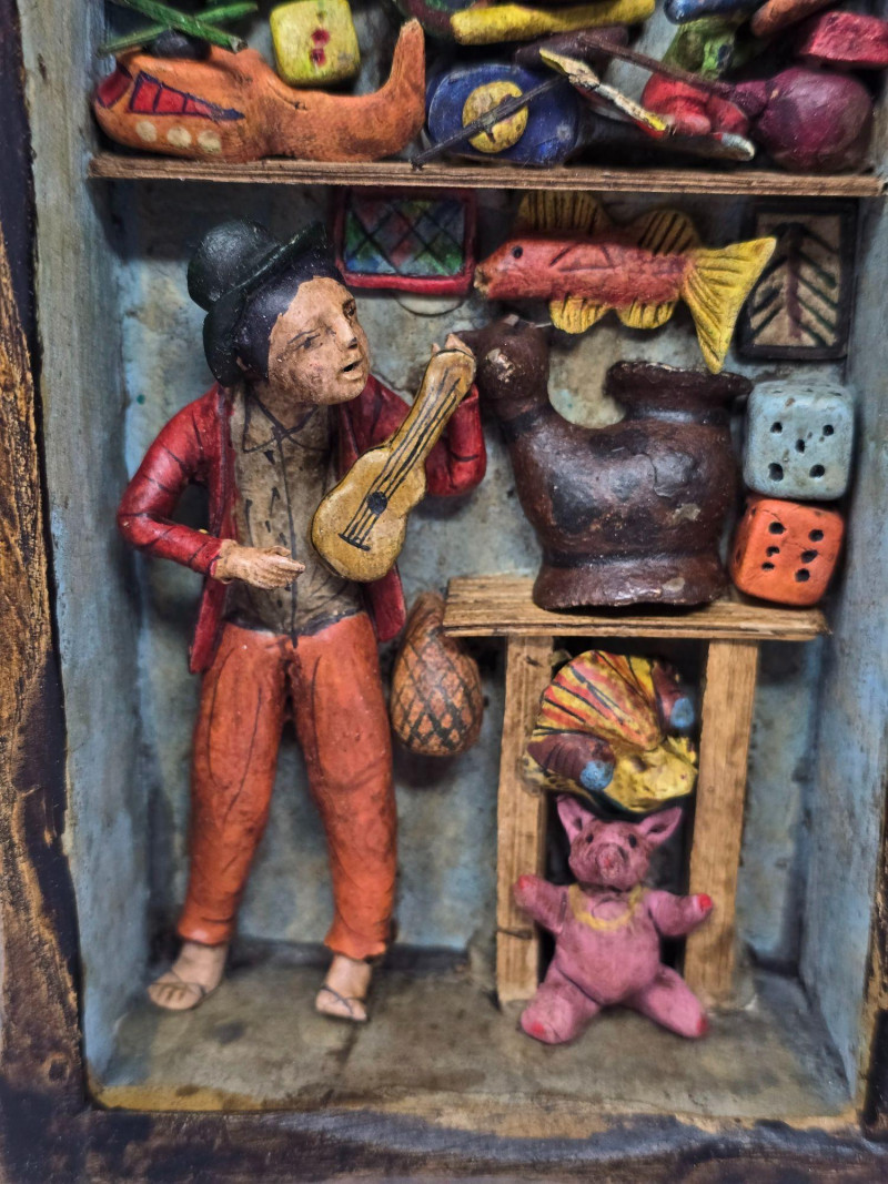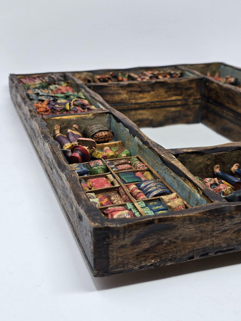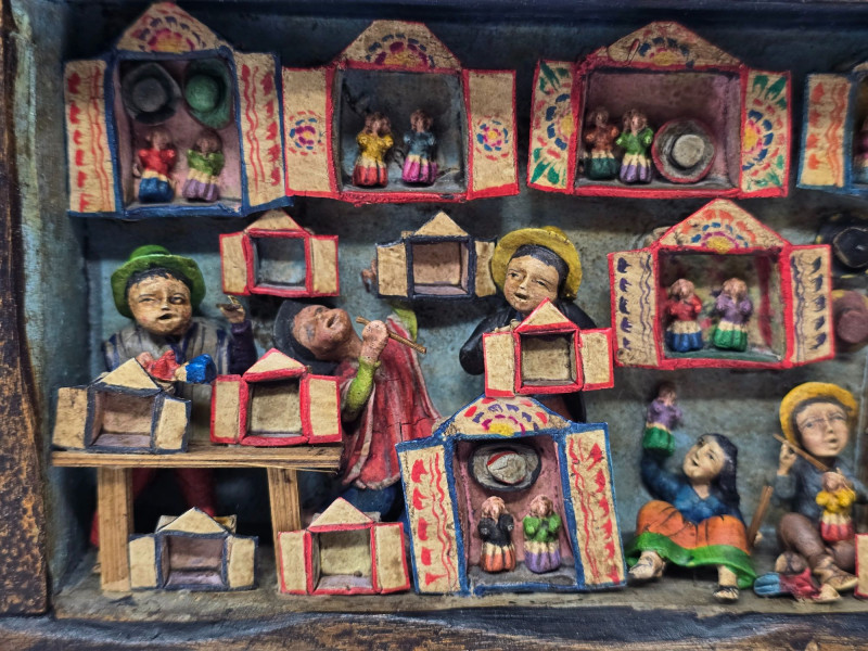 This example features a painted border composed of multiple vignettes, including village streets, market vendors, and people working in surrounding fields. Each scene is individually framed within the decorative border, creating a continuous visual story around the mirror. Mirror surface is clear and intact. Frame shows light wear consistent with age and handling. Backing is present and secure. A strong representation of Peruvian folk craftsmanship and a collectible piece for those interested in Latin American art, narrative decorative objects, or traditional Andean workshop production. Please review all photos for condition and details.