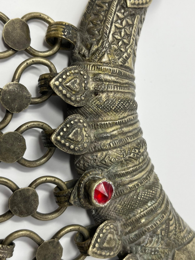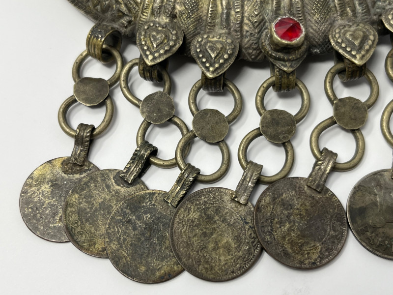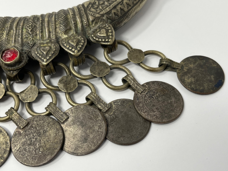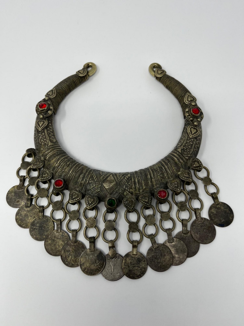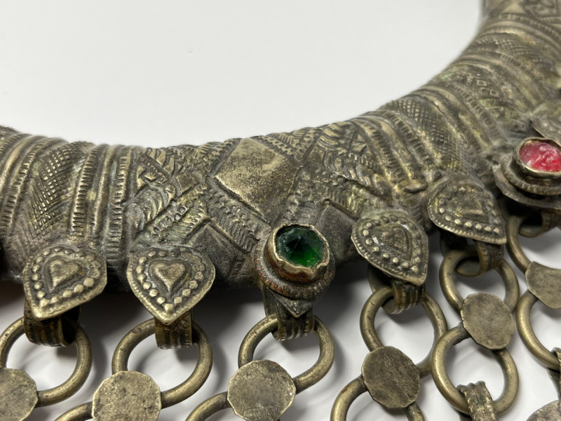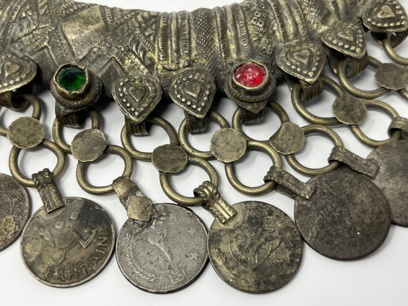 Handcrafted mixed‑metal necklace in the traditional crescent form associated with Kuchi tribal adornment. The surface is densely stamped and chased with geometric and floral motifs, framing red and green glass cabochons set in raised bezels. A full row of coin‑form dangles lines the lower edge, creating movement and sound characteristic of regional nomadic jewelry. This piece reflects the visual language of mid‑20th‑century Afghan and Northern Pakistani tribal workshop production, valued for its bold presence, layered textures, and culturally rooted design. Wear and patina consistent with age and use. A strong example for collectors of global, tribal, and ethnographic jewelry traditions.