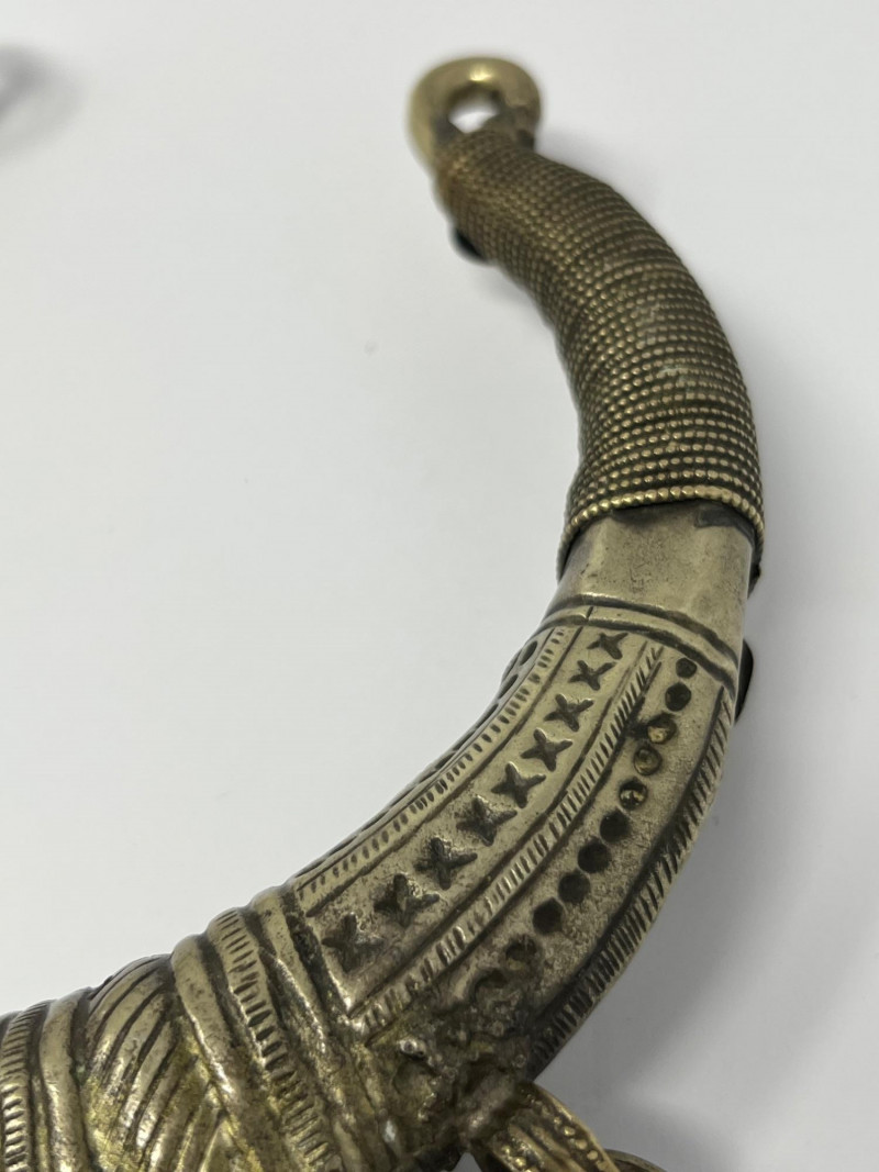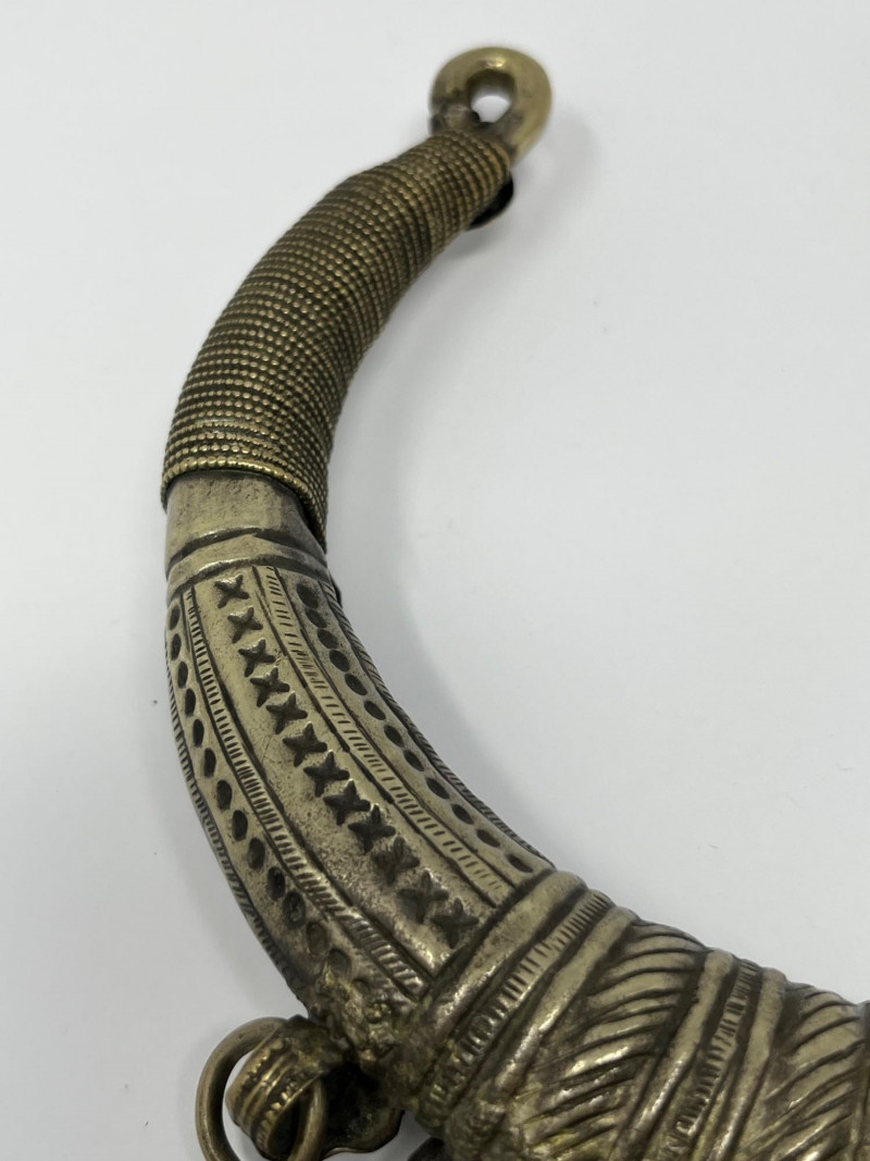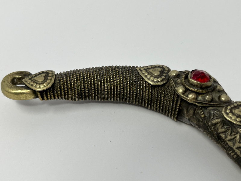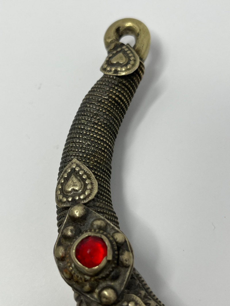 Handcrafted mixed‑metal necklace in the traditional crescent form associated with Kuchi tribal adornment. The surface is densely stamped and chased with geometric and floral motifs, framing red and green glass cabochons set in raised bezels. A full row of coin‑form dangles lines the lower edge, creating movement and sound characteristic of regional nomadic jewelry. This piece reflects the visual language of mid‑20th‑century Afghan and Northern Pakistani tribal workshop production, valued for its bold presence, layered textures, and culturally rooted design. Wear and patina consistent with age and use. A strong example for collectors of global, tribal, and ethnographic jewelry traditions.