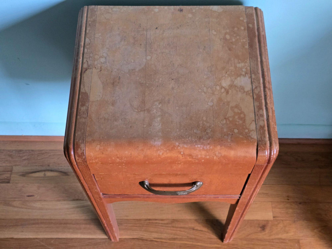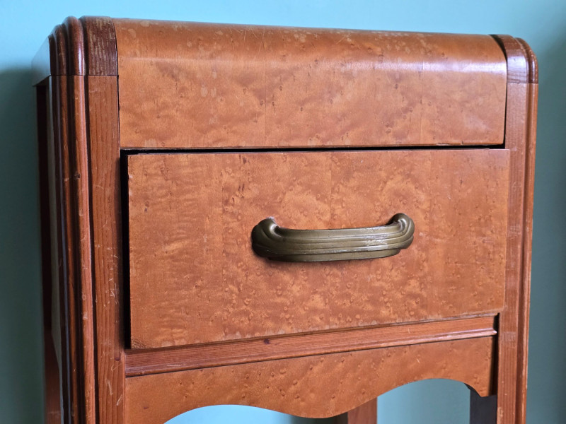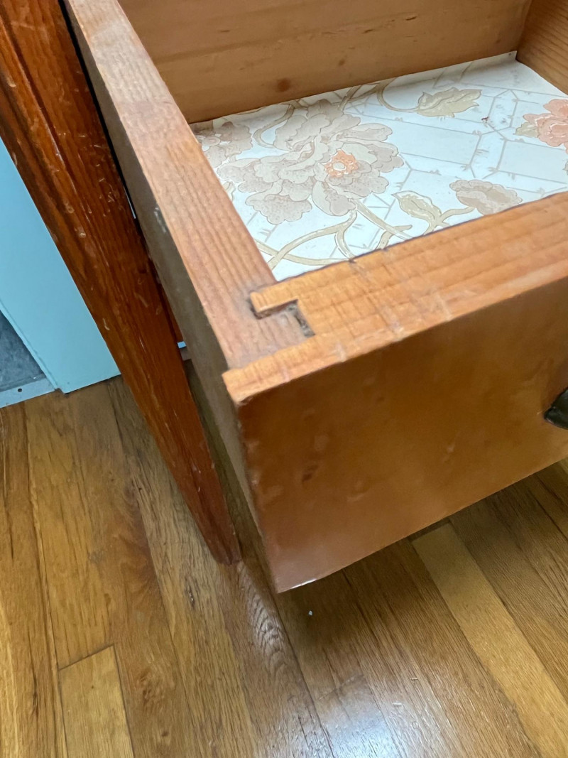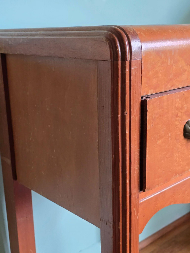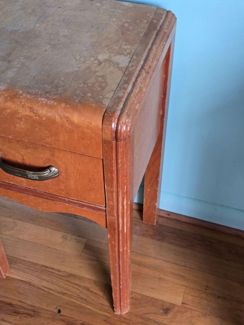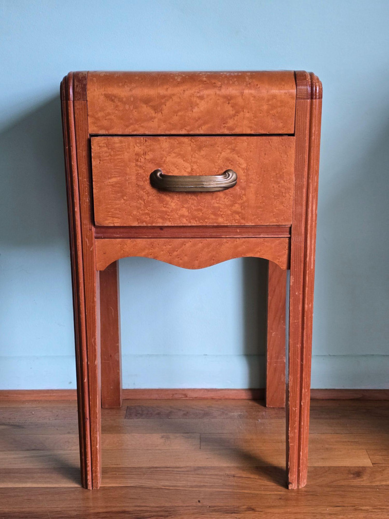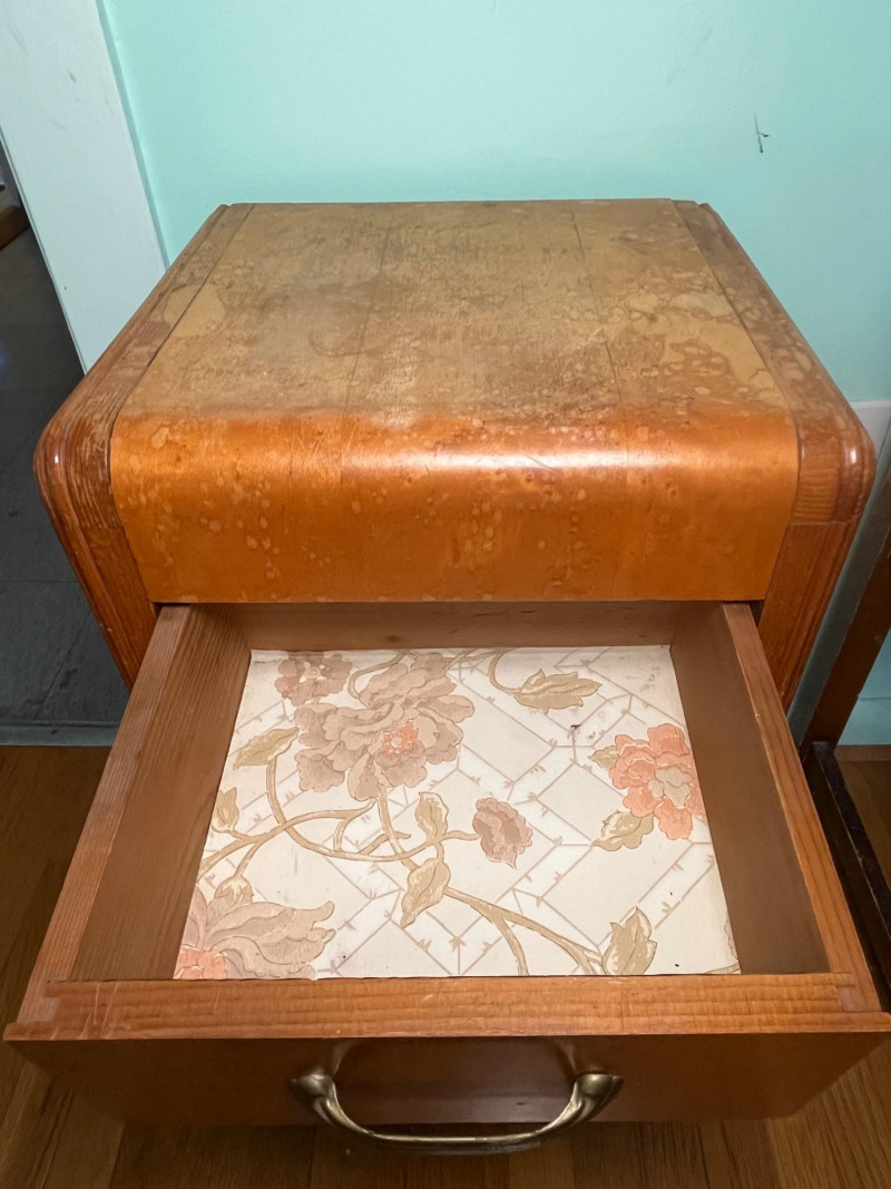A warm, mid‑tone wooden nightstand showcasing classic vintage styling with softly rounded corners, a curved lower apron, and a brass‑tone drawer pull. The piece has an inviting, traditional silhouette that fits naturally into cottage, vintage, or eclectic interiors. The drawer opens smoothly and features floral paper lining, adding a period‑appropriate decorative touch. Surface wear, finish loss, and scattered scratches are present throughout, contributing to its timeworn character and offering strong potential for refinishing or restoration.