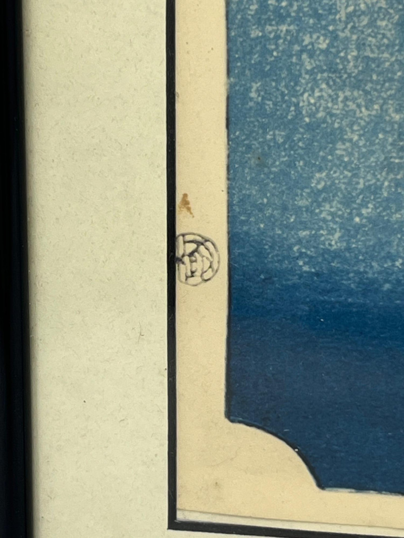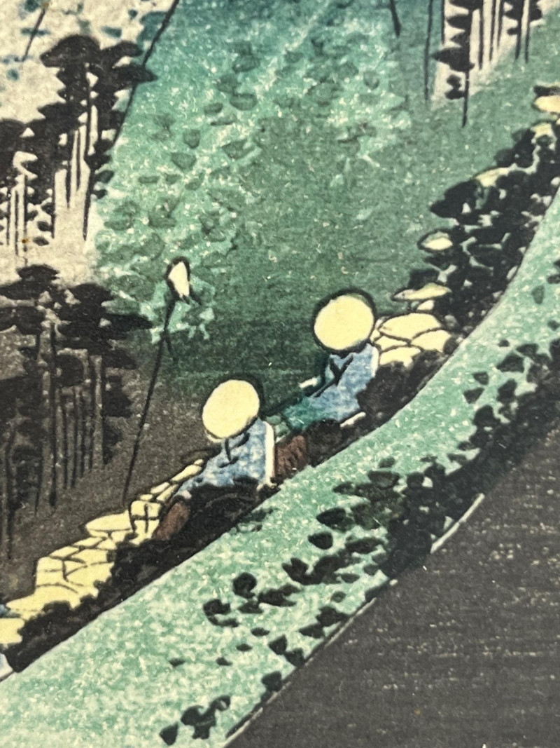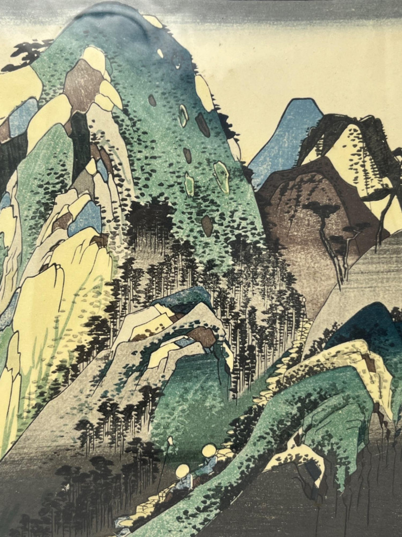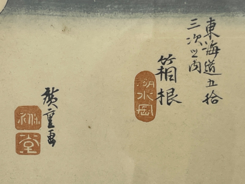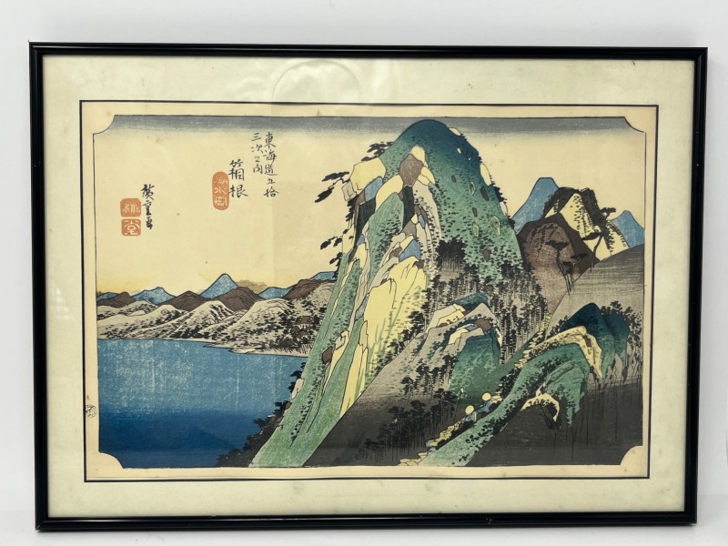 Single Japanese woodblock print from a Seattle estate, depicting the well‑known Hakone lakeside region with travelers along the Tōkaidō road. The composition includes mountainous terrain, deep blue water, and a calligraphic title cartouche with artist seals. Imagery and layout are consistent with later reproductions of Edo‑period designs attributed to Utagawa Hiroshige’s Fifty‑Three Stations of the Tōkaidō series. Presented in a simple frame with a neutral mat that highlights the print’s color and linework. Suitable for collectors of Japanese prints, students of ukiyo‑e, and buyers seeking traditional landscape art. Condition:
