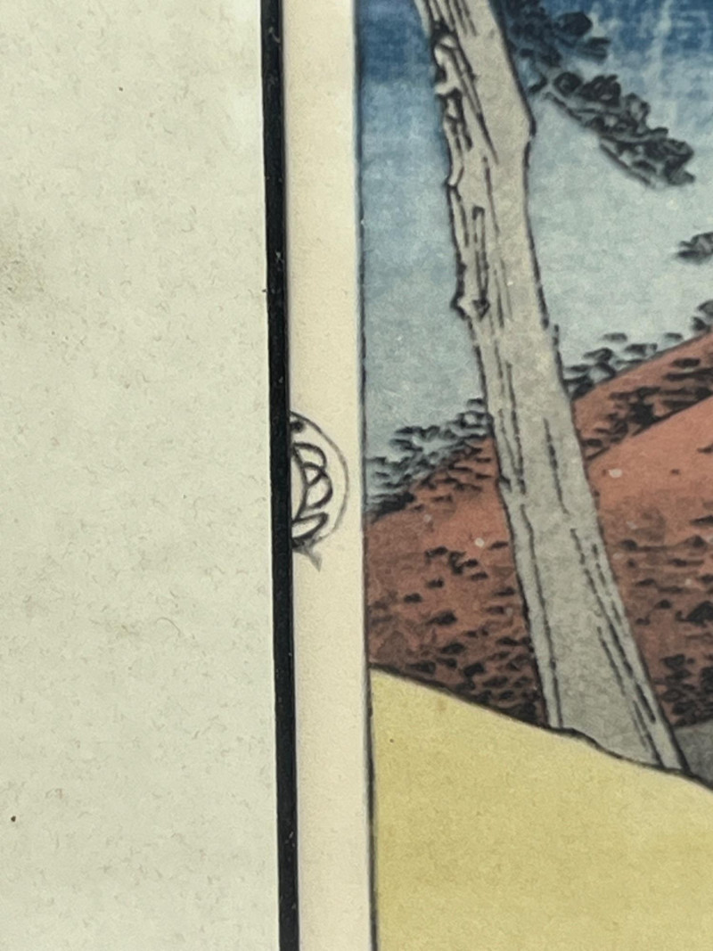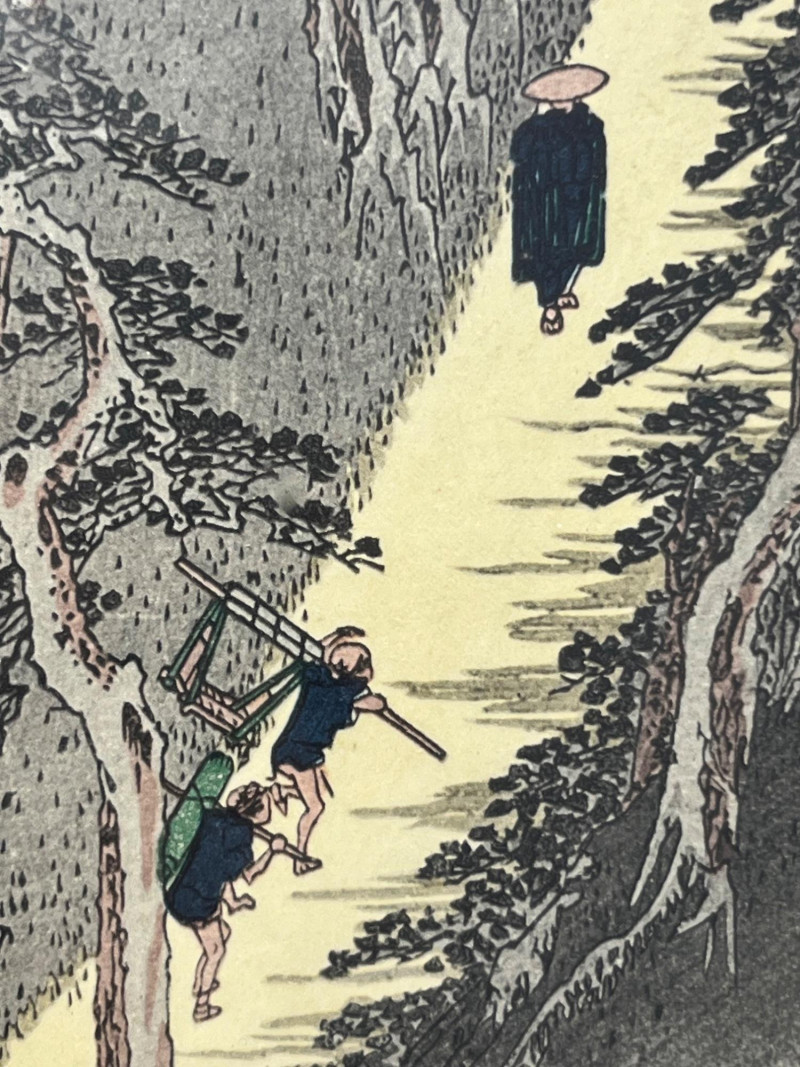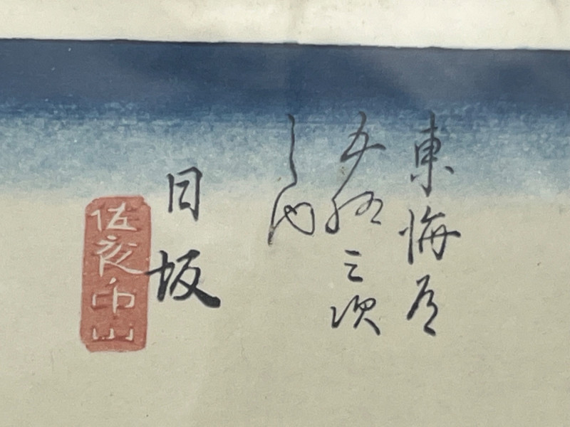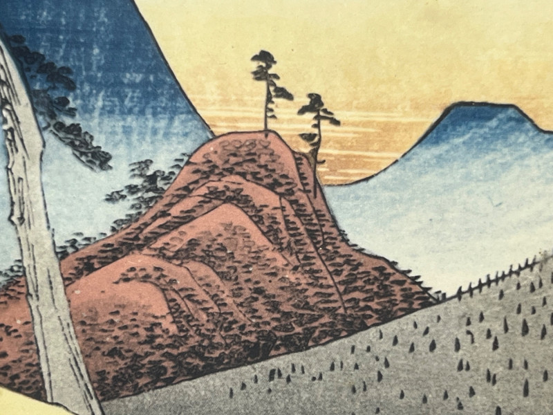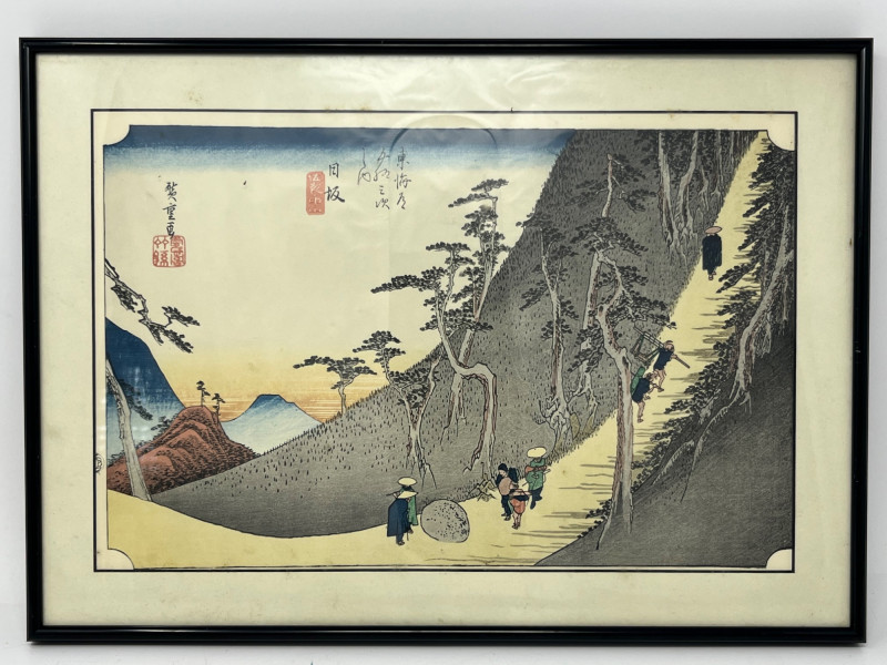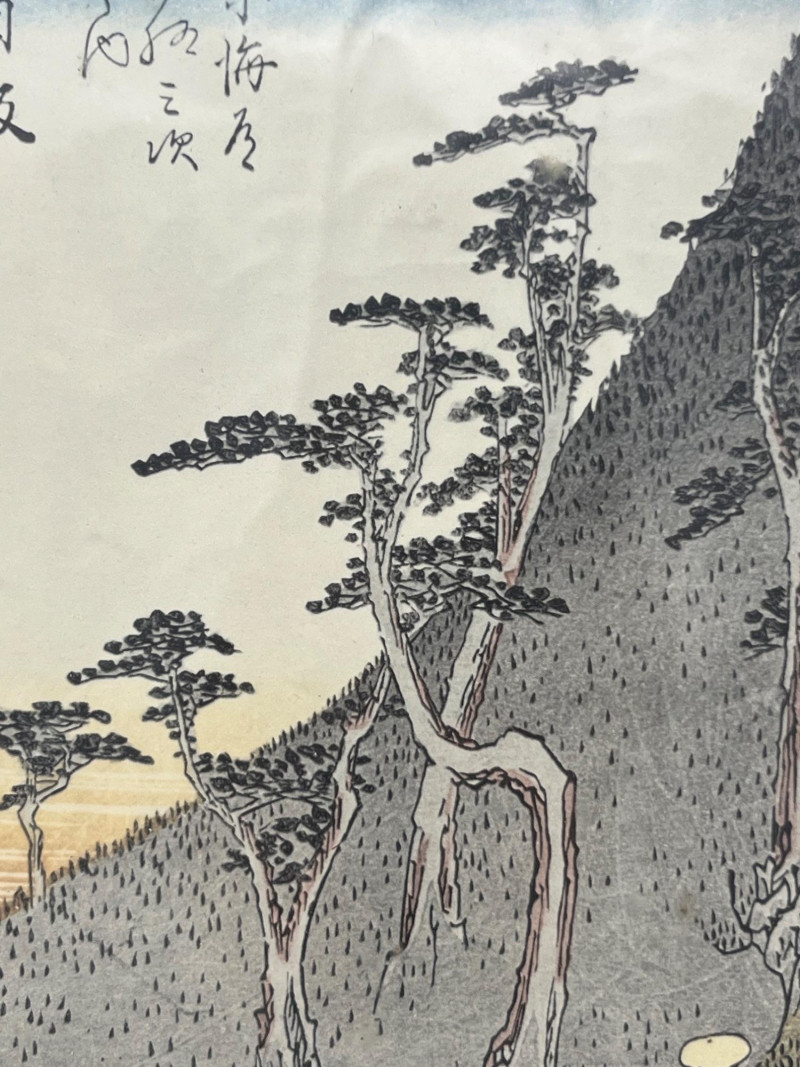 Traditional Japanese woodblock print depicting the Okazaka station along the historic Tōkaidō route. The scene features travelers on a mountain path, curved pines, and distant peaks, rendered in the classic landscape style associated with Utagawa Hiroshige’s Tōkaidō Meisho no Uchi series. This example includes visible title cartouche, artist inscription, and red seals. Close‑up details show clear linework, color transitions, and block‑printed textures consistent with later‑period reproductions of Hiroshige designs. Framed presentation with full view of the print and multiple detailed sections highlighting figures, trees, and inscriptions. A decorative and collectible piece for those interested in Japanese prints, ukiyo‑e landscapes, and Tōkaidō‑themed imagery. Condition
