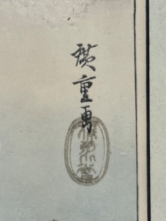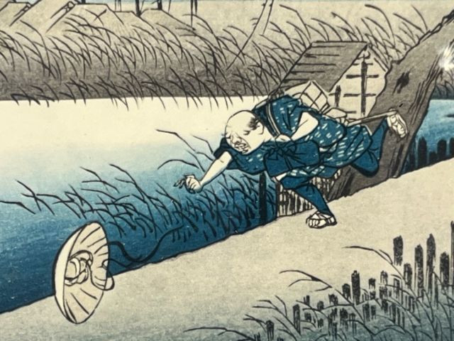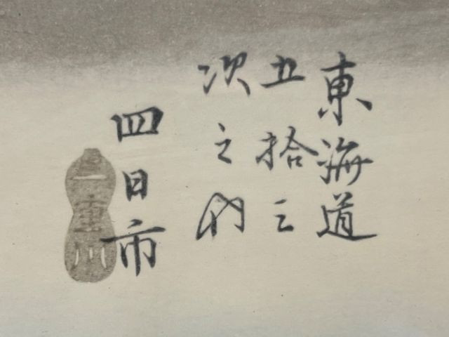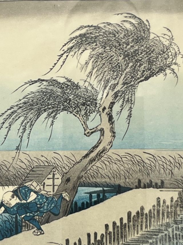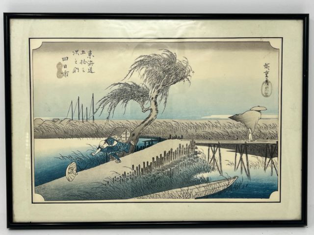 A classic Hiroshige landscape from his celebrated Tōkaidō series, depicting travelers along the riverbank at Yokkaichi. The composition features a windswept willow, a lone figure on the path, and another bending near the water’s edge, rendered in the soft blue‑gray palette characteristic of the artist’s atmospheric scenes. This lot includes detailed views of the print’s calligraphy and seals, including the series title cartouche and Hiroshige’s signature. The work reflects the artist’s refined approach to everyday travel scenes, emphasizing movement, weather, and the quiet rhythm of rural life. Details Original subject: Yokkaichi, one of the stations along the historic Tōkaidō route Artist signature and series cartouche visible Traditional ukiyo‑e landscape with figures, willow tree, and river setting From Hiroshige’s most iconic and widely collected series Condition Notes