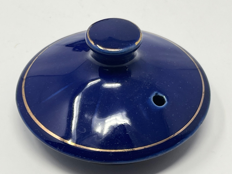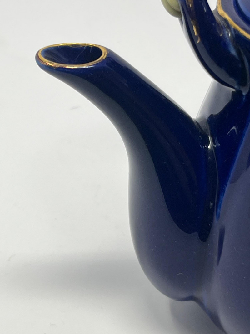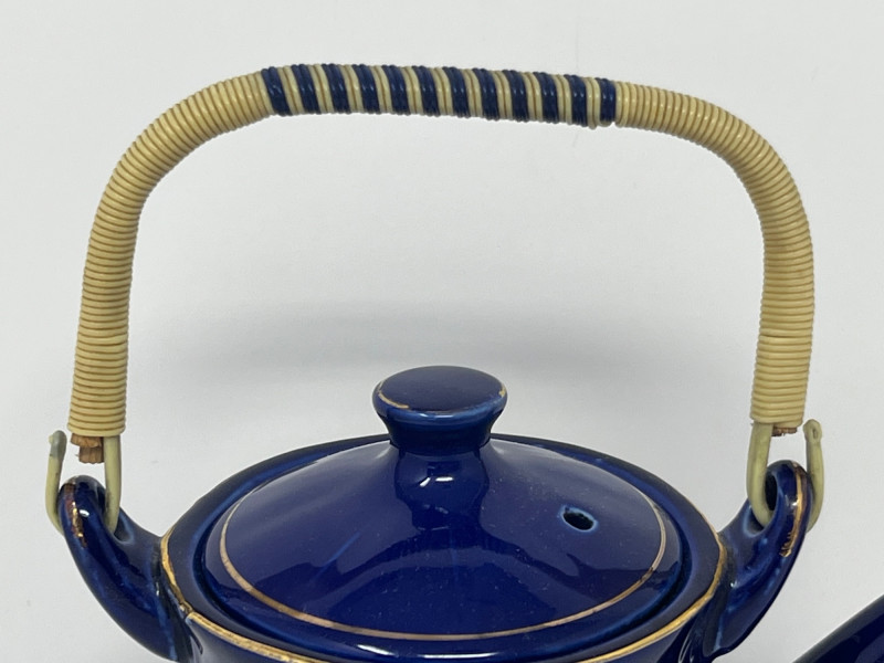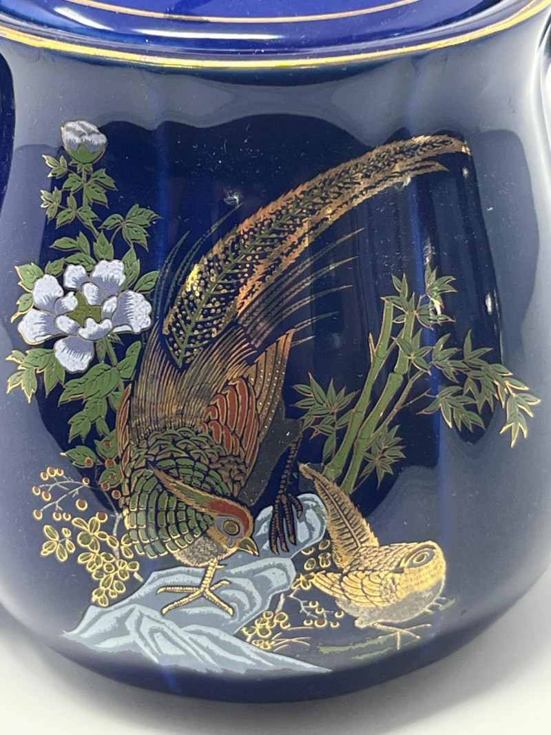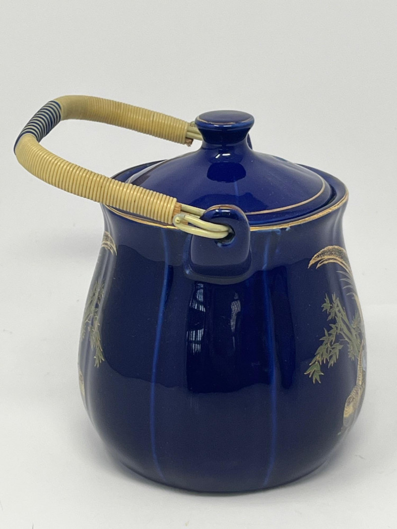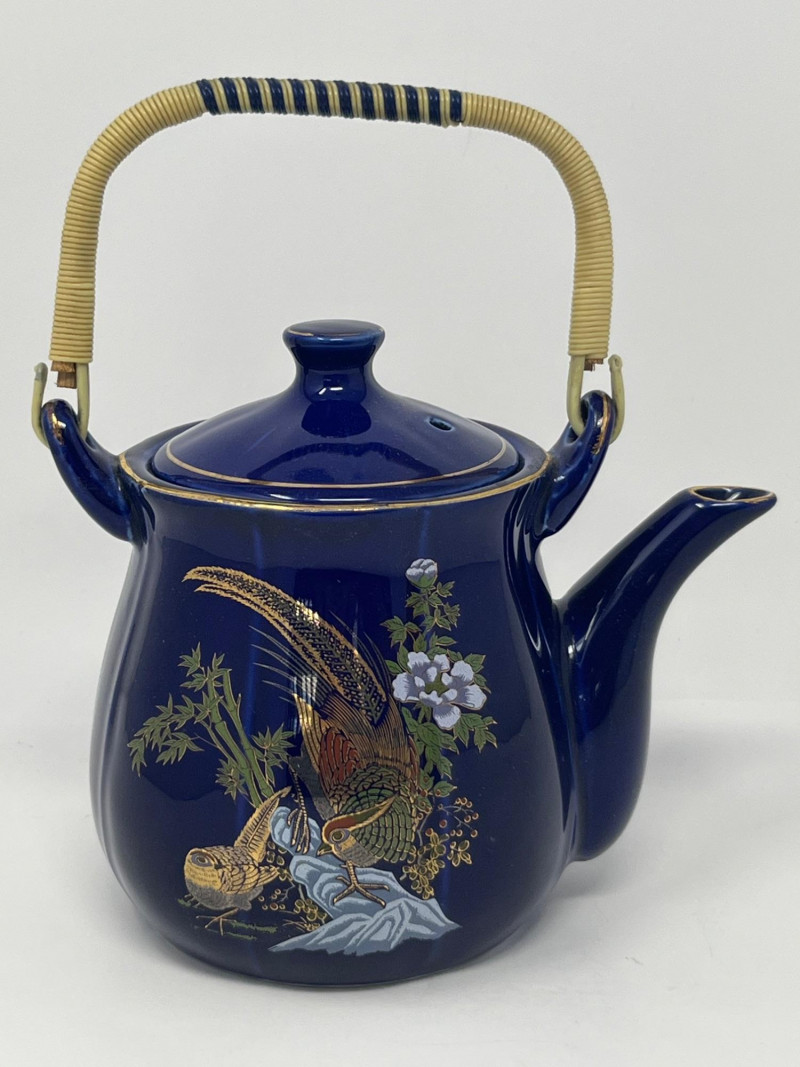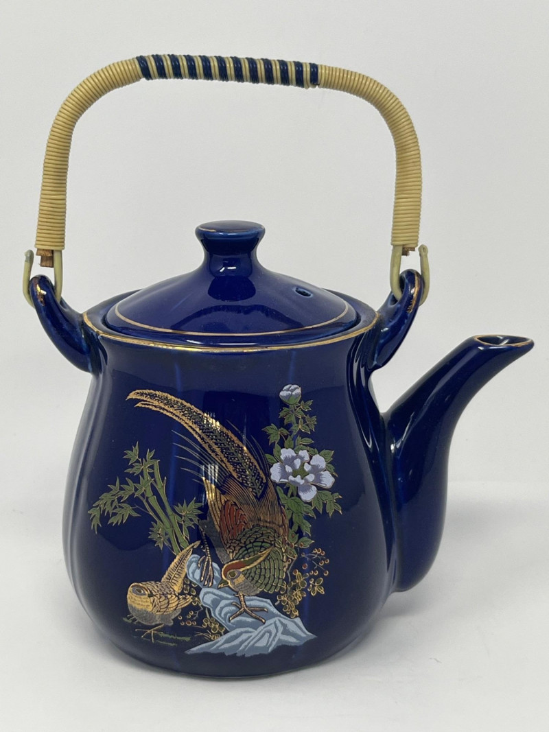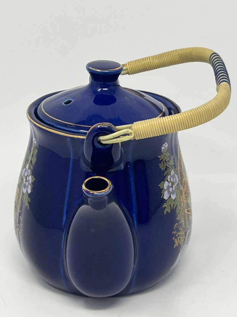 Decorative dark‑blue ceramic teapot featuring a hand‑painted bird-and-floral motif in gold and multicolor accents. The form includes a curved spout, fitted lid with vent hole, and a wrapped handle with contrasting striping. The piece presents well from all angles, with detailed pattern work and a traditional aesthetic suited for display or collection. Condition is consistent with age and prior use. No chips or cracks observed in the provided images. Handle wrapping and painted decoration remain intact. A classic decorative teapot with strong visual appeal and traditional Japanese styling.