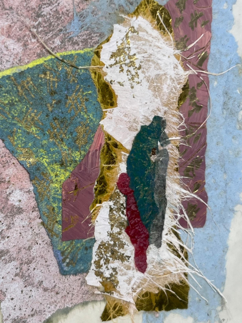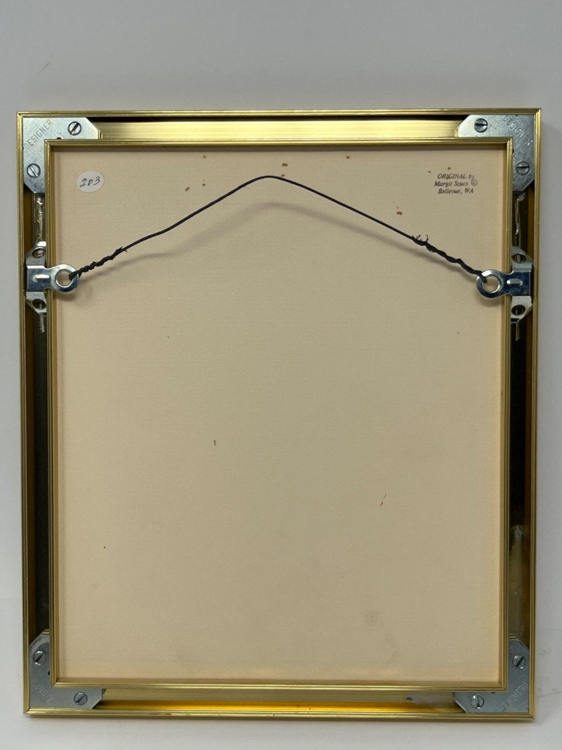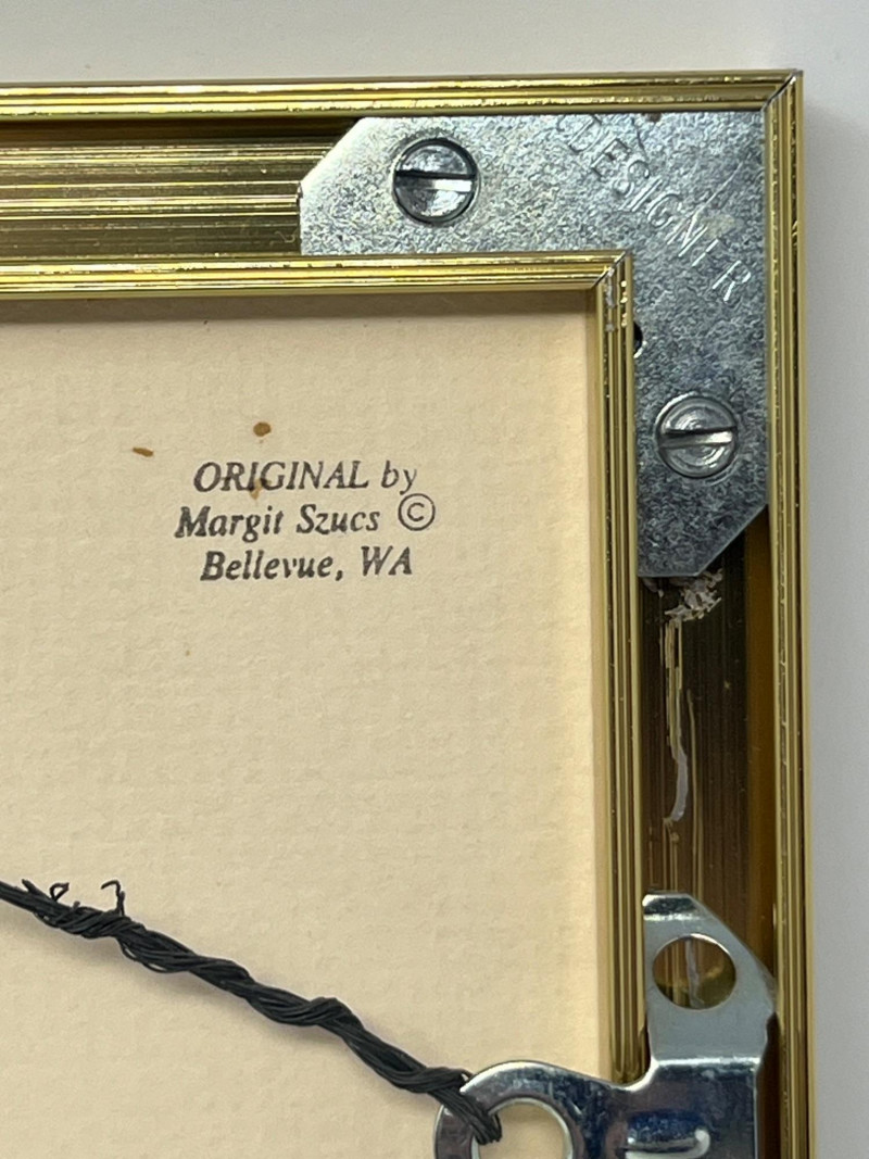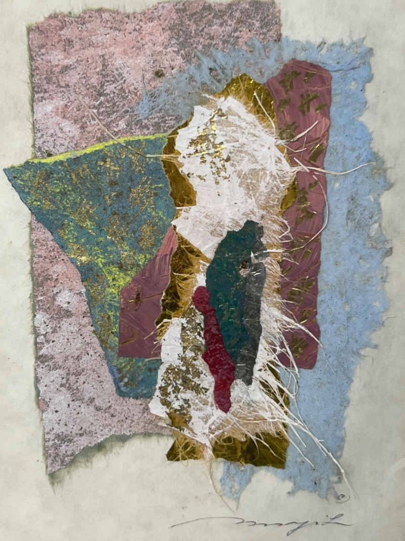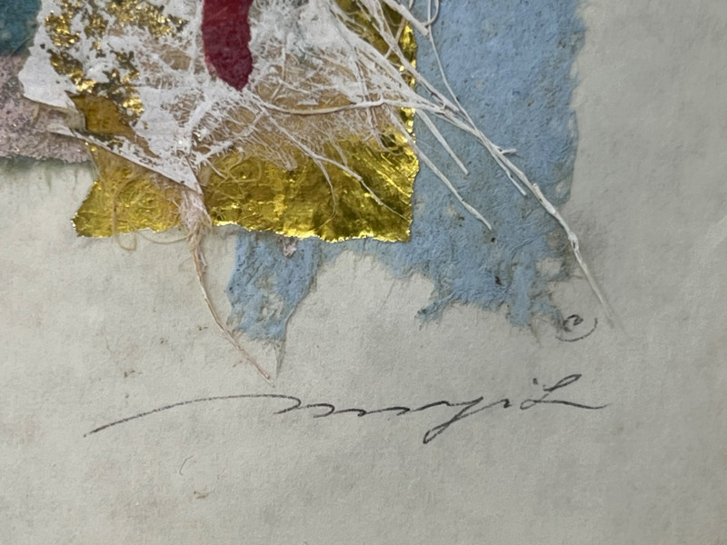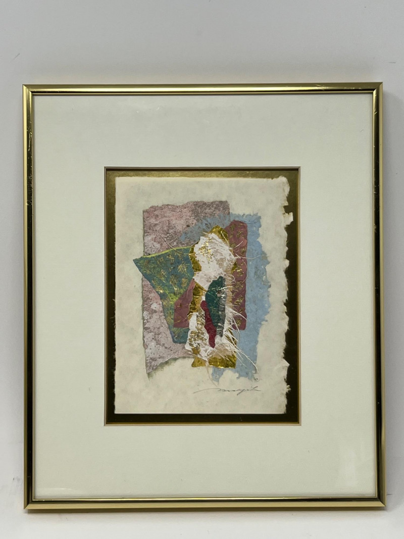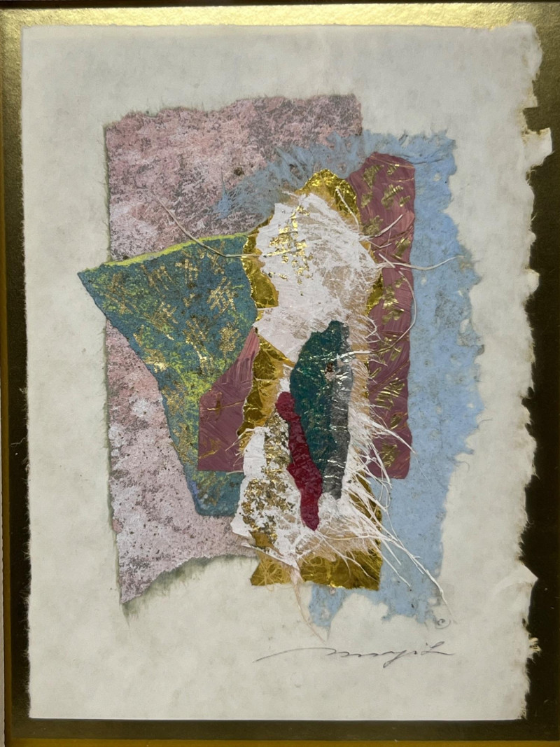 Original framed mixed‑media abstract by Bellevue artist Margit Szucs. The composition features layered handmade and textured papers in blue, pink, cream, and gold, arranged in a vertical collage with torn edges and organic fibers. The dimensional surface and balanced palette create a contemporary decorative presence suited for modern, transitional, and eclectic interiors. The reverse includes the printed artist attribution. Hanging hardware is installed and shown in the photos. The piece appears well‑preserved with no visible condition concerns noted during cataloging. Artist Margit Szucs is a Bellevue, Washington artist known for her mixed‑media paper compositions that emphasize texture, color harmony, and organic layering. Her work often incorporates handmade papers, fibrous materials, and torn‑edge forms to create depth and movement within a structured vertical format. Szucs’ pieces are collected for their calm, modern aesthetic and their ability to complement a wide range of interior styles. Included Framed original mixed‑media artwork with mat and installed hanging hardware.