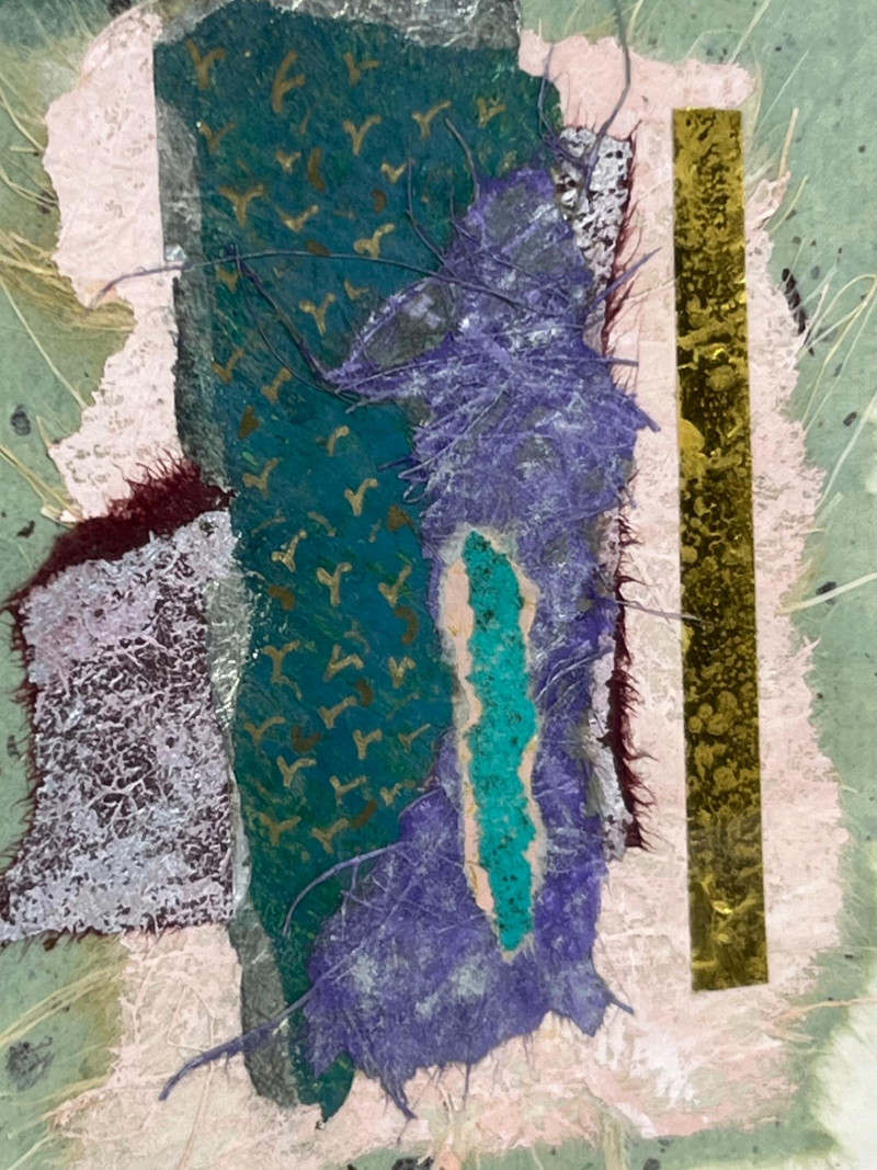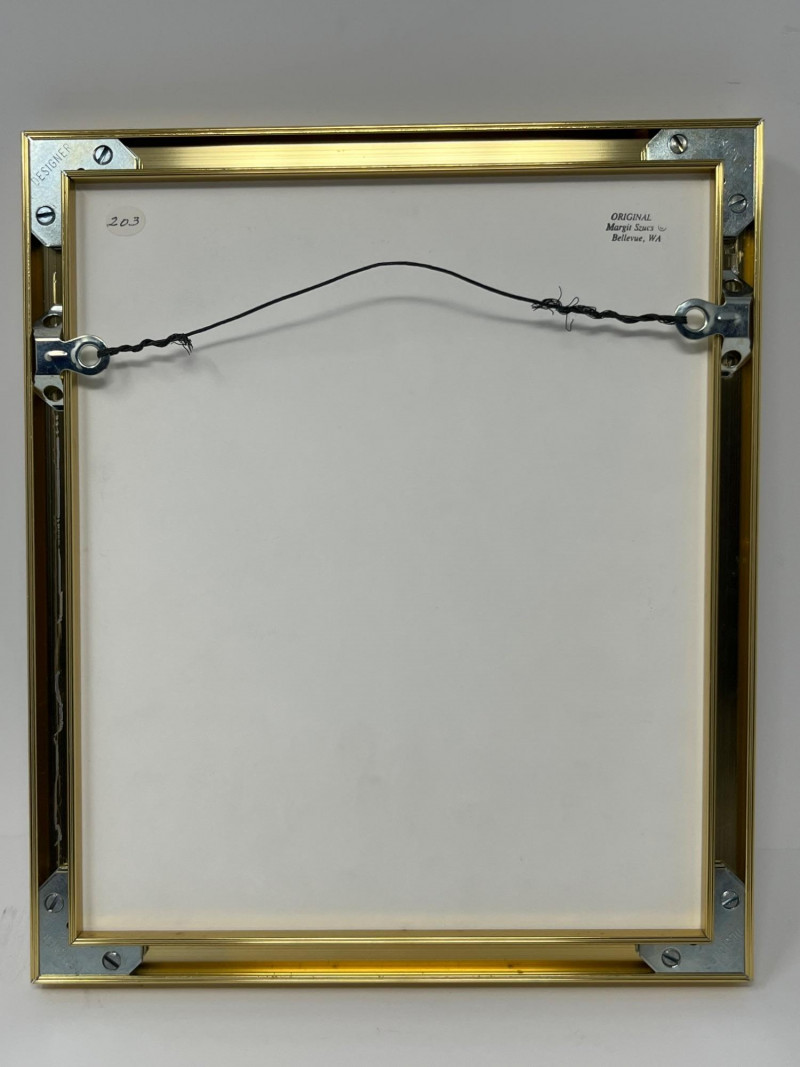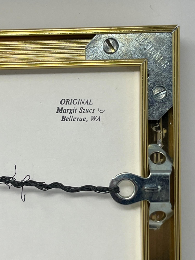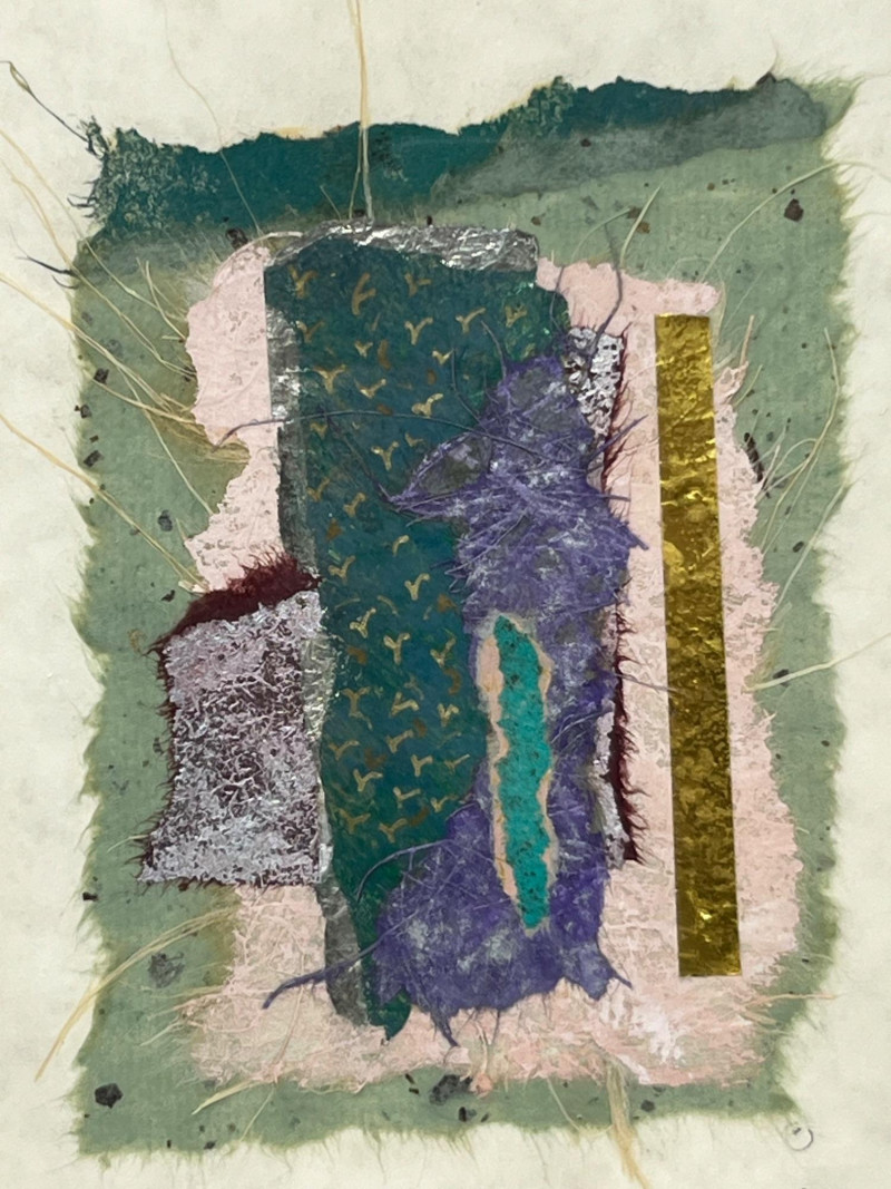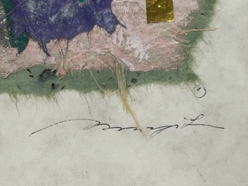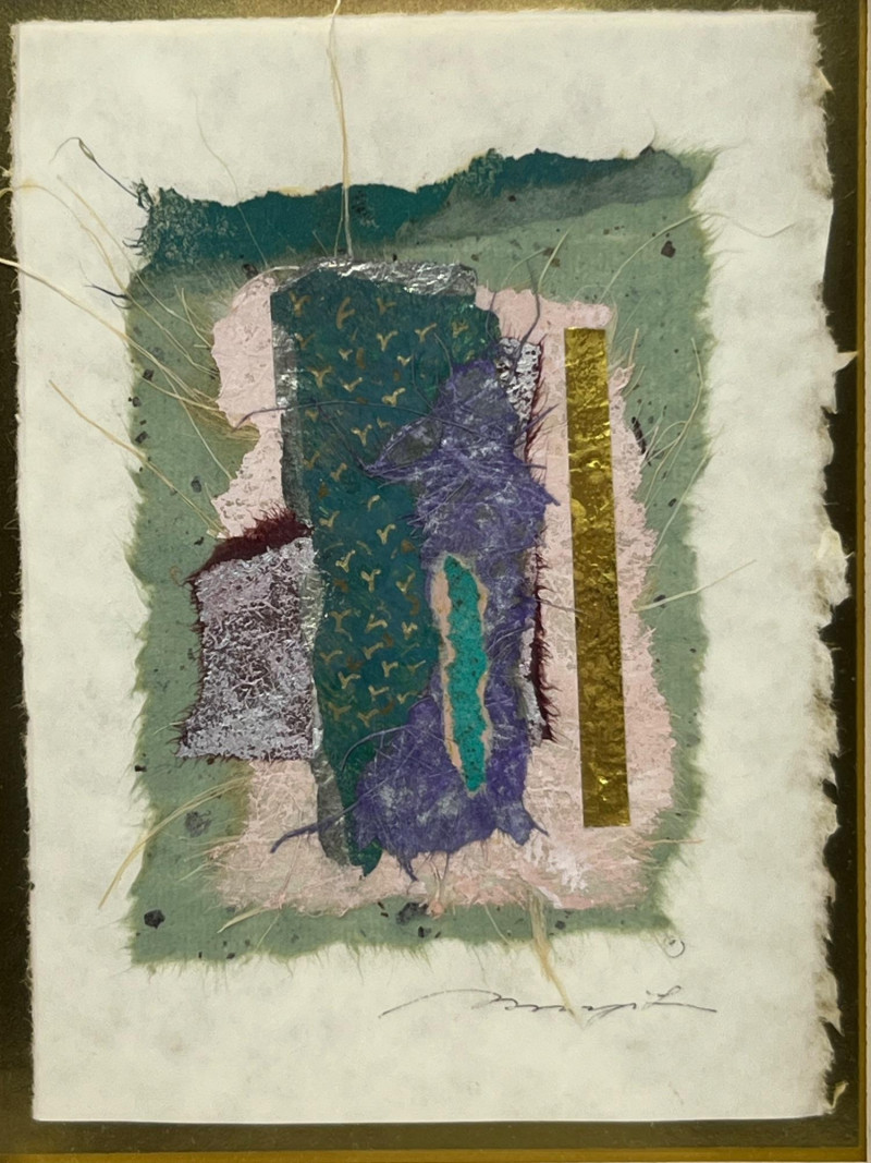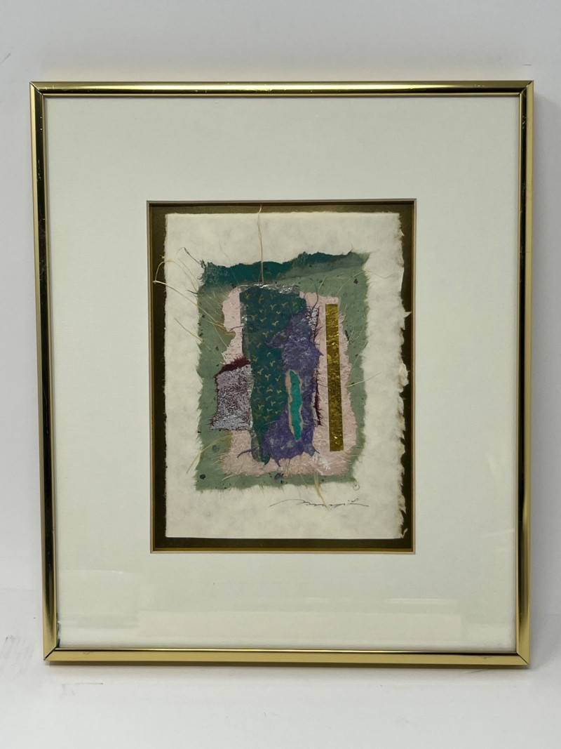 Original framed mixed‑media abstract by Bellevue artist Margit Szucs. The composition features layered handmade and textured papers in green, purple, cream, and gold, arranged in a vertical collage with torn edges and organic fibers. The dimensional surface and balanced palette create a contemporary decorative presence suited for modern, transitional, and eclectic interiors. The reverse includes the printed artist attribution. Hanging hardware is installed and shown in the photos. The piece appears well‑preserved with no visible condition concerns noted during cataloging. Artist Margit Szucs is a Bellevue, Washington artist known for her mixed‑media paper compositions that emphasize texture, color harmony, and organic layering. Her work often incorporates handmade papers, fibrous materials, and torn‑edge forms to create depth and movement within a structured vertical format. Szucs’ pieces are collected for their calm, modern aesthetic and their ability to complement a wide range of interior styles. Included Framed original mixed‑media artwork with mat and installed hanging hardware.