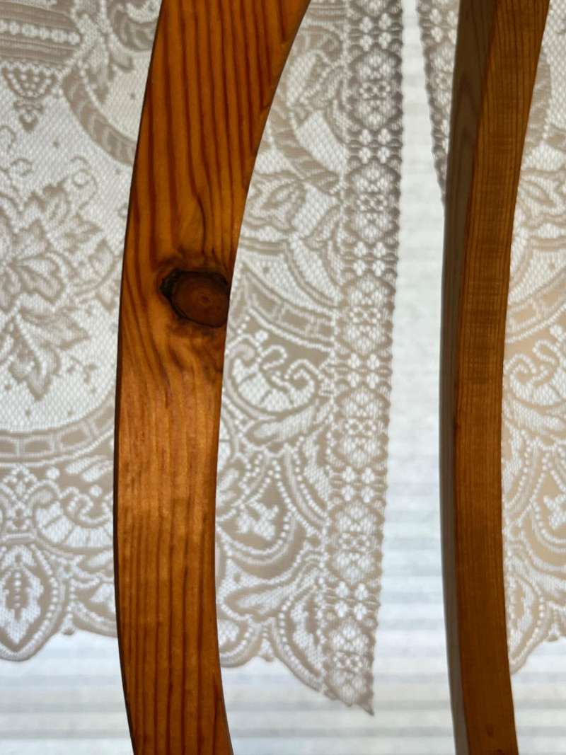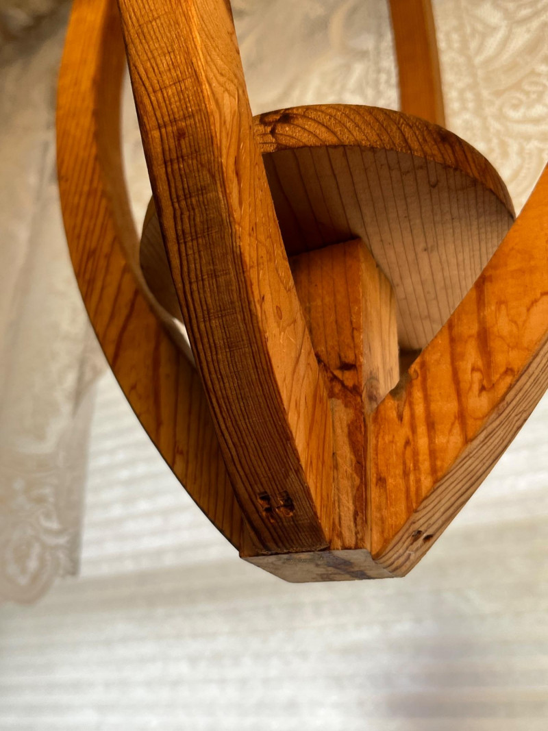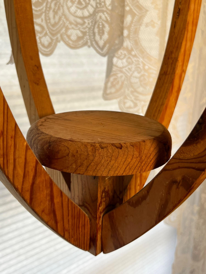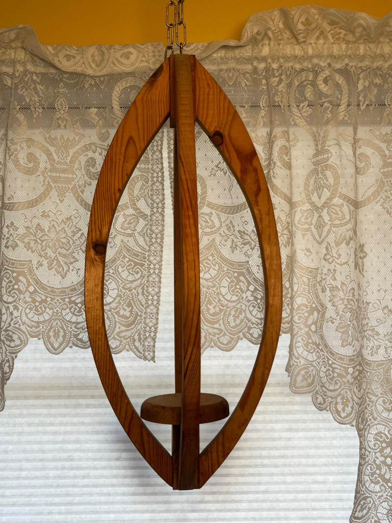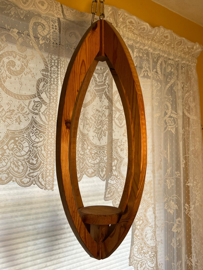 Handcrafted wooden hanging plant holder featuring two elongated curved forms joined at the top and base to create an open sculptural frame. A circular wooden platform is suspended within the lower portion of the structure, designed to hold a small potted plant or decorative botanical accent. The warm natural grain, visible knots, and smooth polished finish highlight the organic character of the wood. The piece hangs from metal hardware and chain at the top, allowing it to display plants with an airy, floating presentation. Its leaf‑like silhouette and natural materials make it suitable for rustic, bohemian, minimalist, and nature‑inspired interiors. Condition consistent with handcrafted wooden décor, with natural variations in tone and surface. Stable and ready for hanging. Ideal for showcasing small houseplants or decorative greenery.Additional Notes