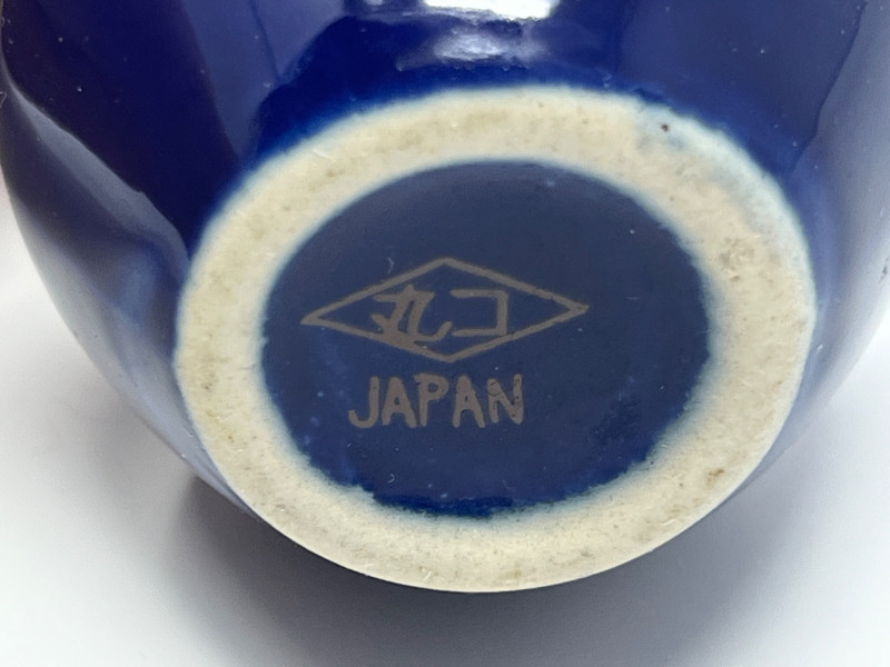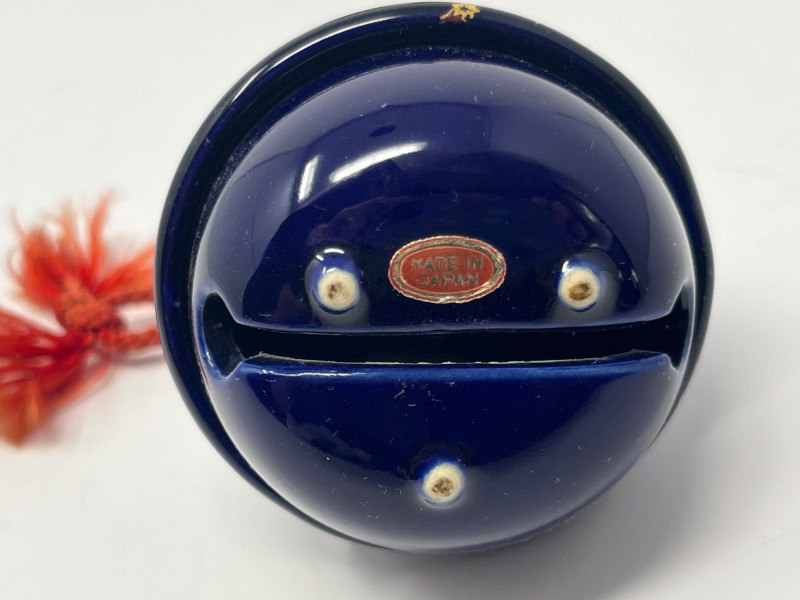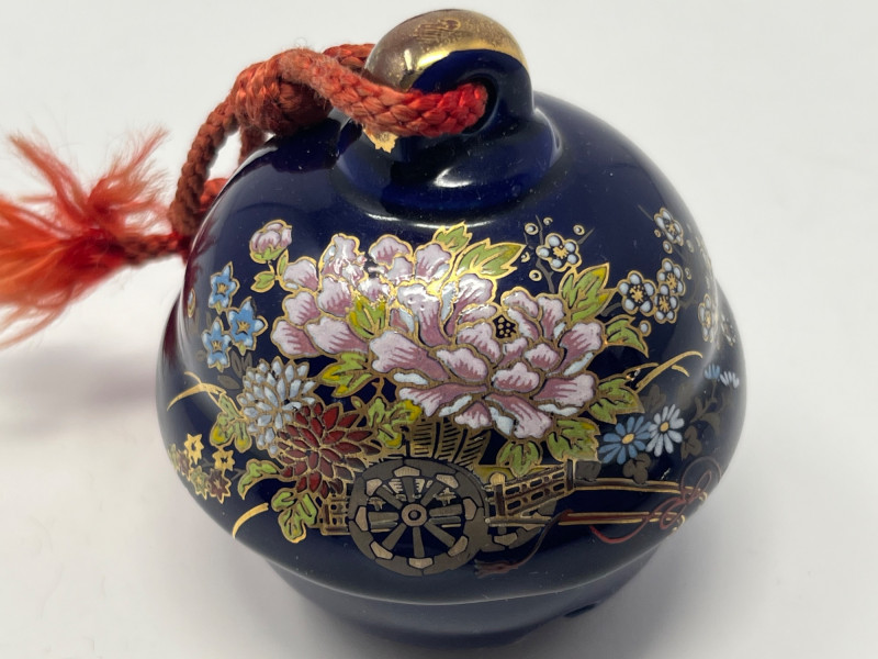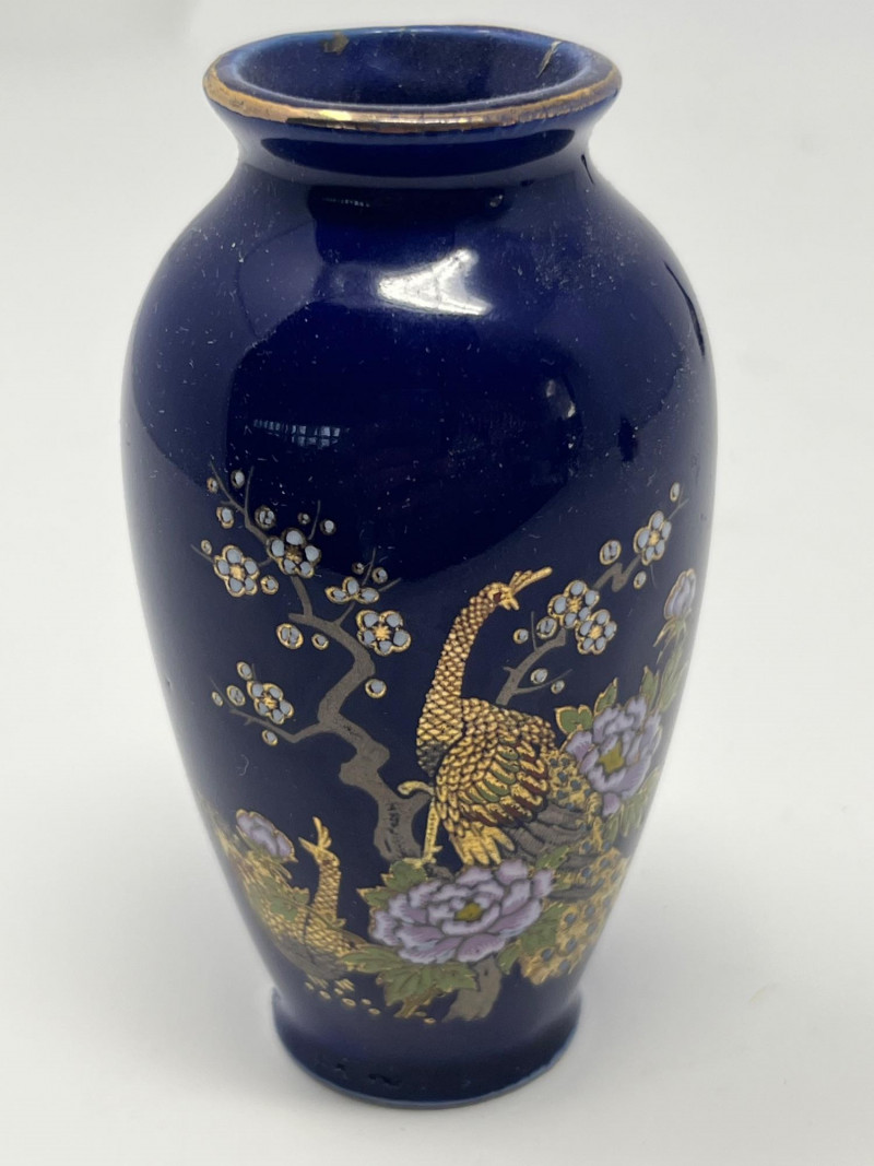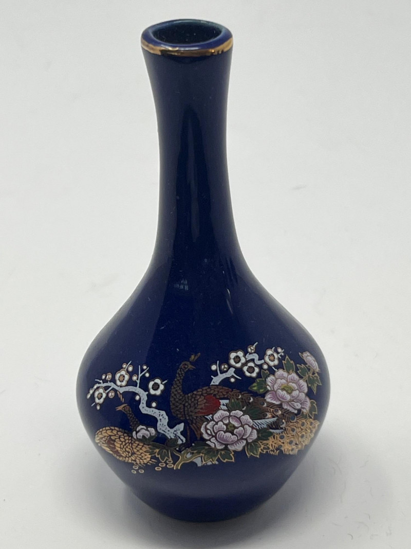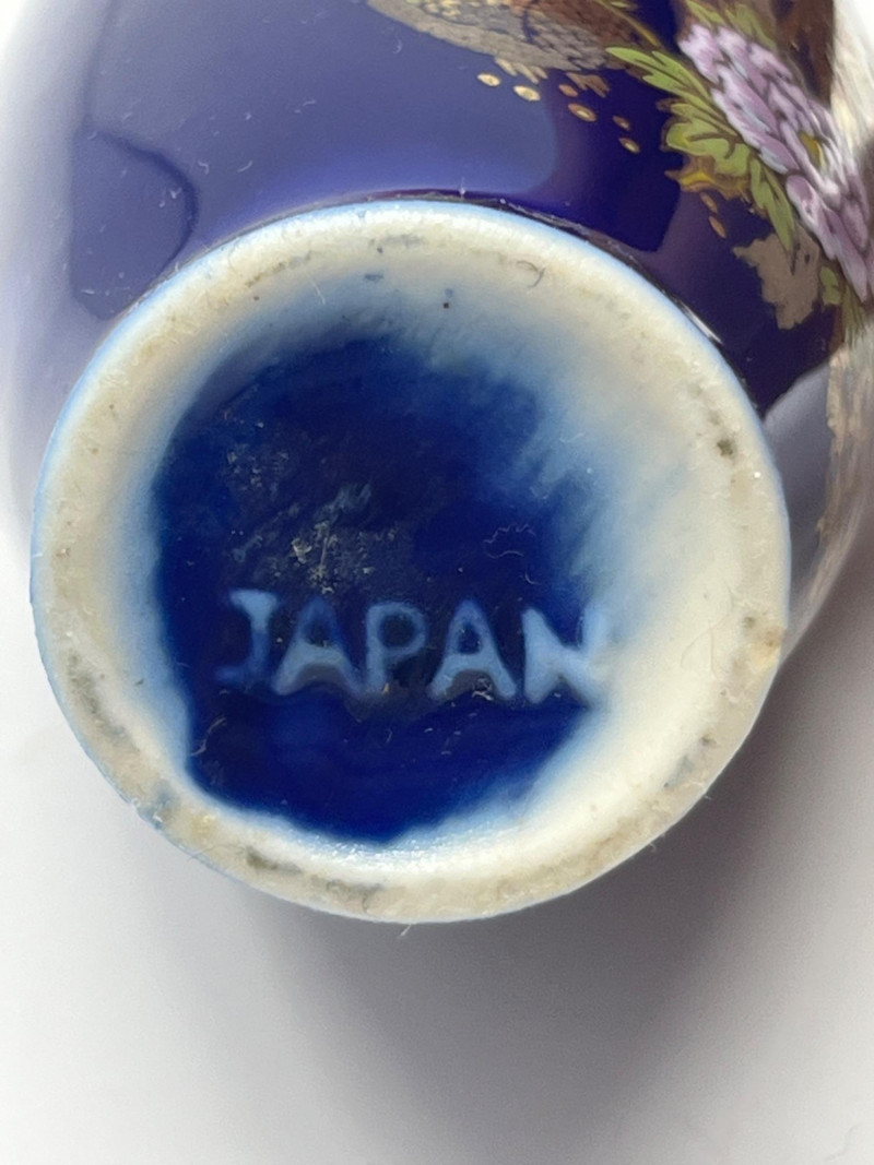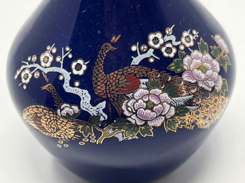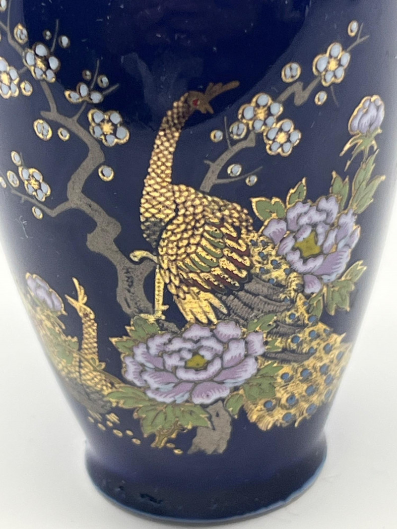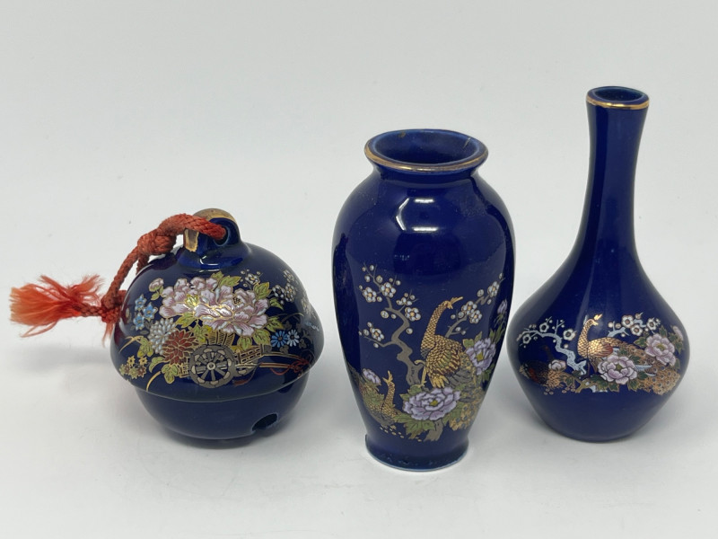 Coordinated trio of Japanese decorative ceramics, each finished in deep cobalt blue with detailed gilt and multicolor hand‑painted motifs. Designs feature peacocks, blossoms, and stylized foliage with bright enamel accents and fine linework. Includes two vases of differing forms—one rounded bottle form with a red tassel and one slender bud‑style vase—along with a matching bell decorated in the same palette and style. All pieces bear underside marks indicating Japanese origin; one base includes a diamond‑shaped maker’s mark above the word Japan, consistent with mid‑century export production. Condition Light surface wear consistent with age. No cracks observed. Gilt and painted details show expected minor handling wear. Presents well as a set.