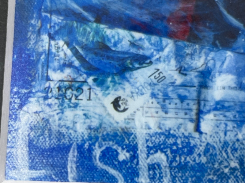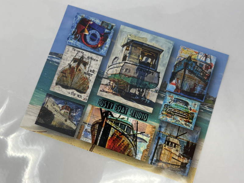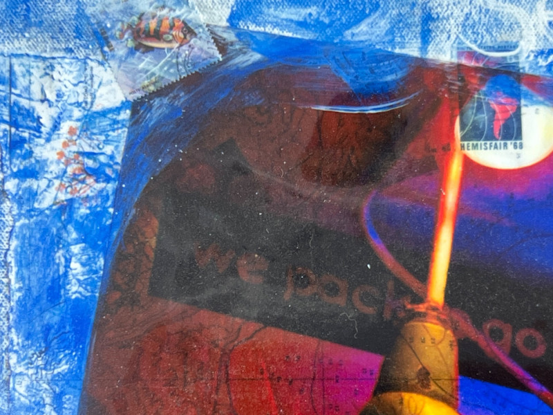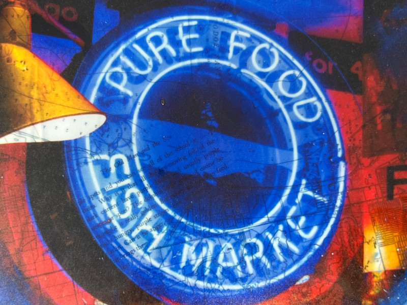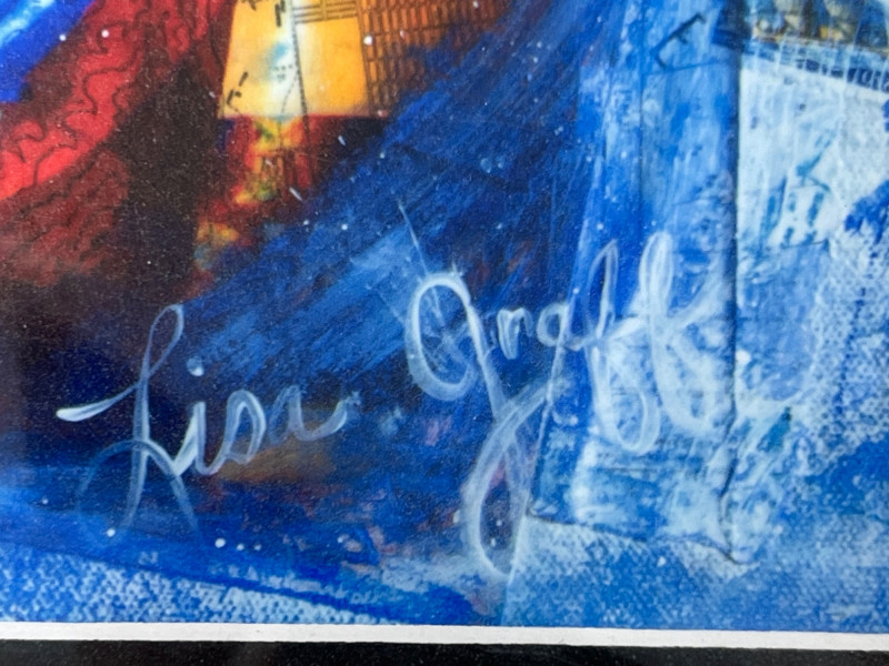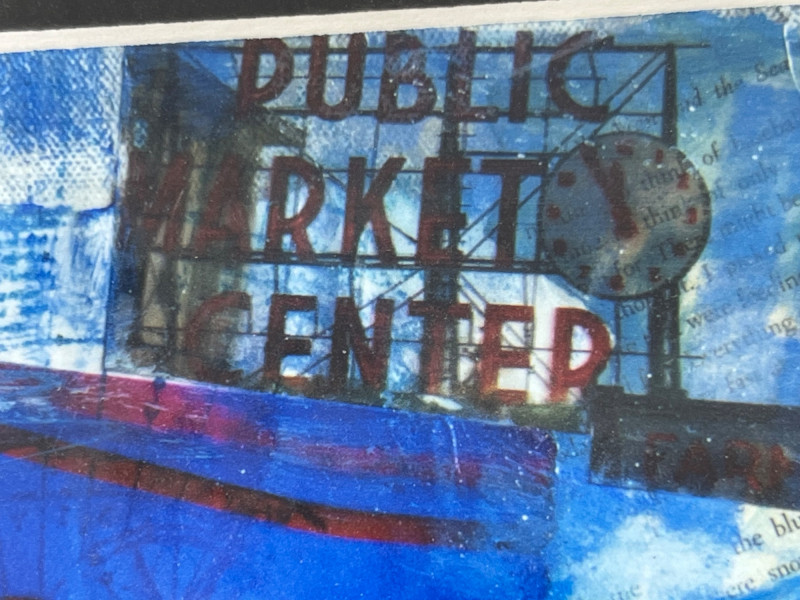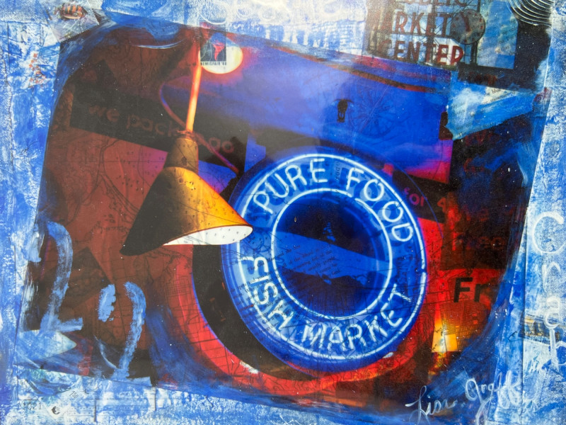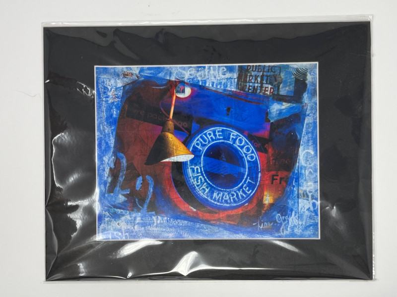 A vibrant contemporary print by artist Lisa Graff, featuring a collage-style composition inspired by iconic Pike Place Market landmarks. The artwork brings together bold blue and red tones, layered signage, and recognizable Seattle imagery including Pure Food Fish Market and the Public Market Center sign. Graff’s mixed-media aesthetic emphasizes graphic forms, urban texture, and the energetic character of the market district. This print offers strong visual impact and is well-suited for collectors of Seattle art, regional themes, or modern illustrative work. Details