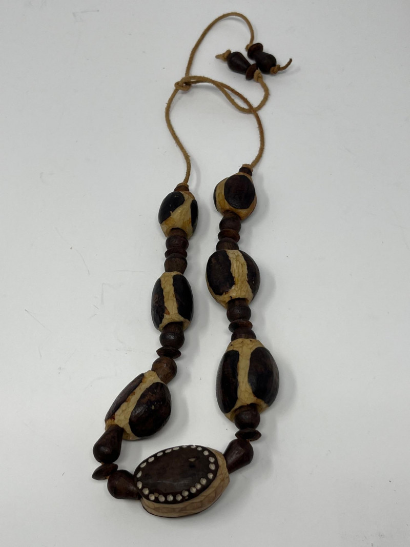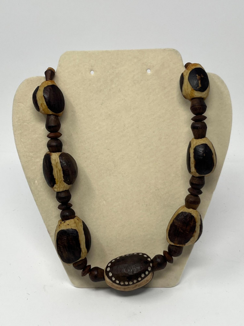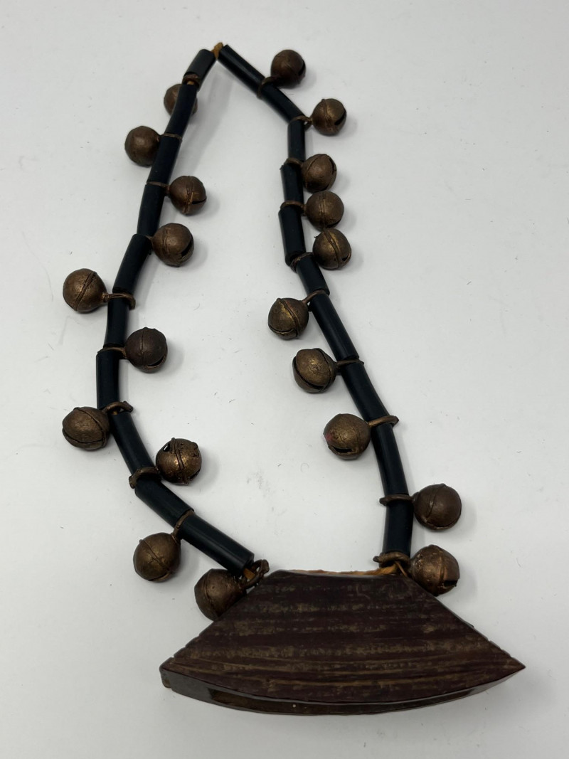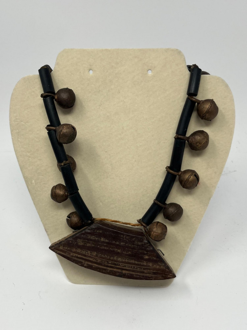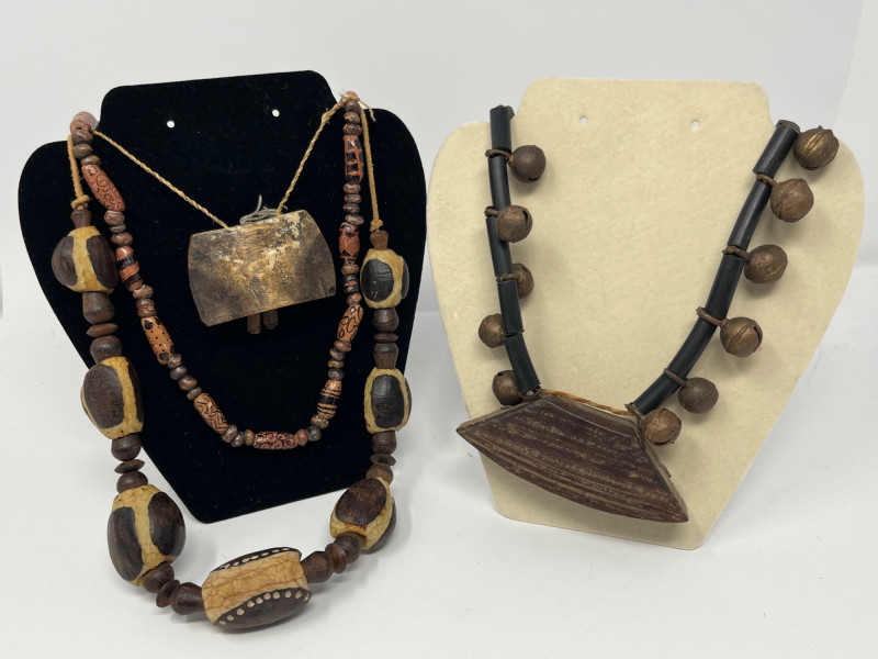 Set of four handcrafted necklaces of African origin, created with natural materials and traditional artisan techniques. The group includes a range of styles featuring carved wood, organic forms, seed beads, and corded construction. Two of the necklaces are fitted with carved wooden bell pendants that function, each shaped and finished by hand with visible artisan tooling. The remaining pieces feature complementary natural‑material designs consistent with regional craft traditions. Surface tones span warm woods, deep neutrals, and matte natural finishes, with variations expected from handmade work and prior handling. Offered as a single lot of four necklaces.