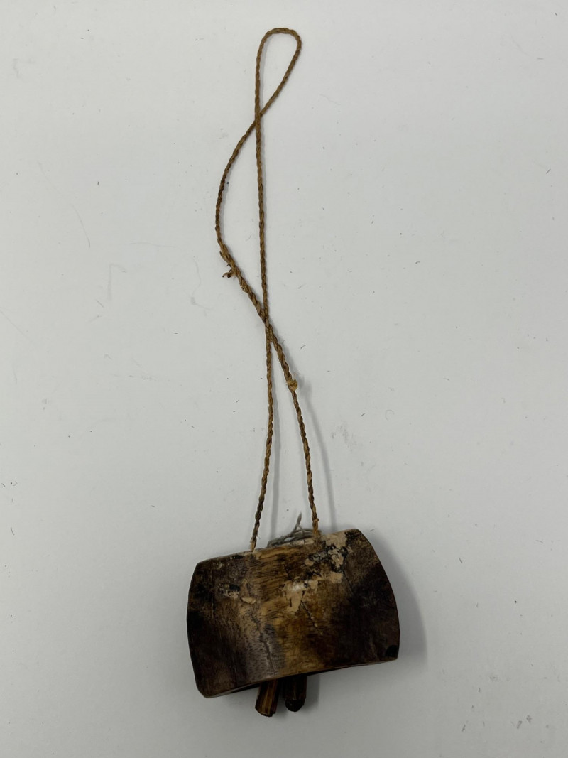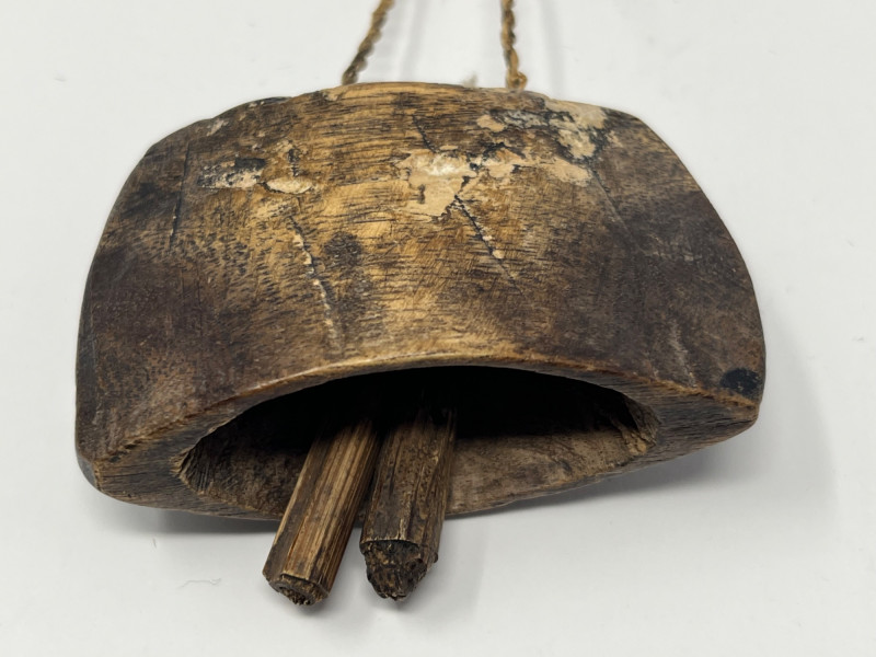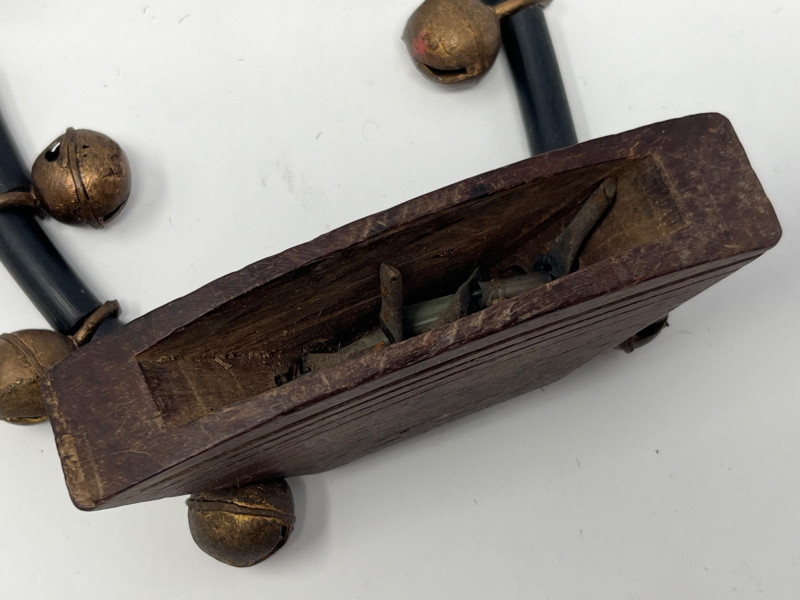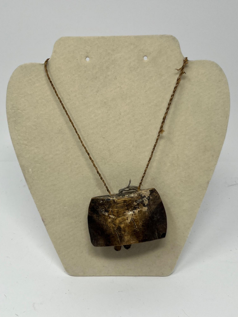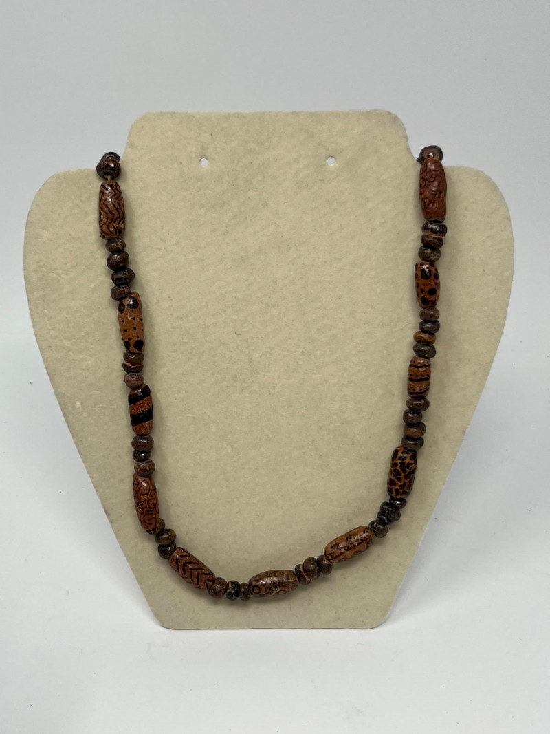 Set of four handcrafted necklaces of African origin, created with natural materials and traditional artisan techniques. The group includes a range of styles featuring carved wood, organic forms, seed beads, and corded construction. Two of the necklaces are fitted with carved wooden bell pendants that function, each shaped and finished by hand with visible artisan tooling. The remaining pieces feature complementary natural‑material designs consistent with regional craft traditions. Surface tones span warm woods, deep neutrals, and matte natural finishes, with variations expected from handmade work and prior handling. Offered as a single lot of four necklaces.