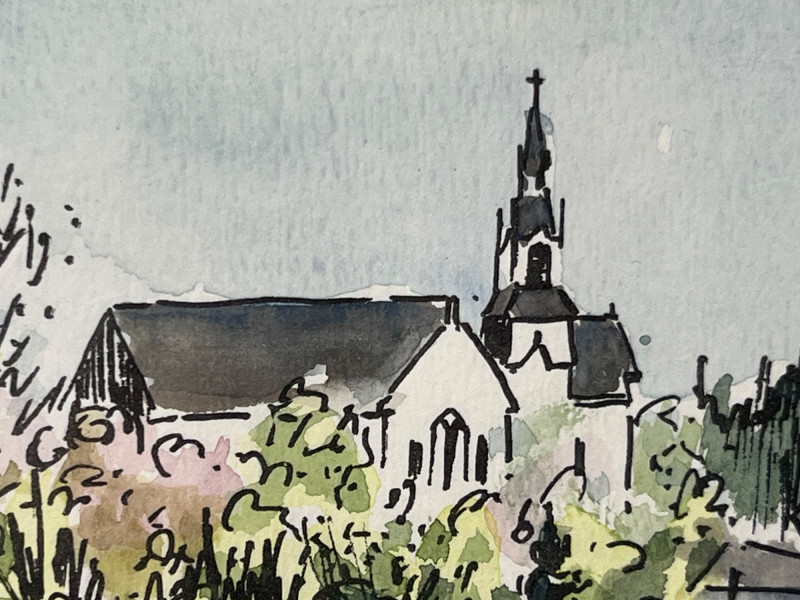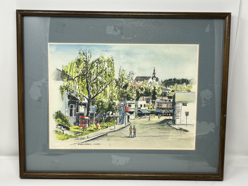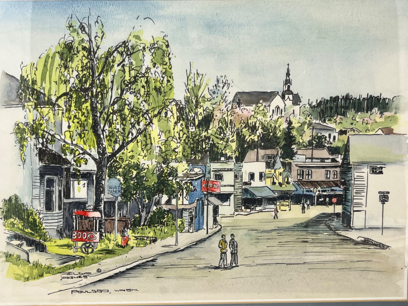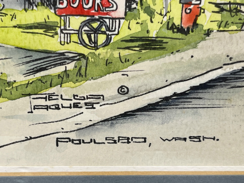Original watercolor by Helga Jaques depicting a lively small‑town street scene in Poulsbo, Washington. The composition features storefronts, pedestrians, mature trees, and a church steeple rising in the distance. Local signage such as “Books” and “Glunt’s Landing” adds regional character and situates the work within Poulsbo’s historic downtown. Signed and inscribed “Helga Jaques, Poulsbo, Wash.” in the lower margin. Presented in a wood frame with matting. A warm, nostalgic rendering of a Pacific Northwest community, appealing to collectors of regional art, watercolor illustration, and depictions of small‑town life. Condition