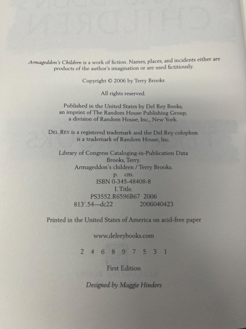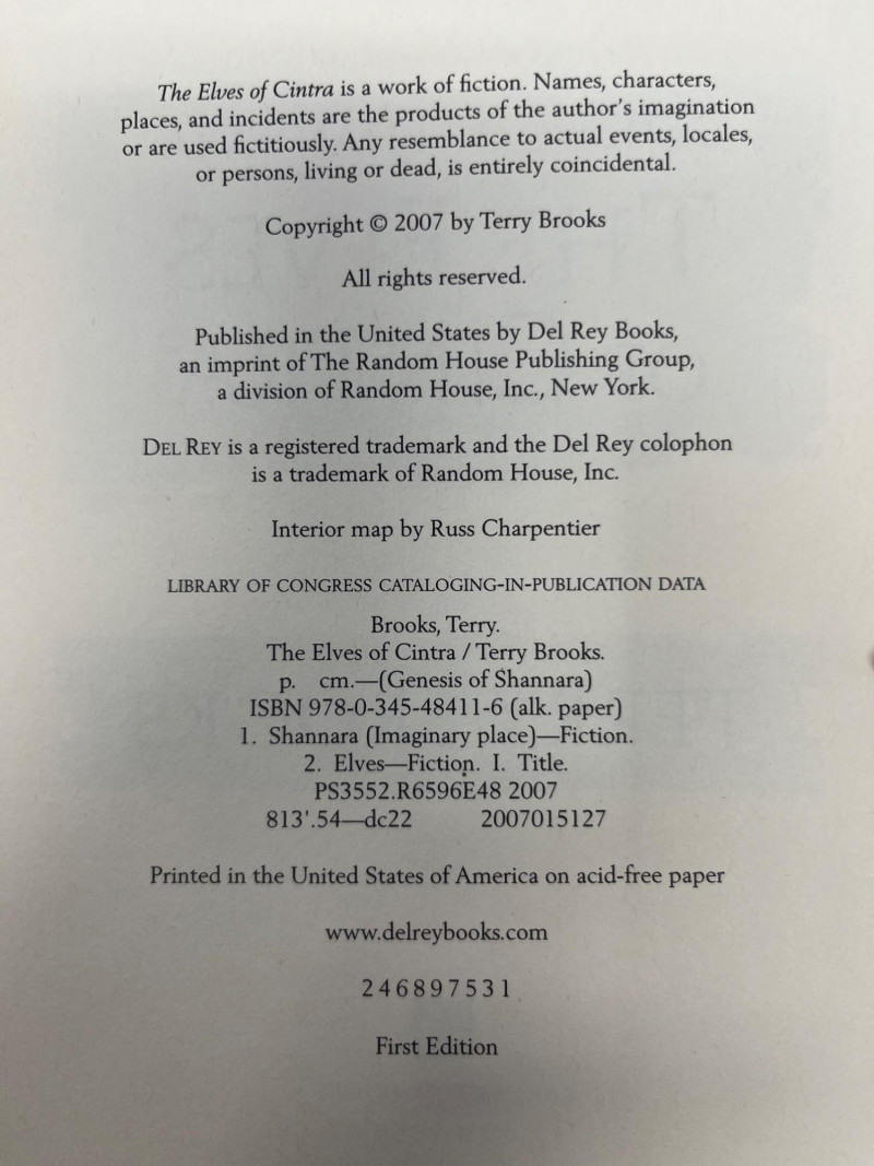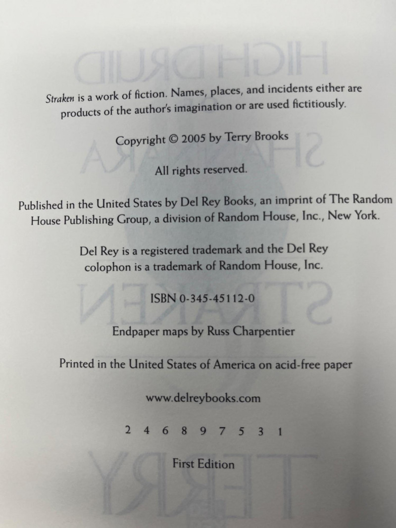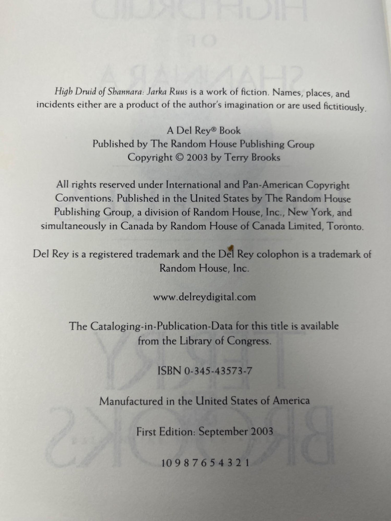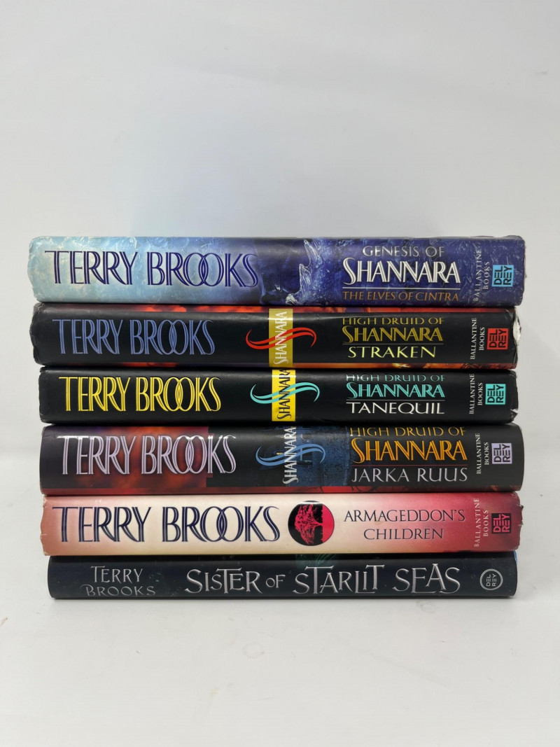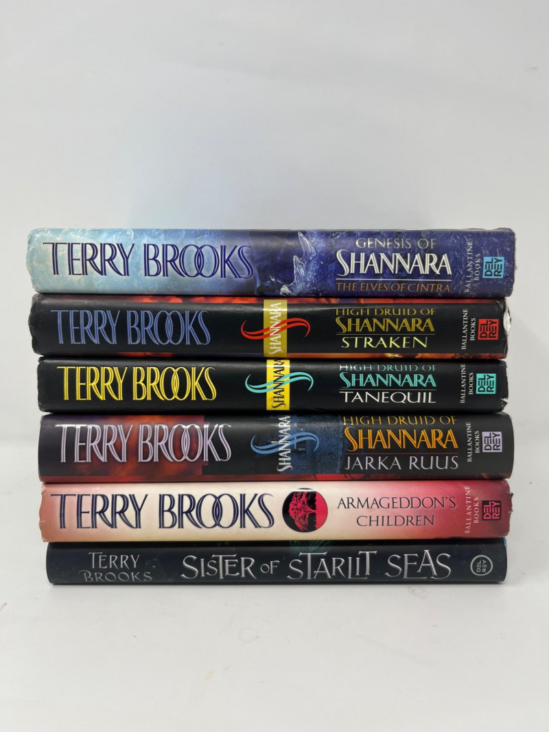A curated set of seven fantasy novels by Terry Brooks, representing key arcs within the Shannara universe and its connected Genesis of Shannara series. This lot includes first edition hardcovers published by Del Rey Books between 2003 and 2023, each featuring vivid jacket artwork and endpaper maps by Russ Charpentier. Titles include: High Druid of Shannara: Jarka Ruus (2003) High Druid of Shannara: Tanequil (2004) High Druid of Shannara: Straken (2005) Genesis of Shannara: The Elves of Cintra (2007) Armageddon’s Children (2006) Genesis of Shannara (series spine edition) Sister of Starlit Seas (2023) Each volume bears its original copyright and publication imprint from Del Rey, Random House, or Penguin Random House, with consistent design continuity across the series. The books trace the evolution of Brooks’s post-apocalyptic and high-fantasy worlds, bridging the Word & Void and Shannara timelines. Highlights: All volumes are U.S. first editions, printed on acid-free paper. Endpaper maps by Russ Charpentier featured in early titles. Later works (Sister of Starlit Seas) include updated design and cataloging details from Penguin Random House. A cohesive collector’s grouping spanning two decades of Brooks’s publication history. Condition: