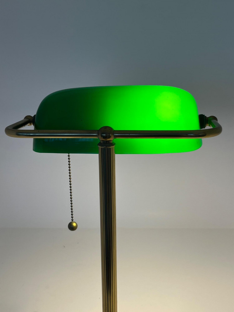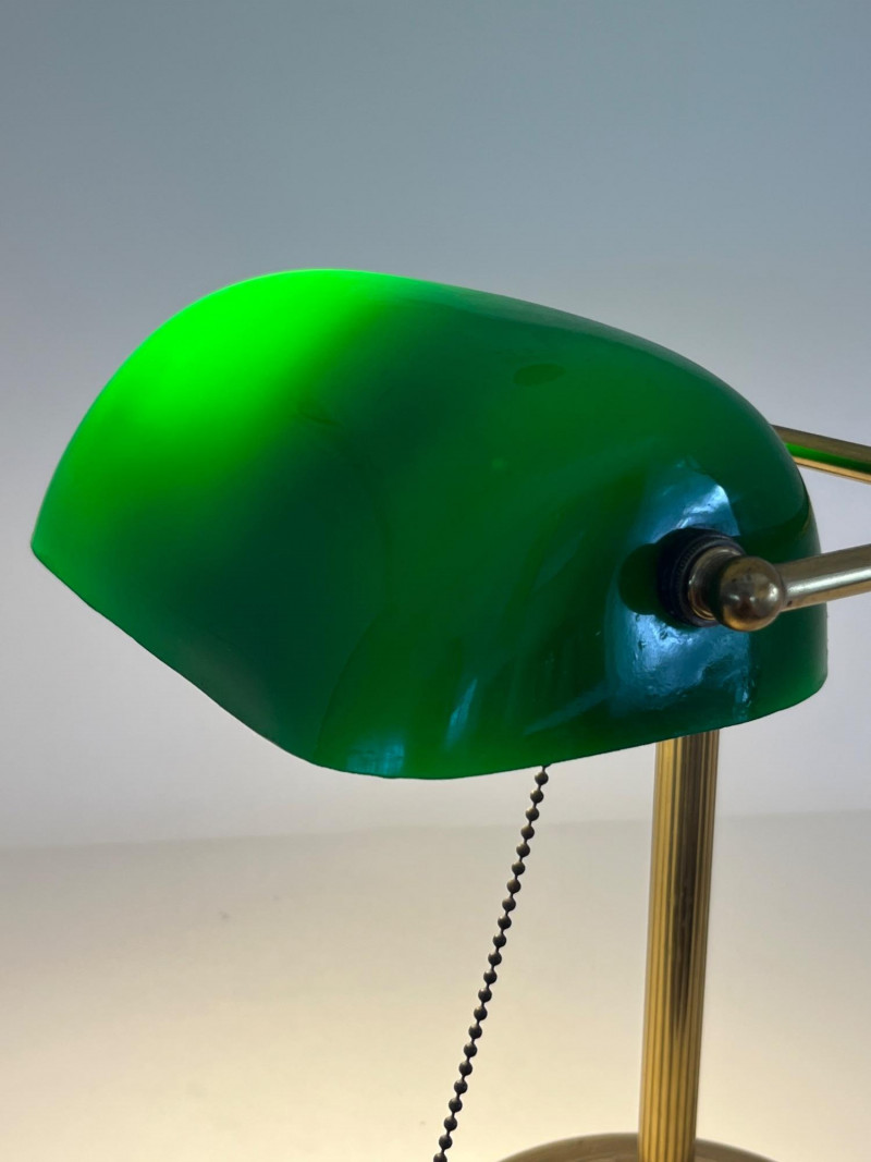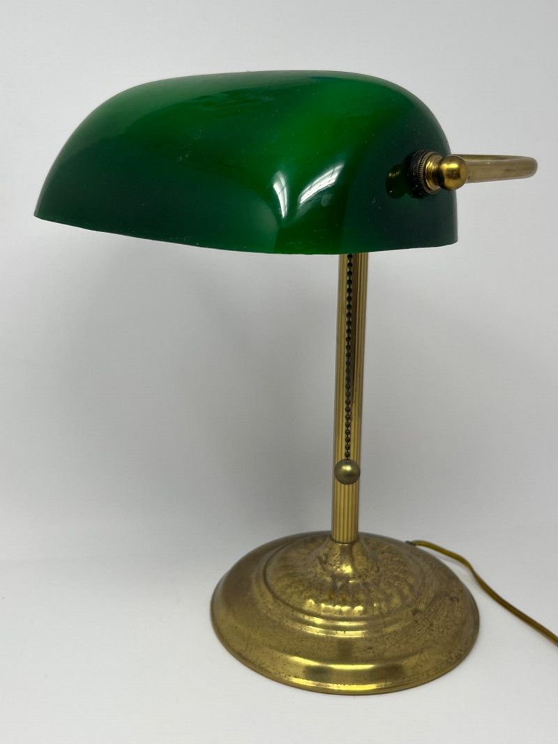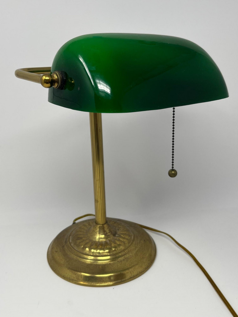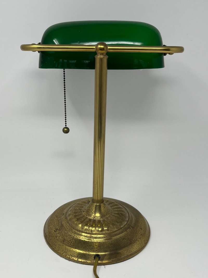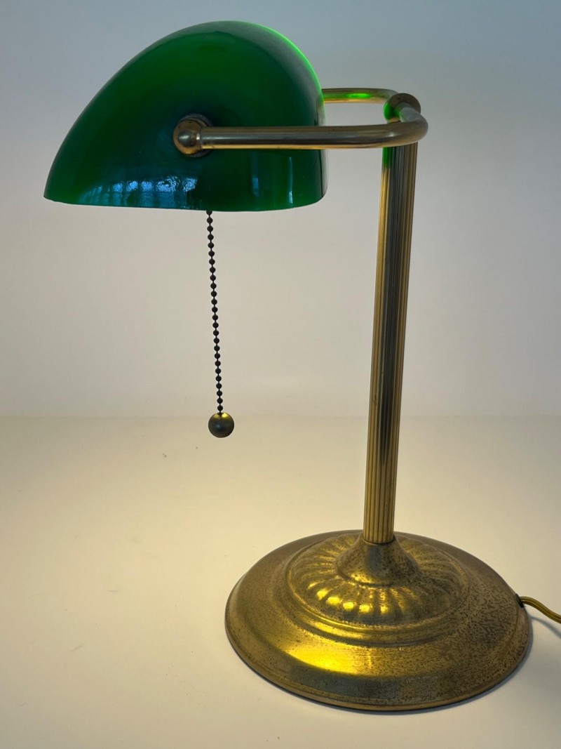 Classic banker’s desk lamp featuring a green glass shade and brass‑tone metal base, offered directly from a local estate. Traditional pull‑chain switch operates smoothly, and the lamp presents well with a warm, period‑appropriate aesthetic. The base shows expected surface wear from age and use, and the shade displays the typical variations found in older glass. Clean overall appearance with no noted structural issues. Power cord is intact and functional at time of cataloging. A timeless desk or study accent suitable for vintage‑inspired interiors, office décor, or restoration‑minded collectors. Notes: