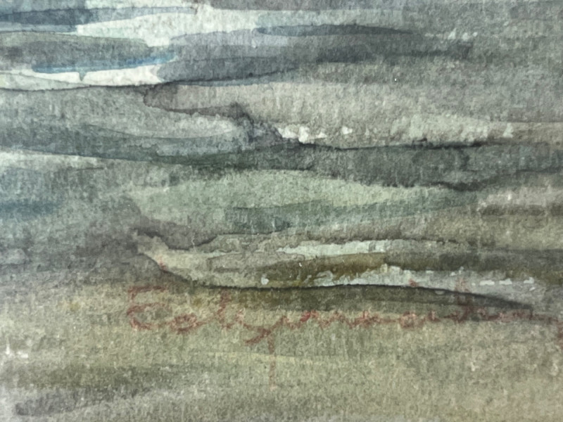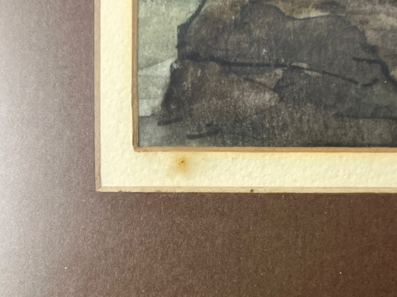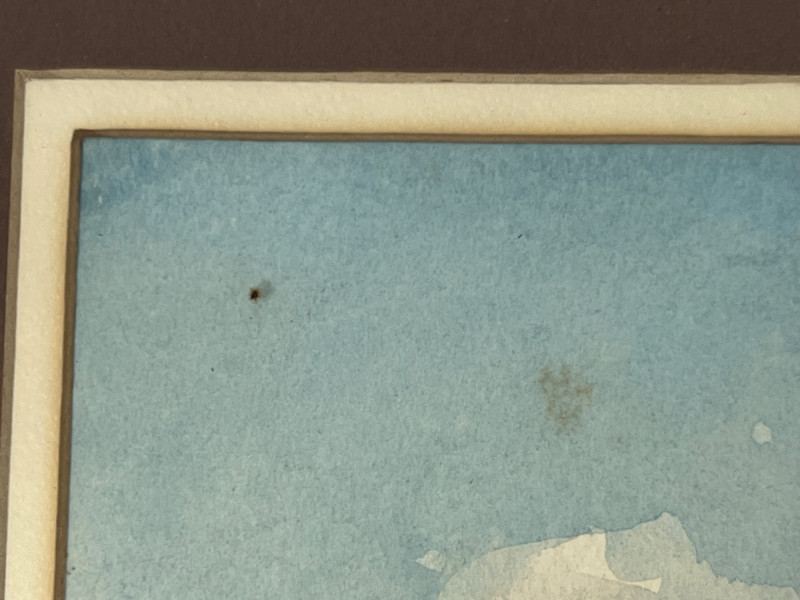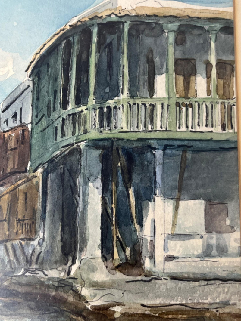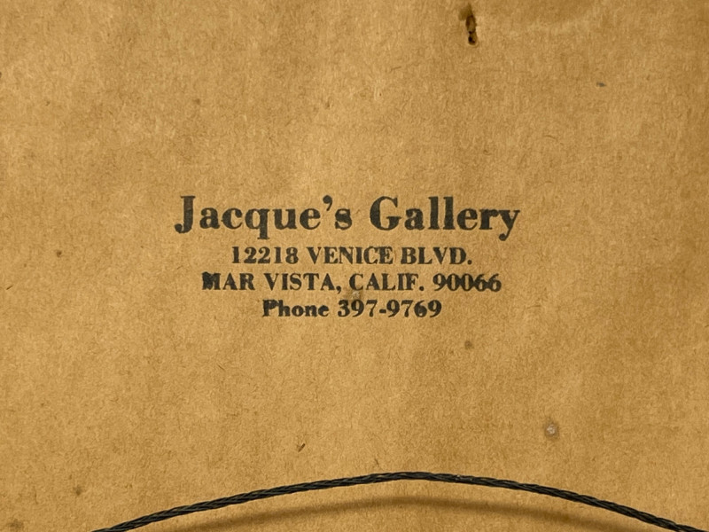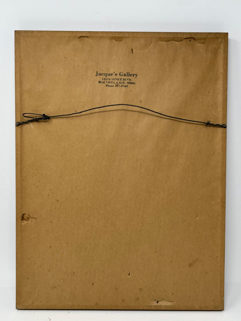 Original watercolor depicting a quiet waterfront scene with traditional coastal architecture, including a rounded veranda supported by columns and soft reflections across the water. The artist’s signature is present in the lower right corner. The artwork is presented in a wood frame with a brown mat. Both the frame and matting show small marks and light wear consistent with age and handling, all photographed for review. The reverse retains its paper backing, hanging wire, and a gallery label from Jacque’s Gallery, 12123 Venice Blvd., Mar Vista, California, providing helpful provenance. A calm, atmospheric piece suitable for collectors of coastal subjects, architectural studies, or mid‑century California gallery works. Ready for display.