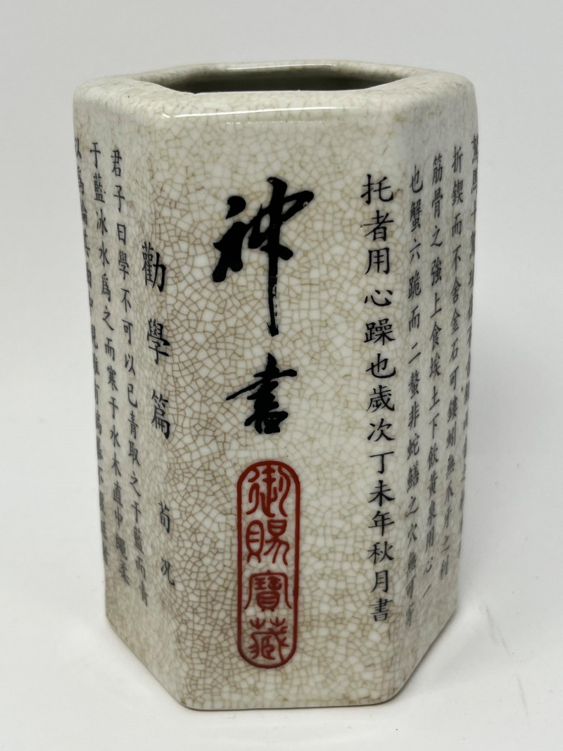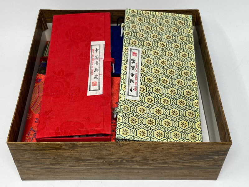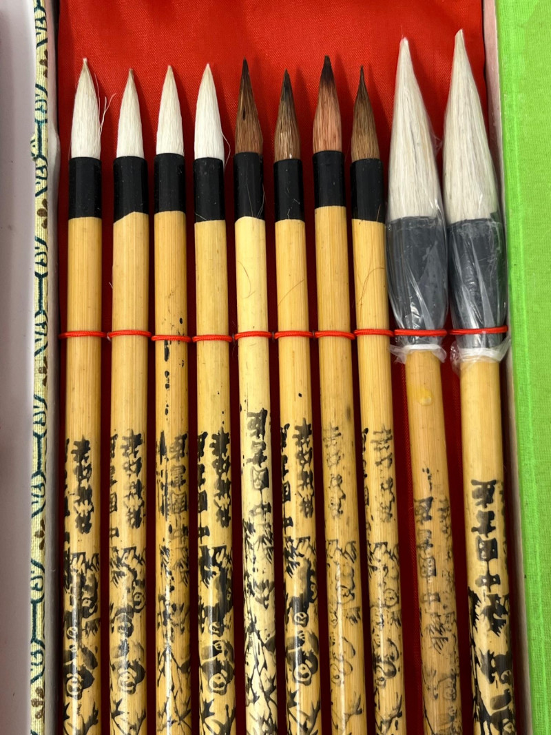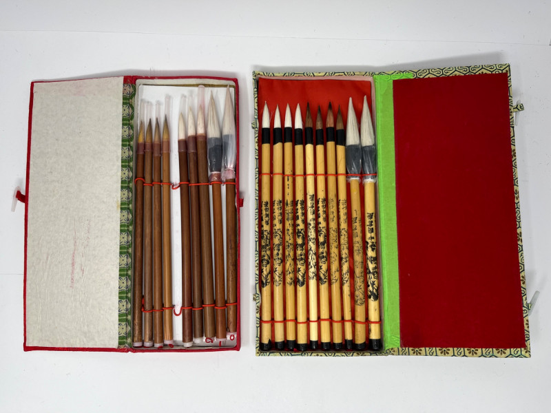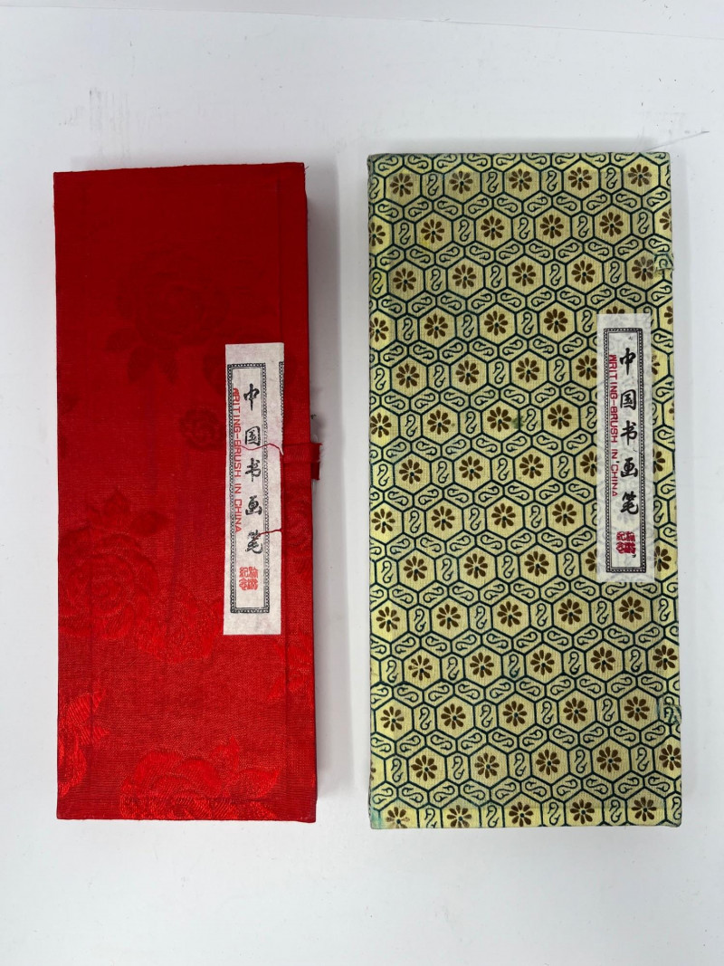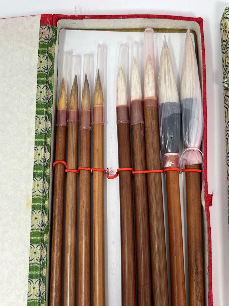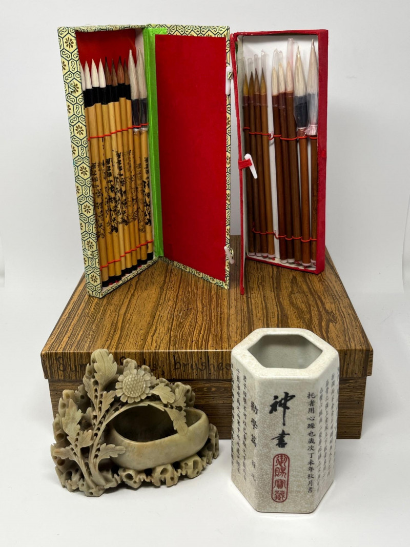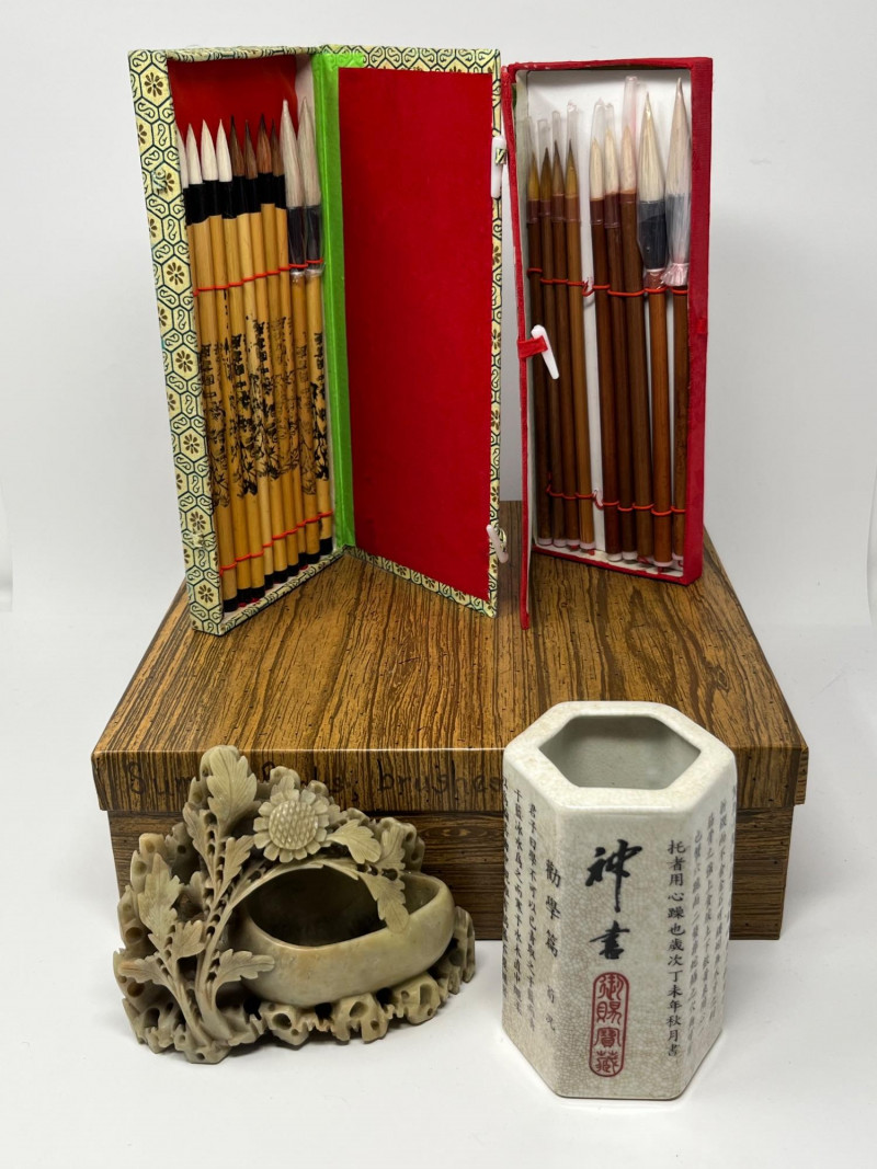 Assortment of traditional and contemporary calligraphy and scholar’s desk items. Includes two sets of Chinese calligraphy brushes in patterned fabric‑lined cases. The hexagonal brush pot is a modern piece from Anthropologie, featuring incised Chinese characters in a scholar’s desk style. Also included is a carved soapstone ink pot with floral and naturalistic motifs, along with additional carved stone desk pieces. The wood presentation box shown with the stone pieces is not included. Brush sets appear complete with varied brush sizes. Stone items display hand‑carved detailing and natural surface variations typical of soapstone. A versatile grouping suitable for collectors of Asian arts, calligraphy tools, or decorative desk objects. Condition Notes: