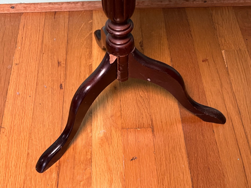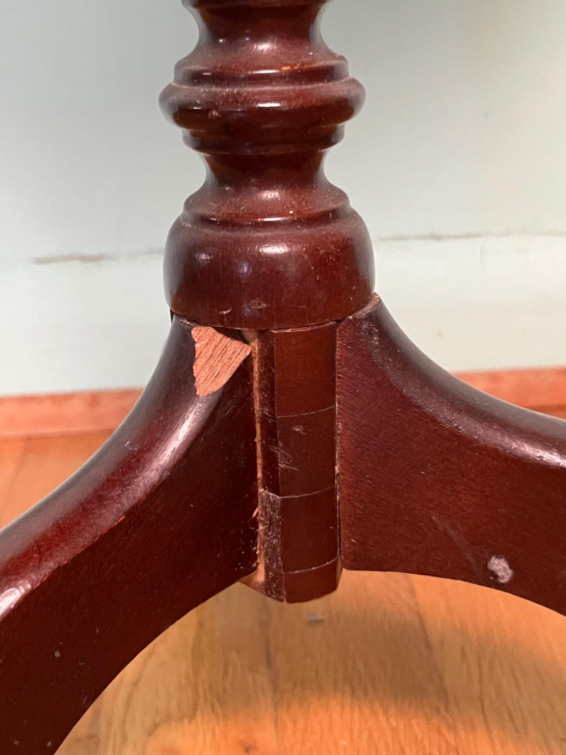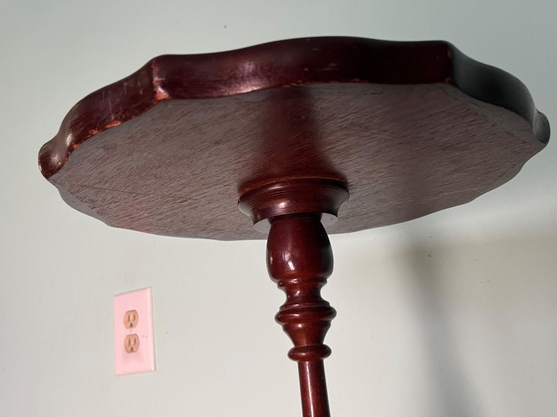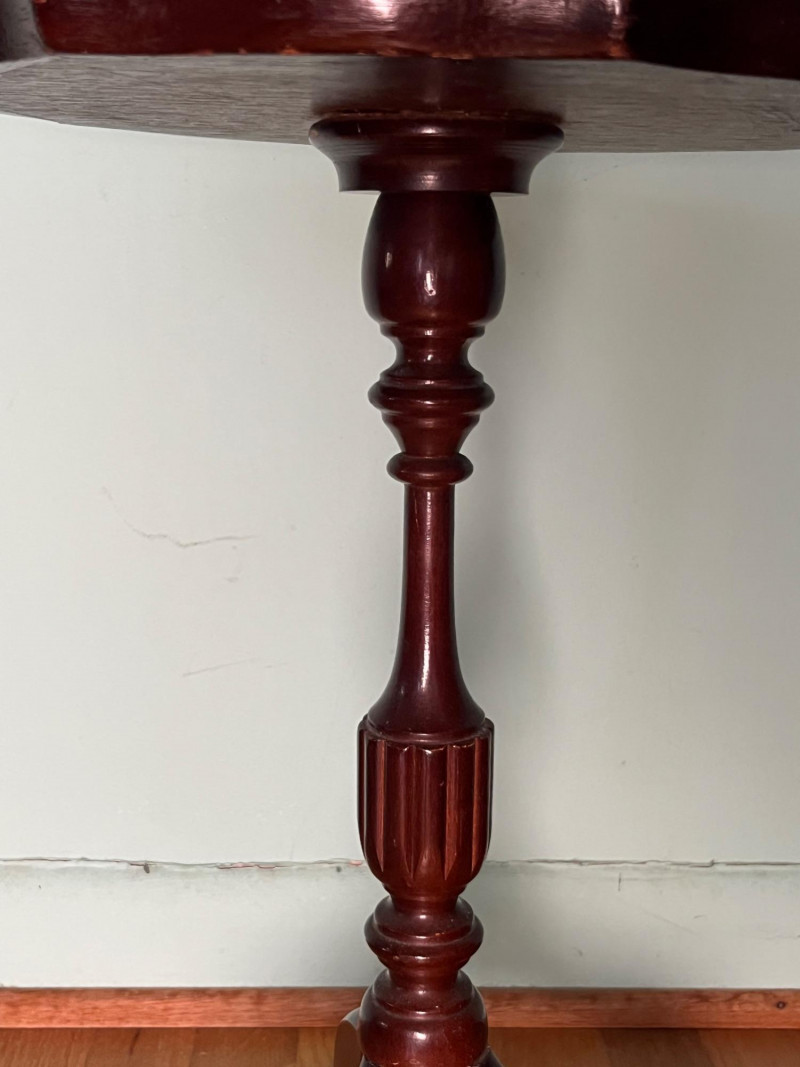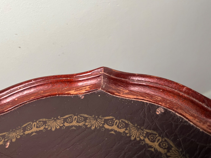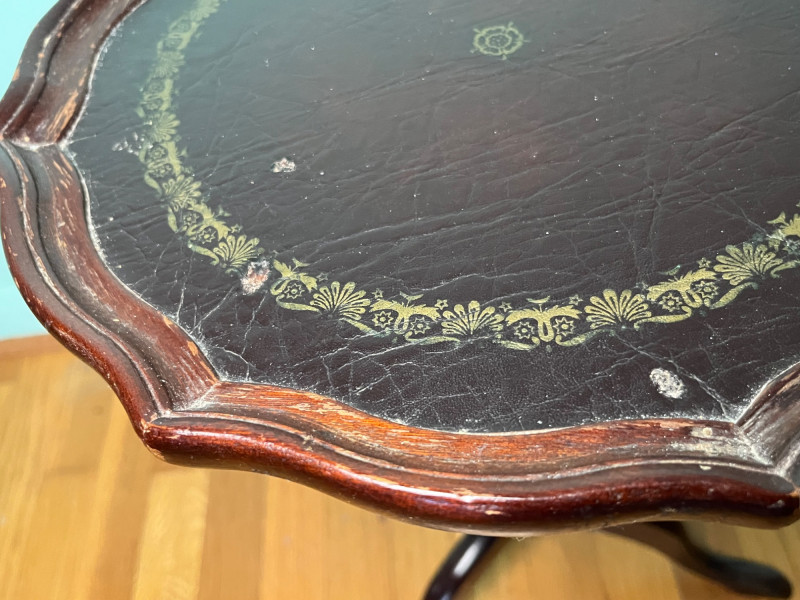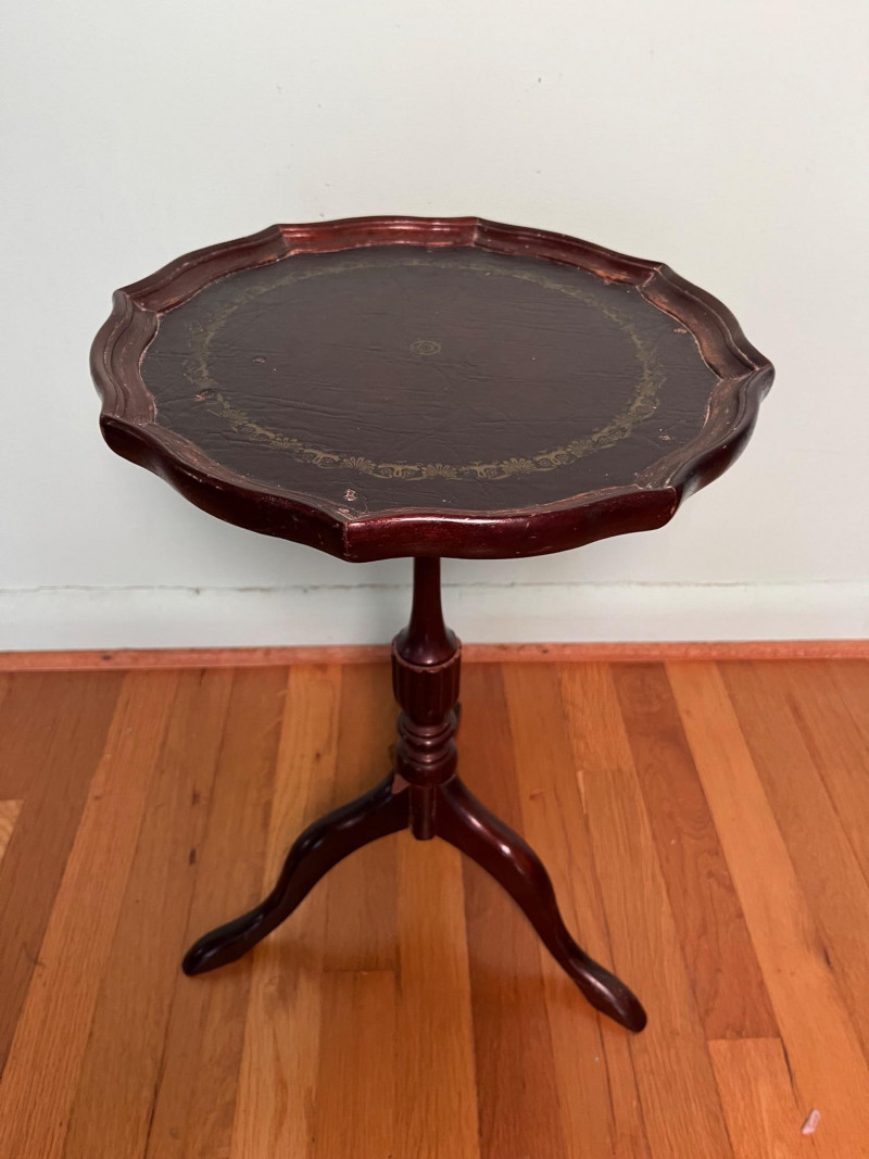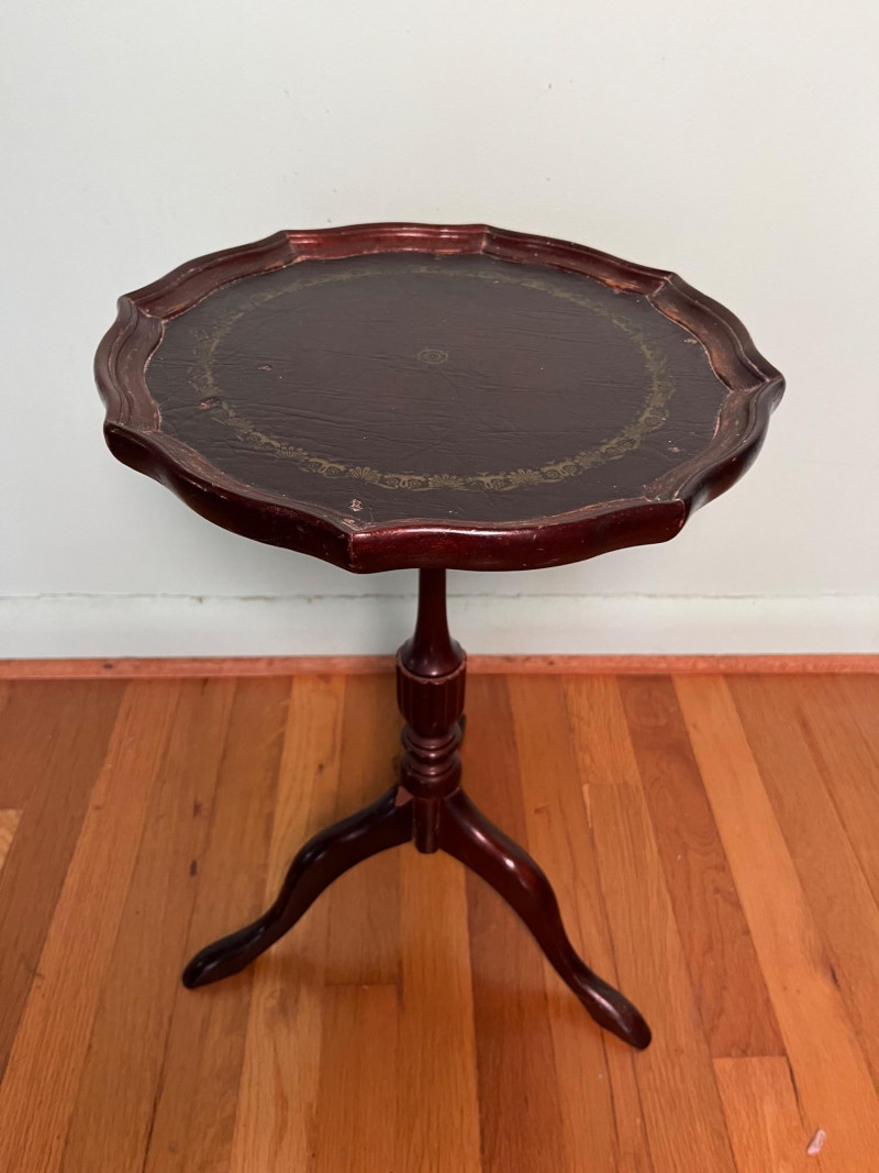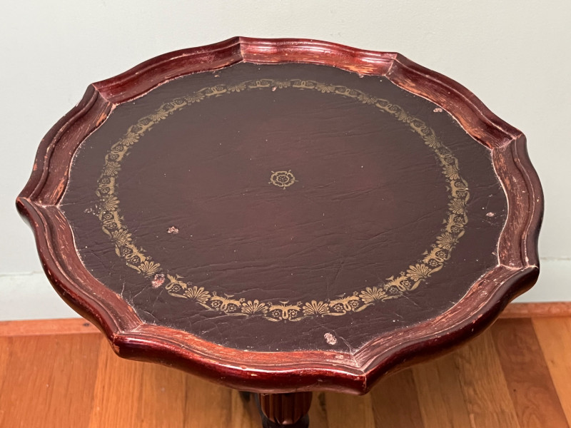 Elegant vintage pedestal side table featuring a scalloped-edge round top with a leather inset surface and decorative gold tooling. The turned central column and three curved legs create a classic silhouette suitable for traditional, eclectic, or library-inspired interiors. The leather top shows marks of wear that have been photographed, including surface rubbing and age-related imperfections. The base of the table has a visible chip, also documented in the photos. Additional finish wear and small edge imperfections are present throughout, consistent with age and use. A character-rich accent table with timeless form, ideal for décor, display, or restoration.