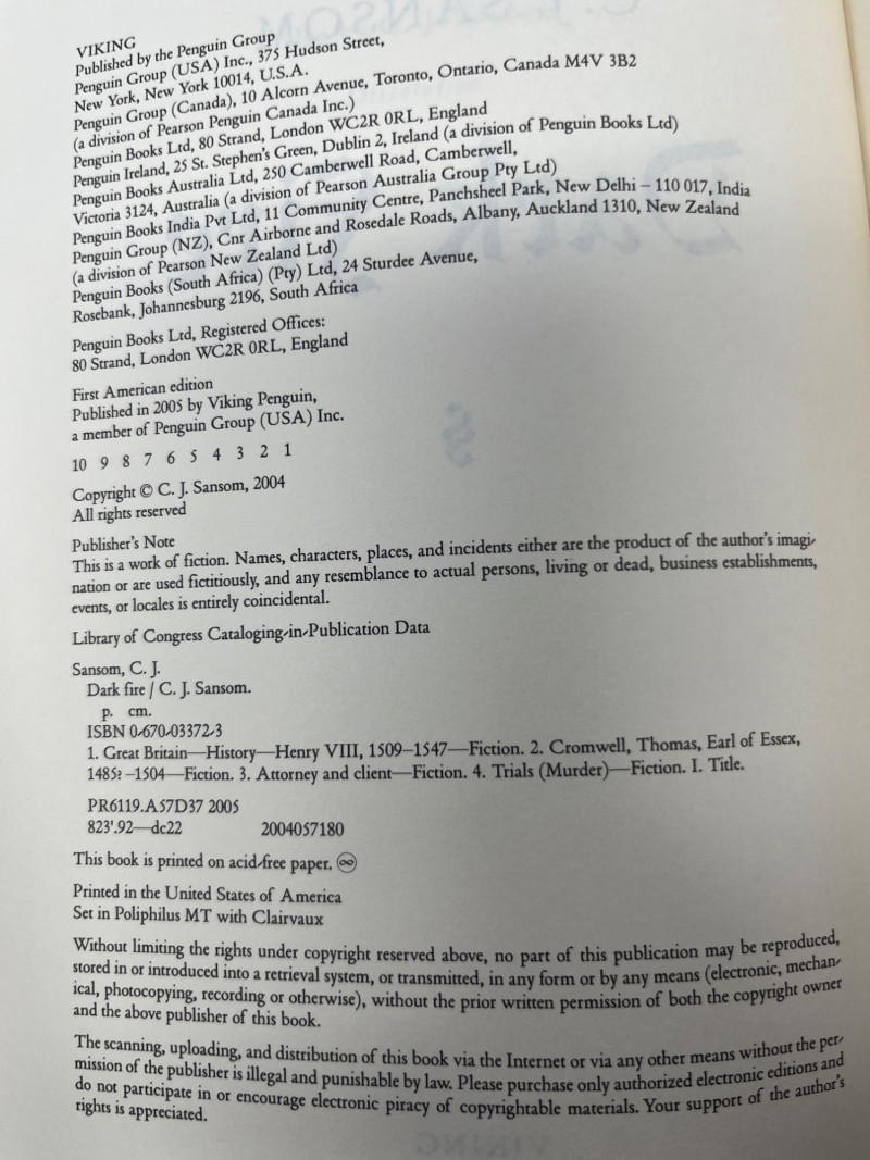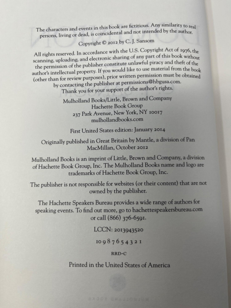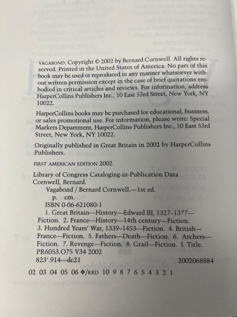 A curated six‑book collection from two internationally acclaimed authors of historical fiction, featuring confirmed first edition printings with intact copyright pages and original publication details. This lot brings together three titles by Bernard Cornwell and three by C.J. Sansom, each known for richly researched narratives and enduring popularity among collectors and readers of the genre. Included Titles: Bernard Cornwell