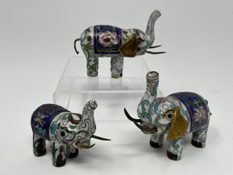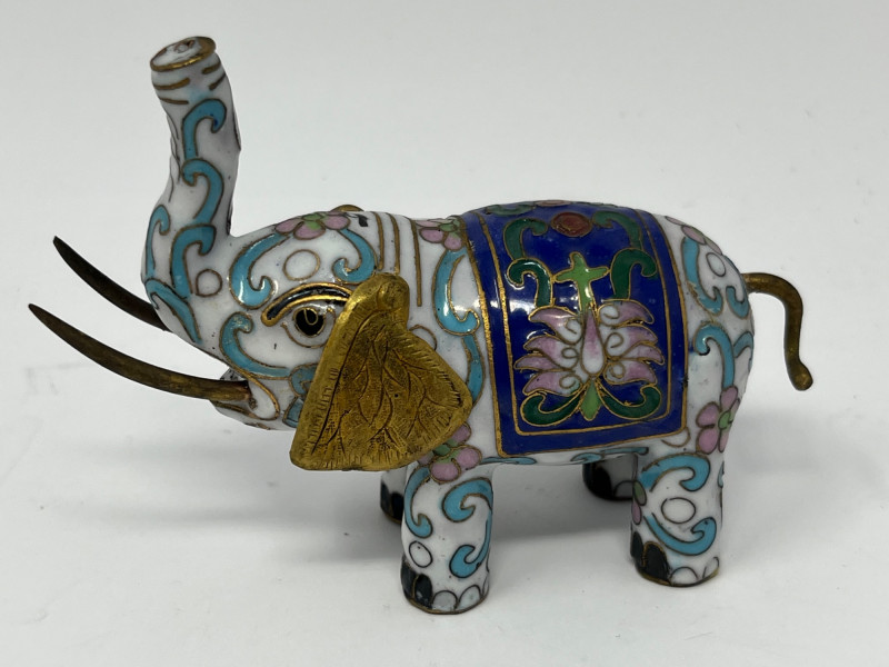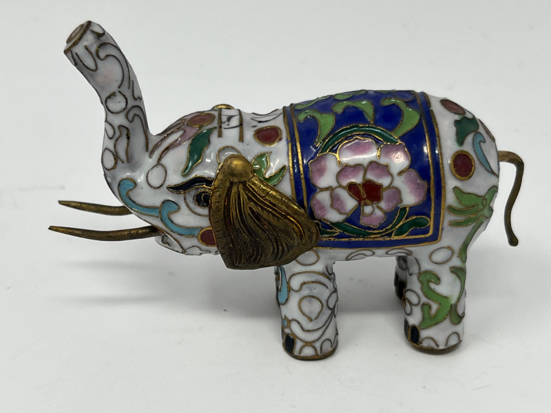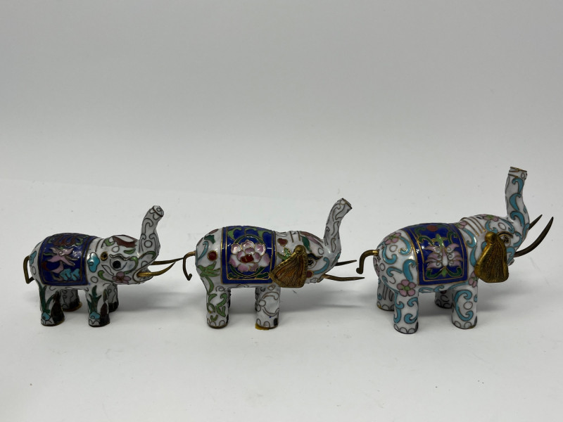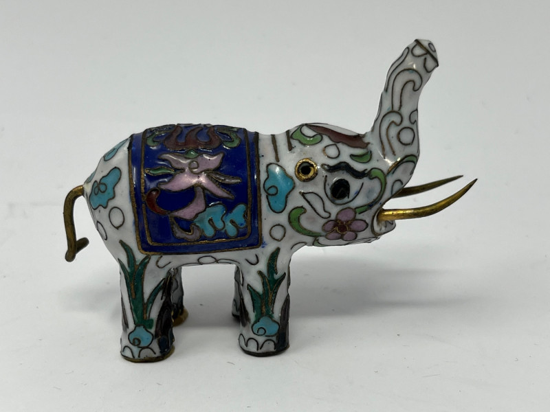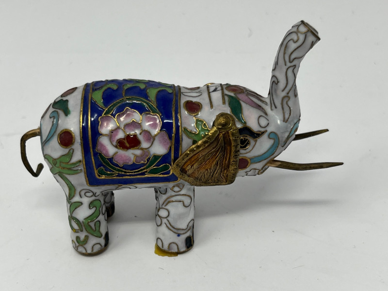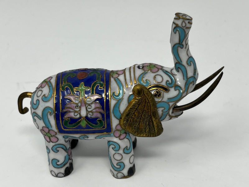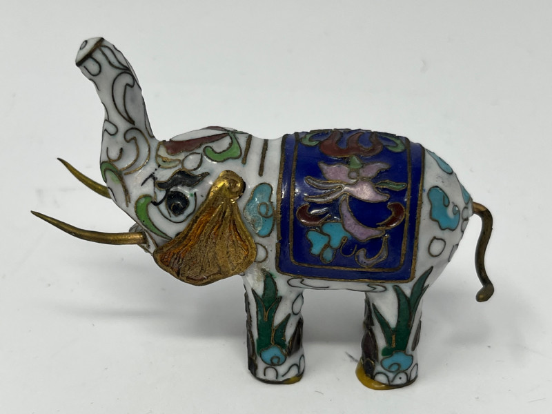Group of decorative elephant figurines crafted in metal with cloisonné‑style enamel work. Each piece features raised trunks, gold‑tone accents, and patterned saddle motifs created through enamel-filled cells characteristic of cloisonné decoration. Color palettes include blue, green, white, and multicolor combinations, with glossy surfaces and ornate detailing. This lot includes multiple elephants in varied designs, unified by their cloisonné‑style construction and decorative appeal. Suitable for collectors of enamel miniatures, global décor, and traditional craft-inspired figurines. Condition consistent with display use. Minor surface wear may be present from handling.