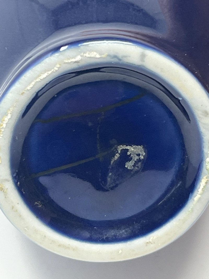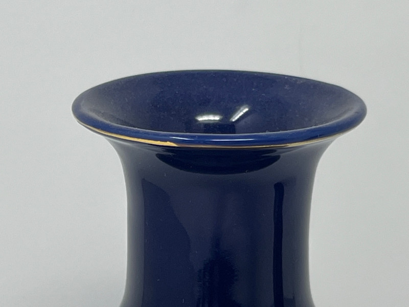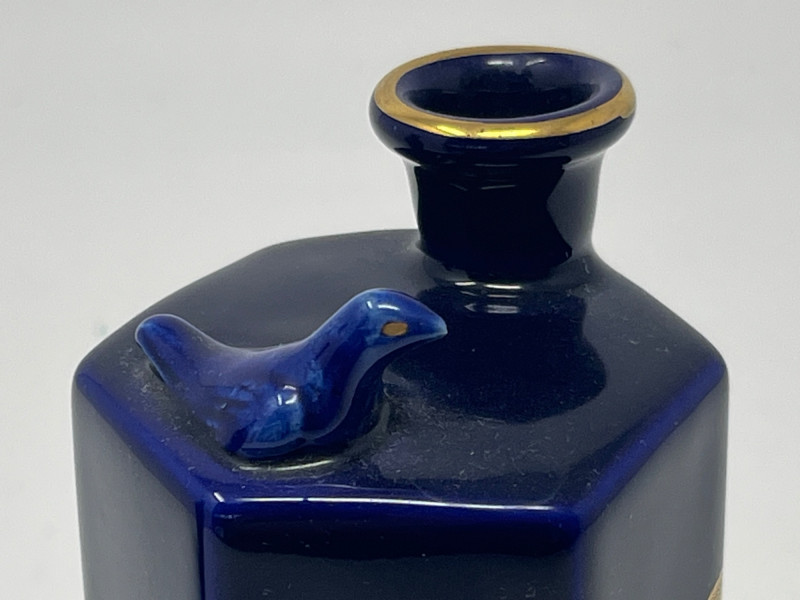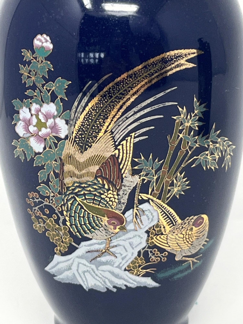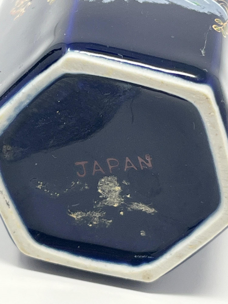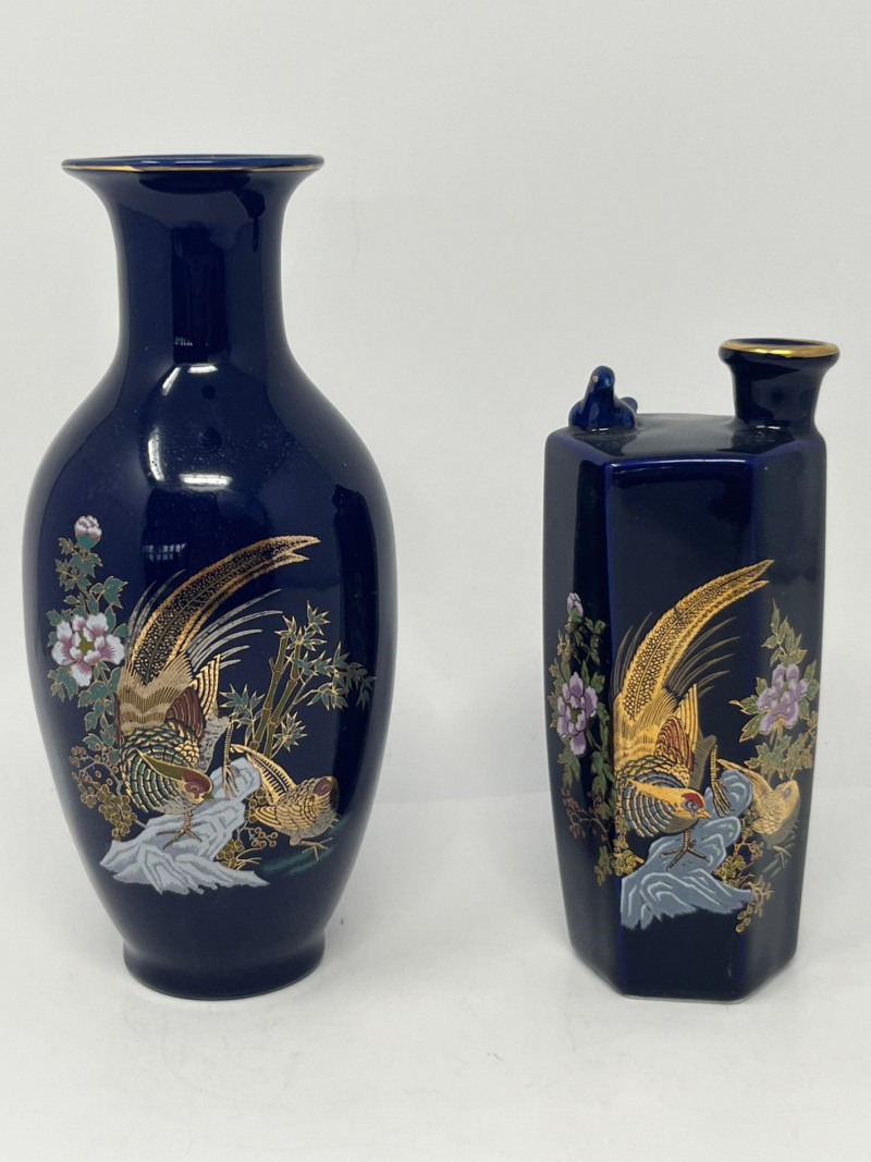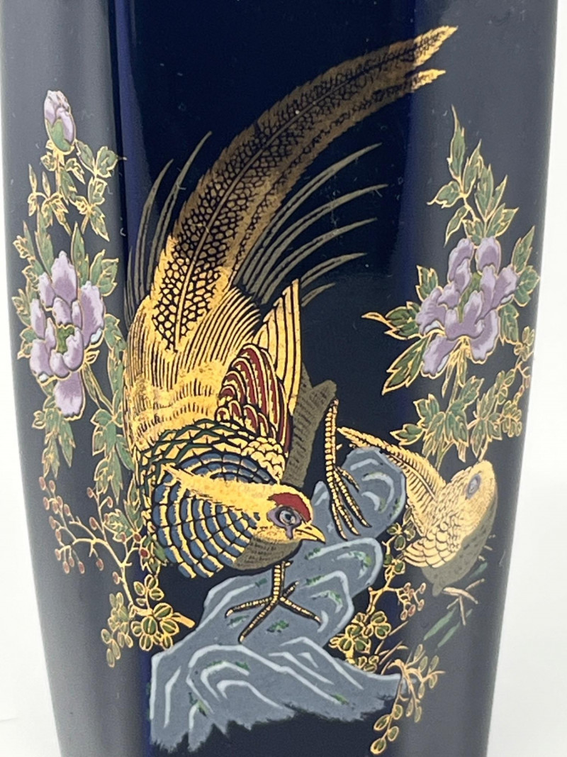 Pair of vintage Japanese ceramic vases, each finished in a deep cobalt glaze and decorated with detailed gilt and multicolor enamel work. Both pieces feature a stylized phoenix surrounded by flowering branches, rendered in raised and painted accents that highlight the gold, white, green, and purple palette. The taller vase has a rounded body with a flared rim and displays the phoenix in full profile with elaborate tail feathers. The second vase is a hexagonal form with a fitted lid topped by a small bird finial, echoing the avian theme. Underside mark on one piece reads “JAPAN,” indicating mid‑20th‑century export production. Surfaces show crisp detailing and strong color retention. Light wear consistent with age and handling. A decorative pair suitable for display, collectors of Japanese export ceramics, or those drawn to gilt enamel artistry.