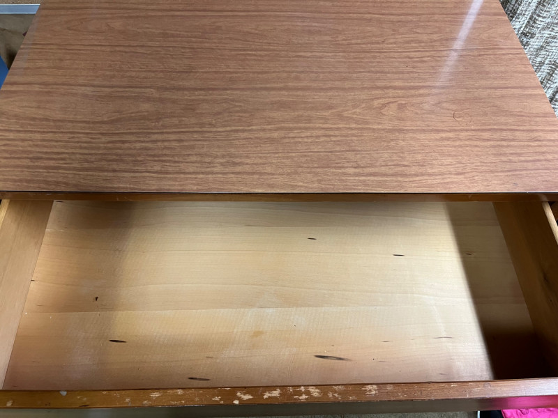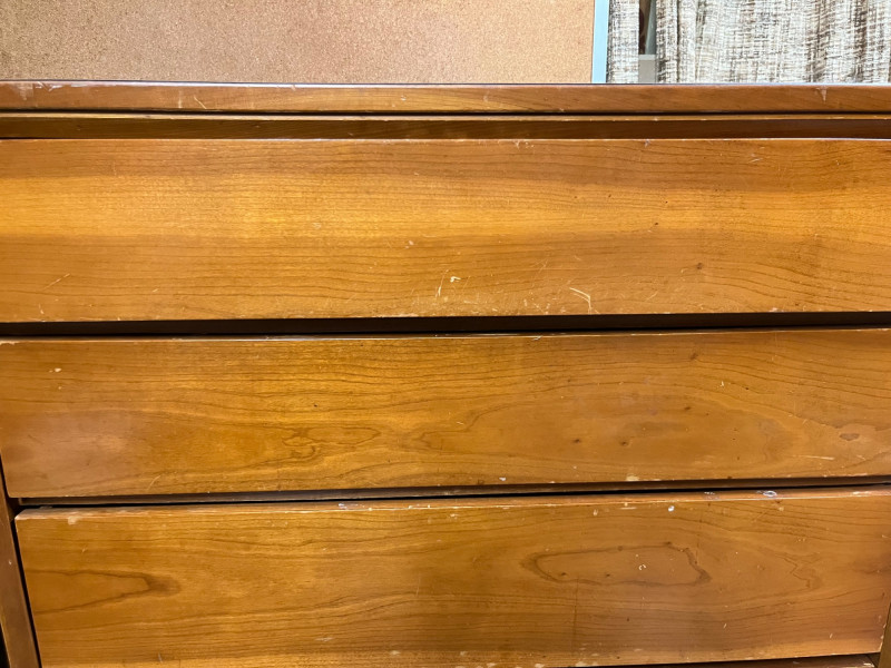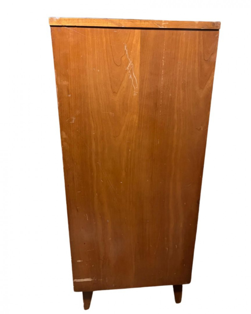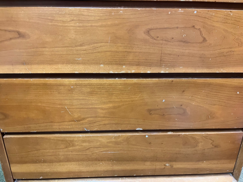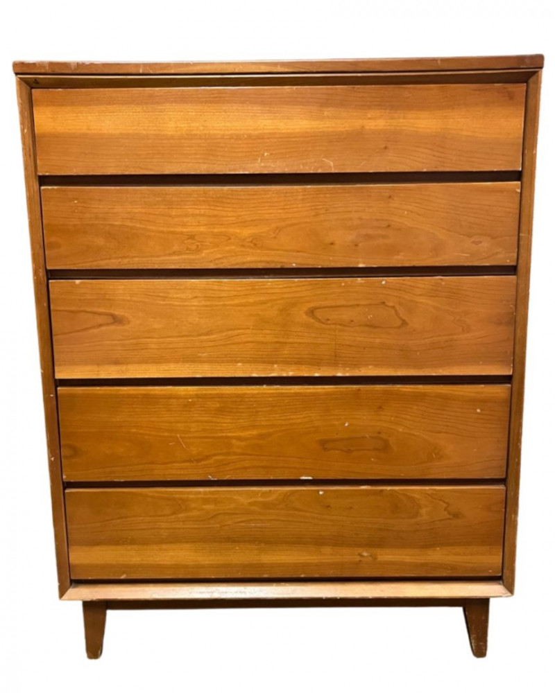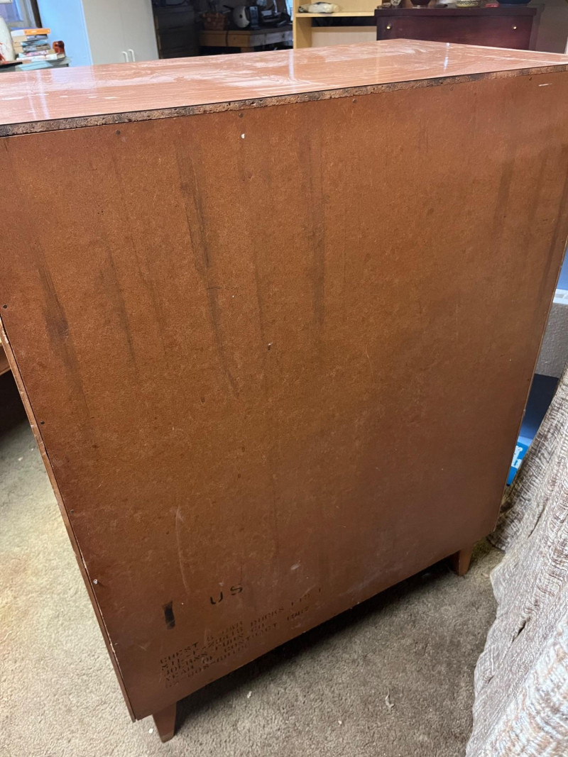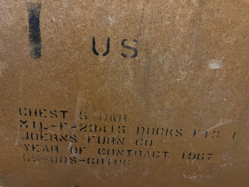 A government‑issued 5‑drawer wooden chest manufactured by Joerns Furniture Co. under federal contract in 1967. The reverse retains its original stenciled procurement markings, including “MIL‑F‑23415” (the military furniture specification governing this model), “GS‑00S‑68106” (a General Services Administration contract number), and the “U S” property designation. These identifiers confirm production for federal use within the Department of Defense supply system. Constructed to military specifications, the chest features a straightforward utilitarian design with four full drawers and one shallow top drawer. The piece shows visible age‑related wear such as scratches, scuffs, finish loss, and edge wear, consistent with long‑term institutional service. Its durable build and documented provenance make it suitable for restoration, repurposing, or display. Includes: Chest of drawers as shown.