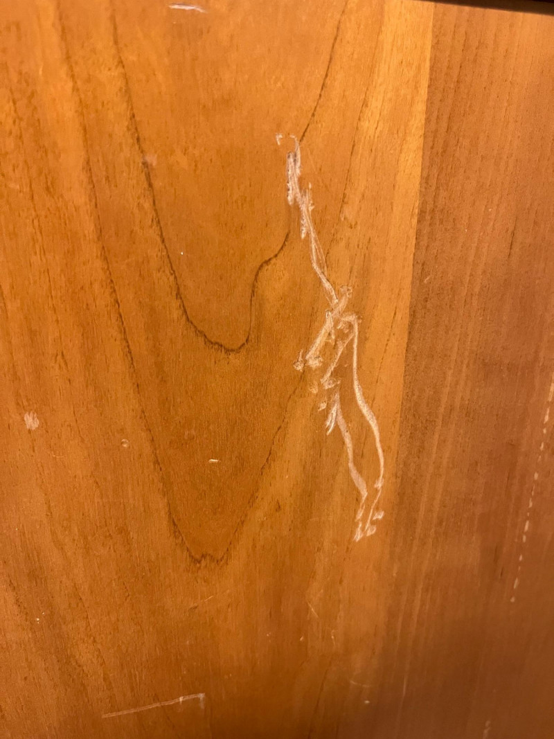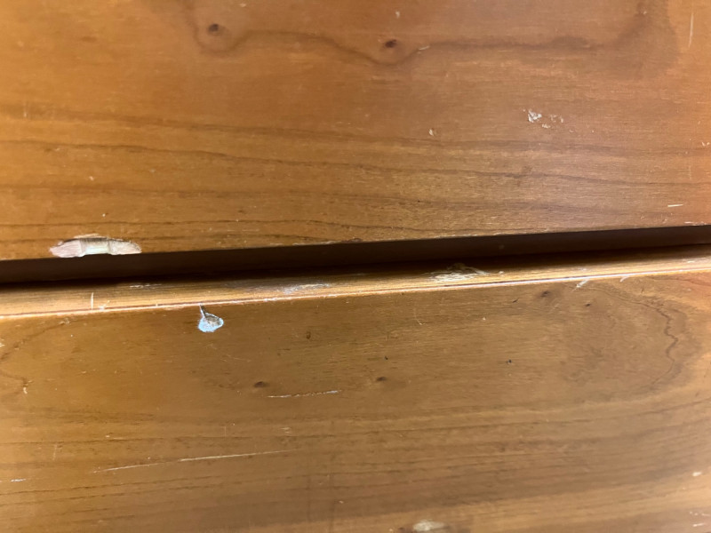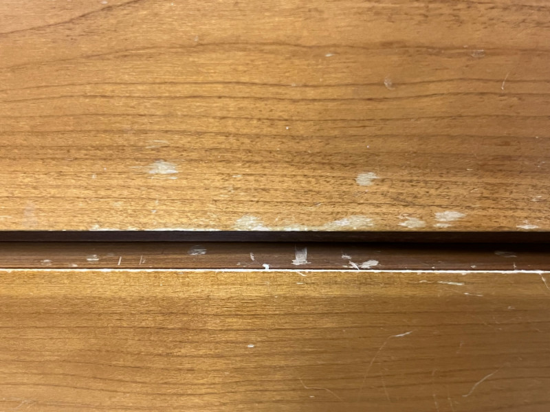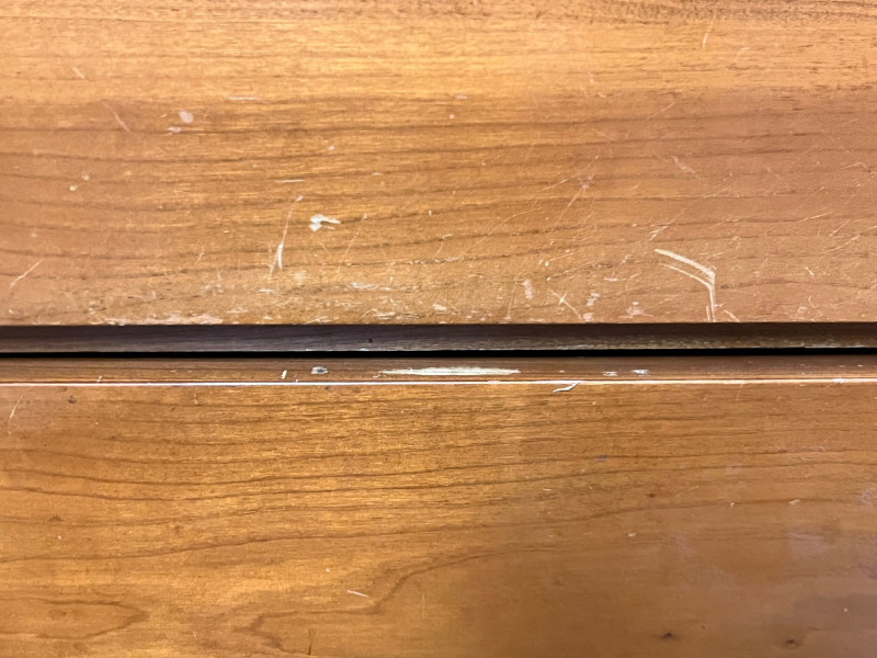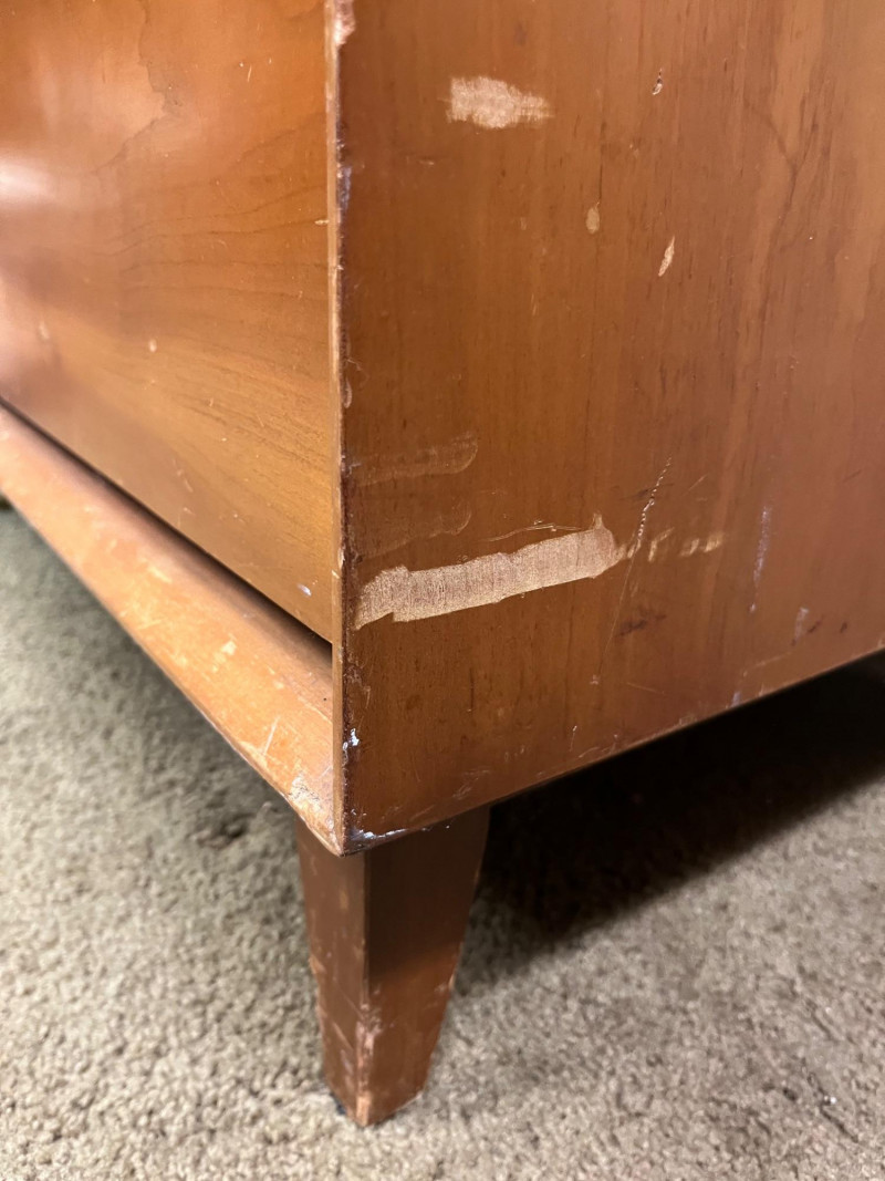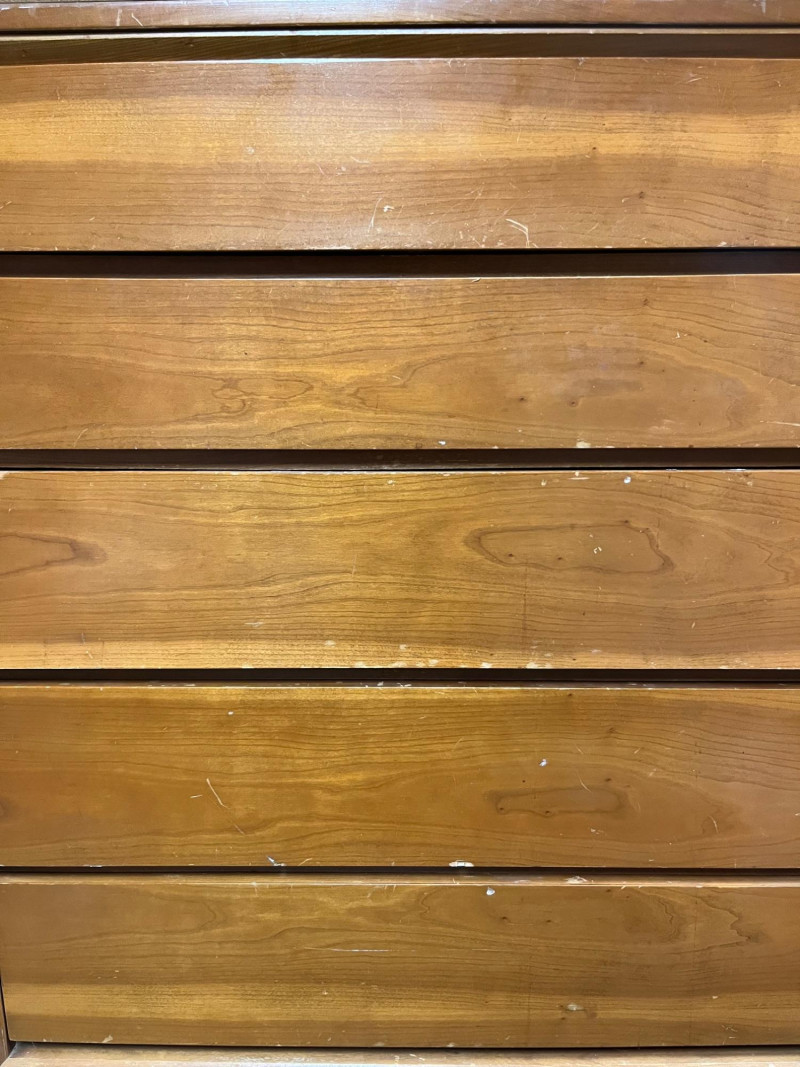 A government‑issued 5‑drawer wooden chest manufactured by Joerns Furniture Co. under federal contract in 1967. The reverse retains its original stenciled procurement markings, including “MIL‑F‑23415” (the military furniture specification governing this model), “GS‑00S‑68106” (a General Services Administration contract number), and the “U S” property designation. These identifiers confirm production for federal use within the Department of Defense supply system. Constructed to military specifications, the chest features a straightforward utilitarian design with four full drawers and one shallow top drawer. The piece shows visible age‑related wear such as scratches, scuffs, finish loss, and edge wear, consistent with long‑term institutional service. Its durable build and documented provenance make it suitable for restoration, repurposing, or display. Includes: Chest of drawers as shown.