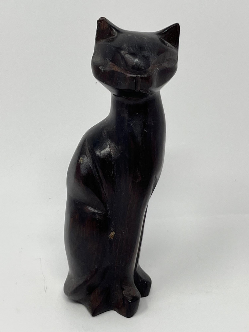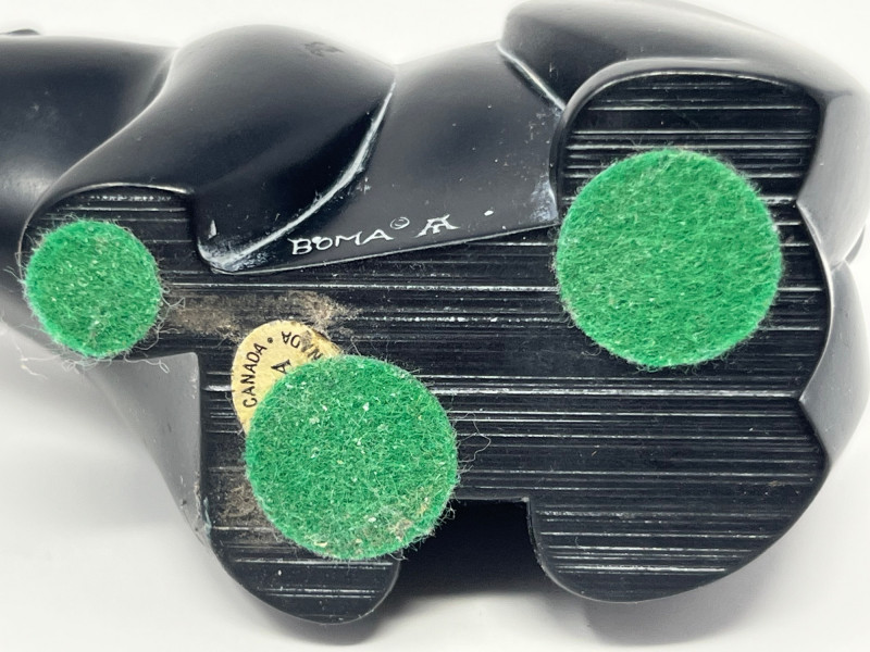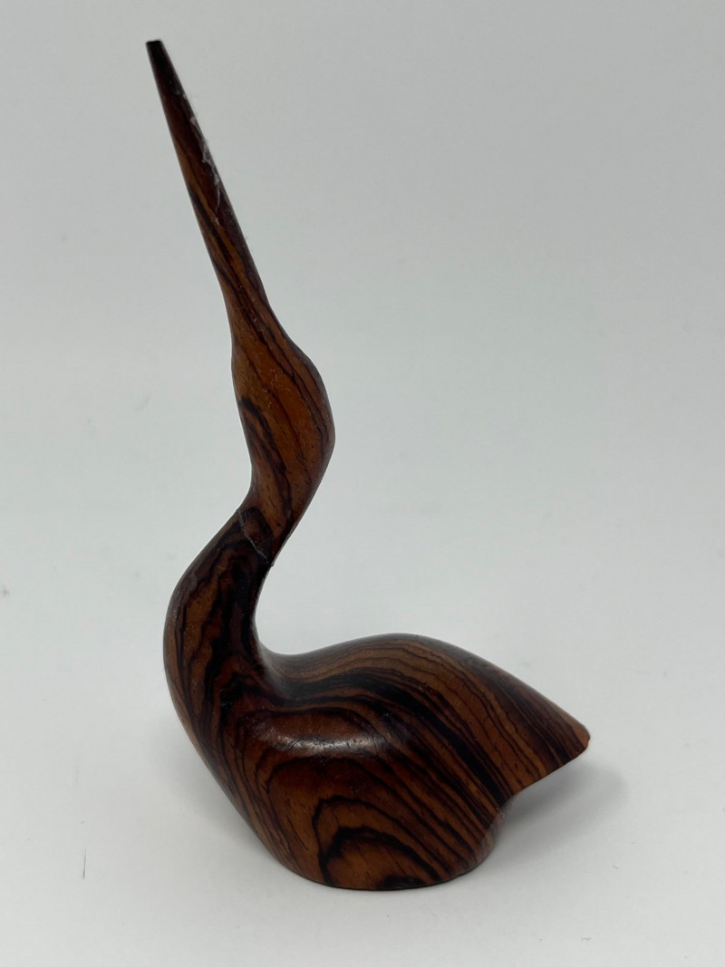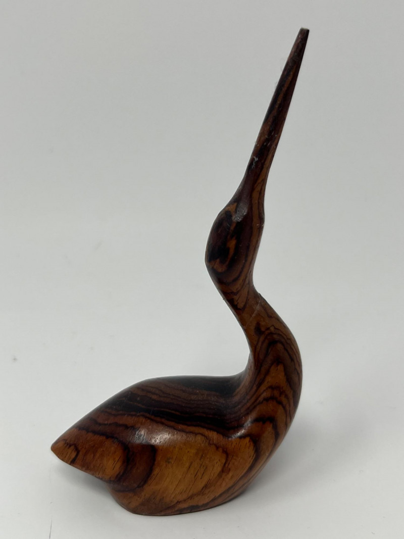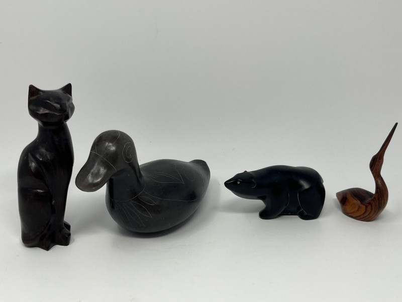 A curated grouping of four carved animal figures, each with distinct character and origin. This lot includes: Cat – Hand‑carved figure with smooth contours and a simple, stylized form. Duck – Marked Made in Mexico on the underside; traditional folk‑carved style with a warm, natural finish. Crane – Tall, slender carving with elongated lines and a graceful stance. Bear – Branded Boma on the underside and Made in Canada; characteristic of Boma’s mid‑century and later wildlife carvings known for clean lines and polished surfaces. A cohesive, decorative set for collectors of carved animals, folk art, or North American studio giftware. Each piece shows hand‑carved individuality and material variation appropriate to its origin.