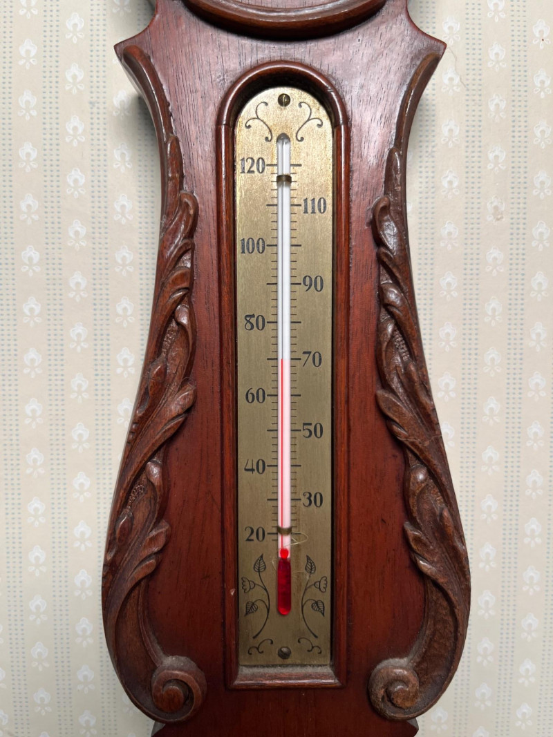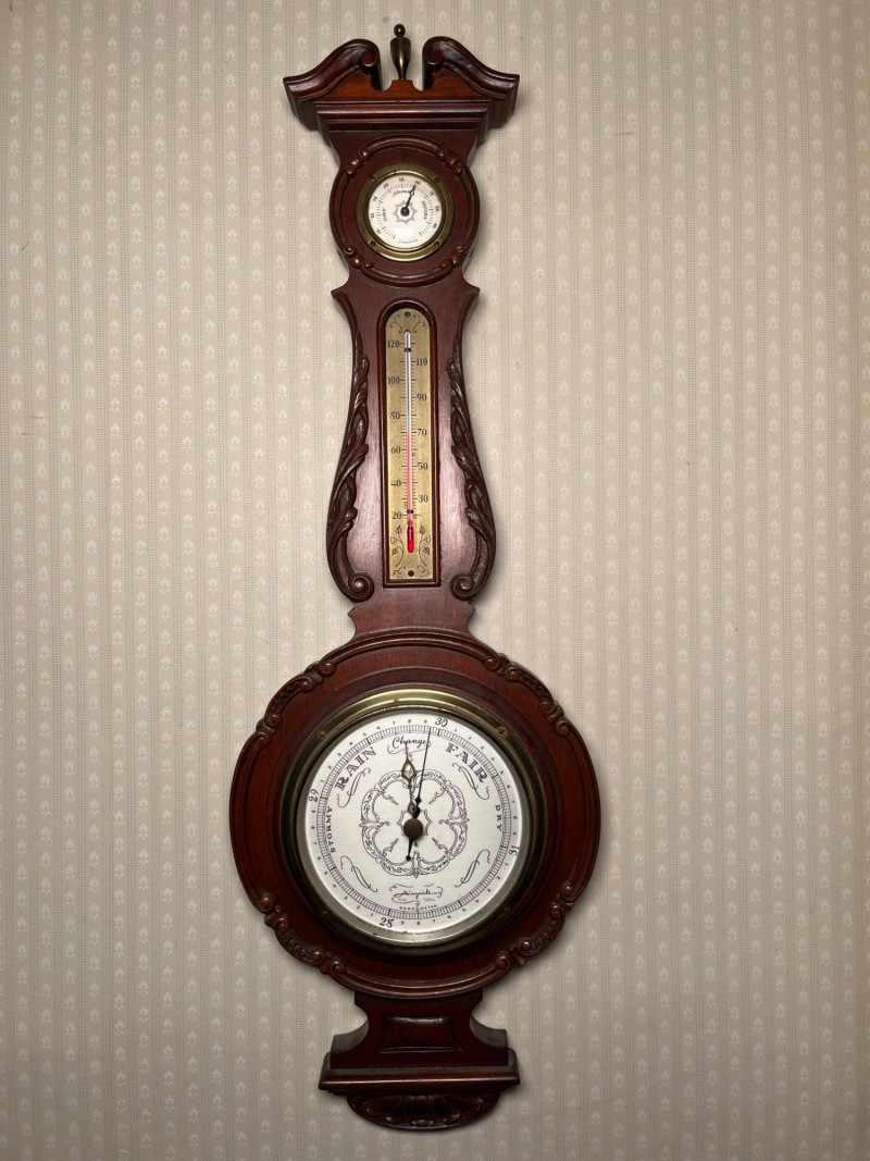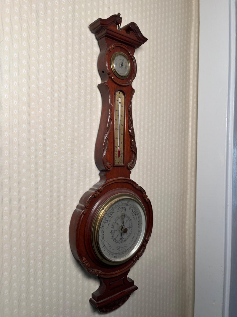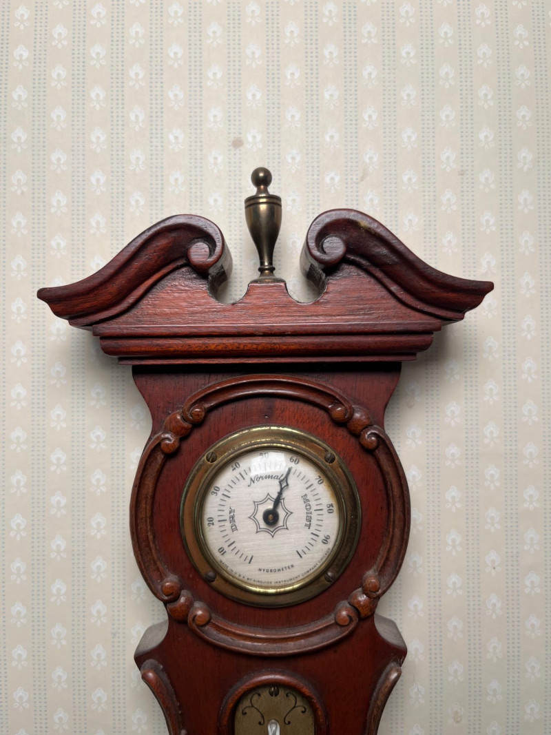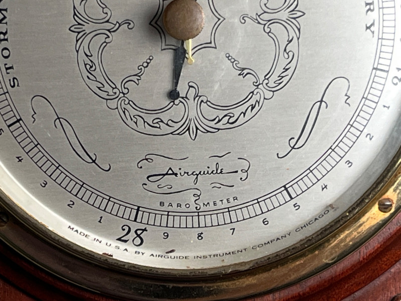 A classic Airguide barometer designed to monitor atmospheric pressure and help predict changing weather conditions. The dial is clean and easy to read, with clear indicators for rising, falling, and steady pressure. This style was commonly used in mid‑century homes, workshops, and studies for practical daily forecasting as well as decorative appeal. The piece presents in great vintage condition with age‑appropriate surface wear. The finish, dial, and housing all show well for its age, making it suitable for display or addition to a collection of vintage weather instruments. Condition Notes: