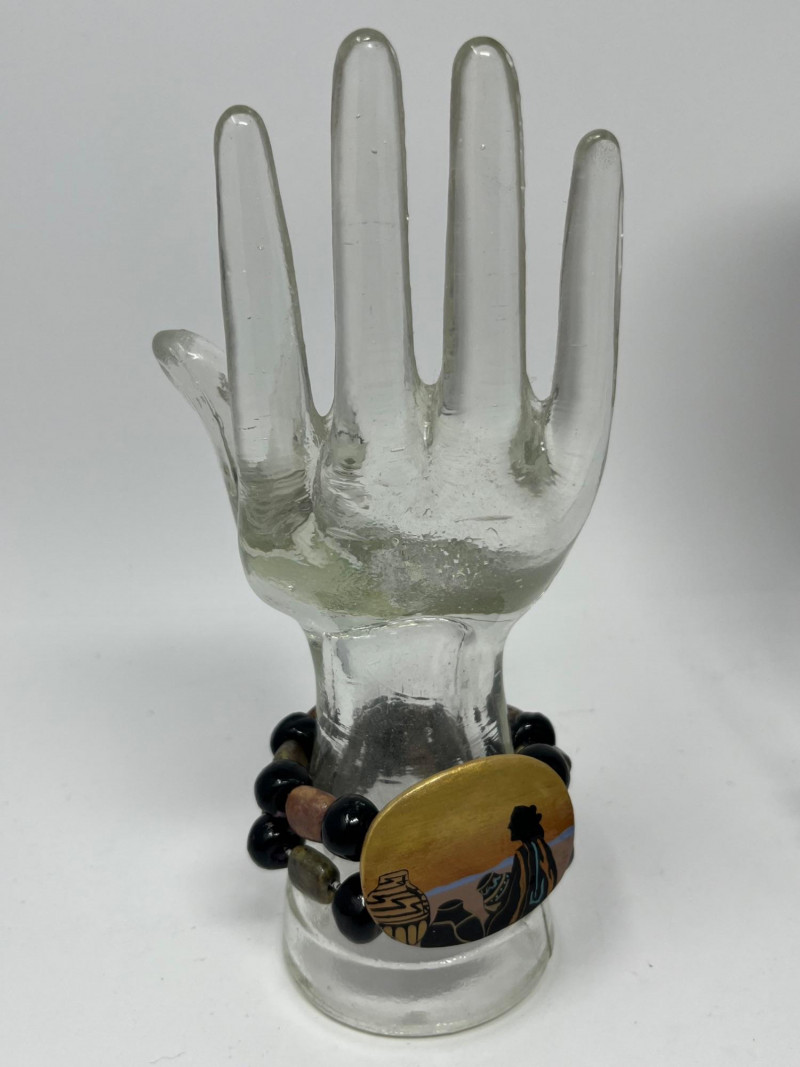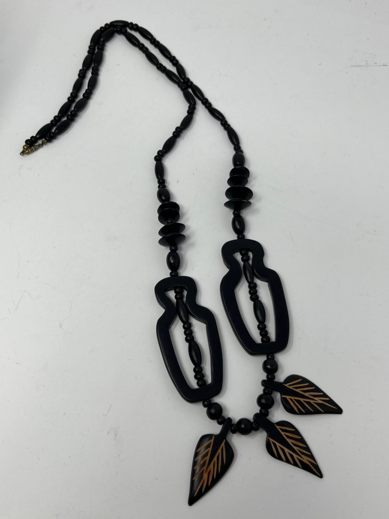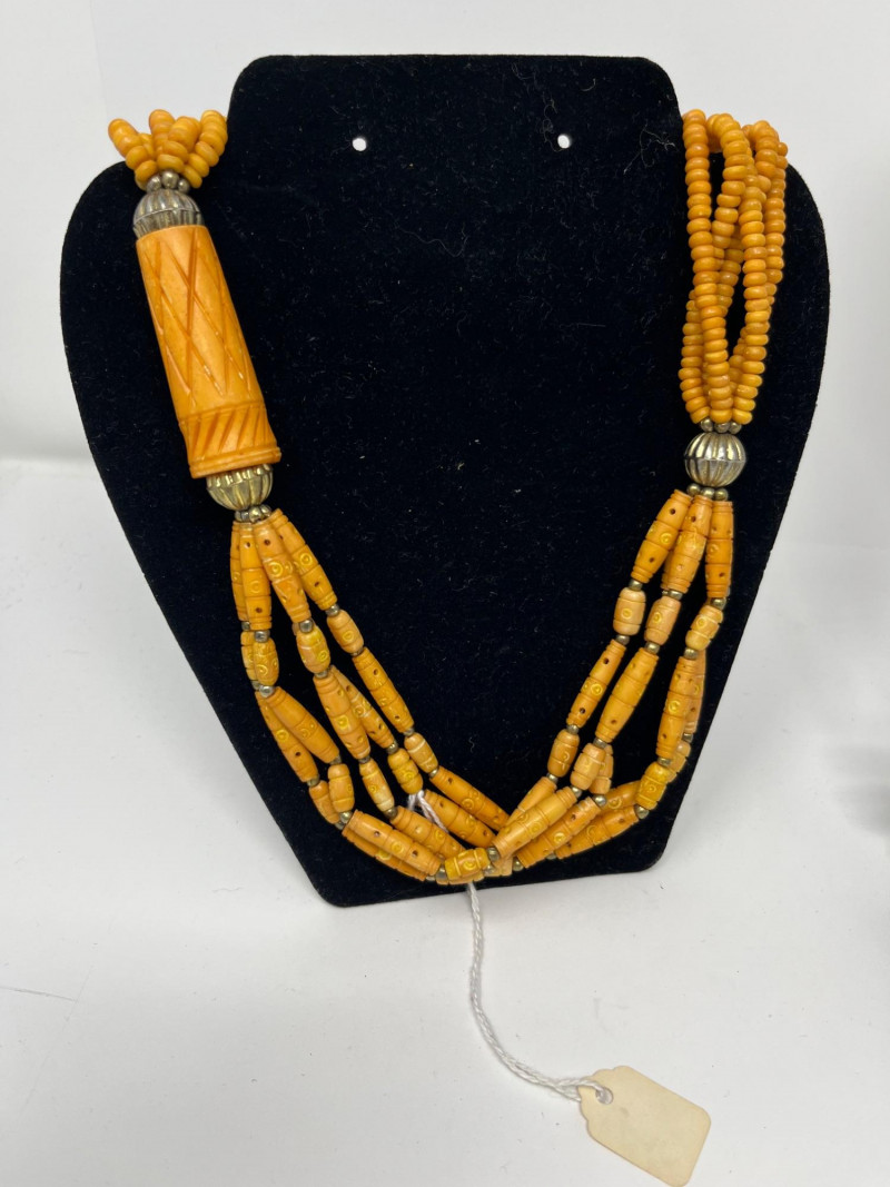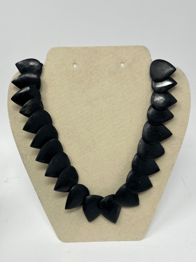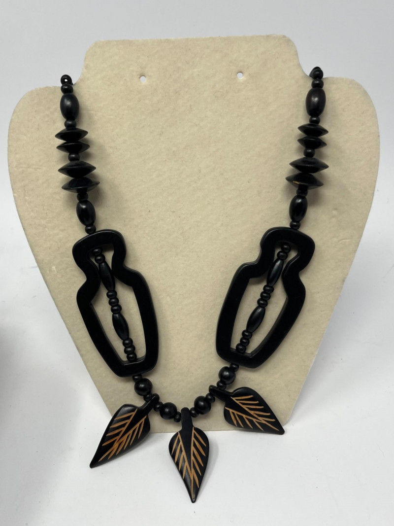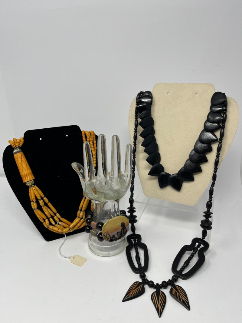 Group of four pieces including three necklaces and one bracelet in a cohesive Native American–themed style. The necklaces feature bold black resin beads, carved and geometric forms, and warm amber‑tone strands reminiscent of traditional color palettes and craft influences. The coordinating bracelet complements the set with similar materials and visual weight. Necklaces measure approximately 20–38 inches in total length. Bracelet hand display shown in photos is not included. Condition varies with light surface wear consistent with age and handling. Sold as shown.