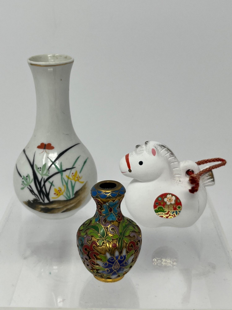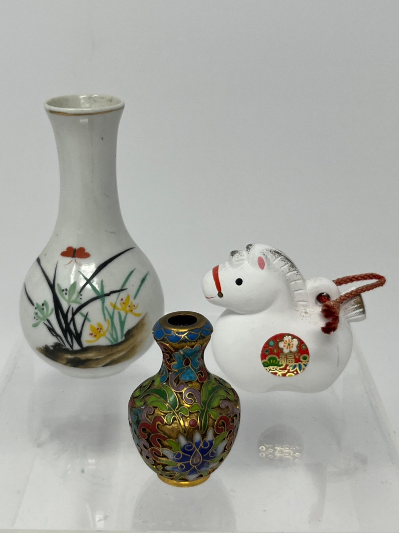 Lot # 80 - Small Asian Decor Lot – Cloisonné Vase, China Floral Vase, Horse Bell
